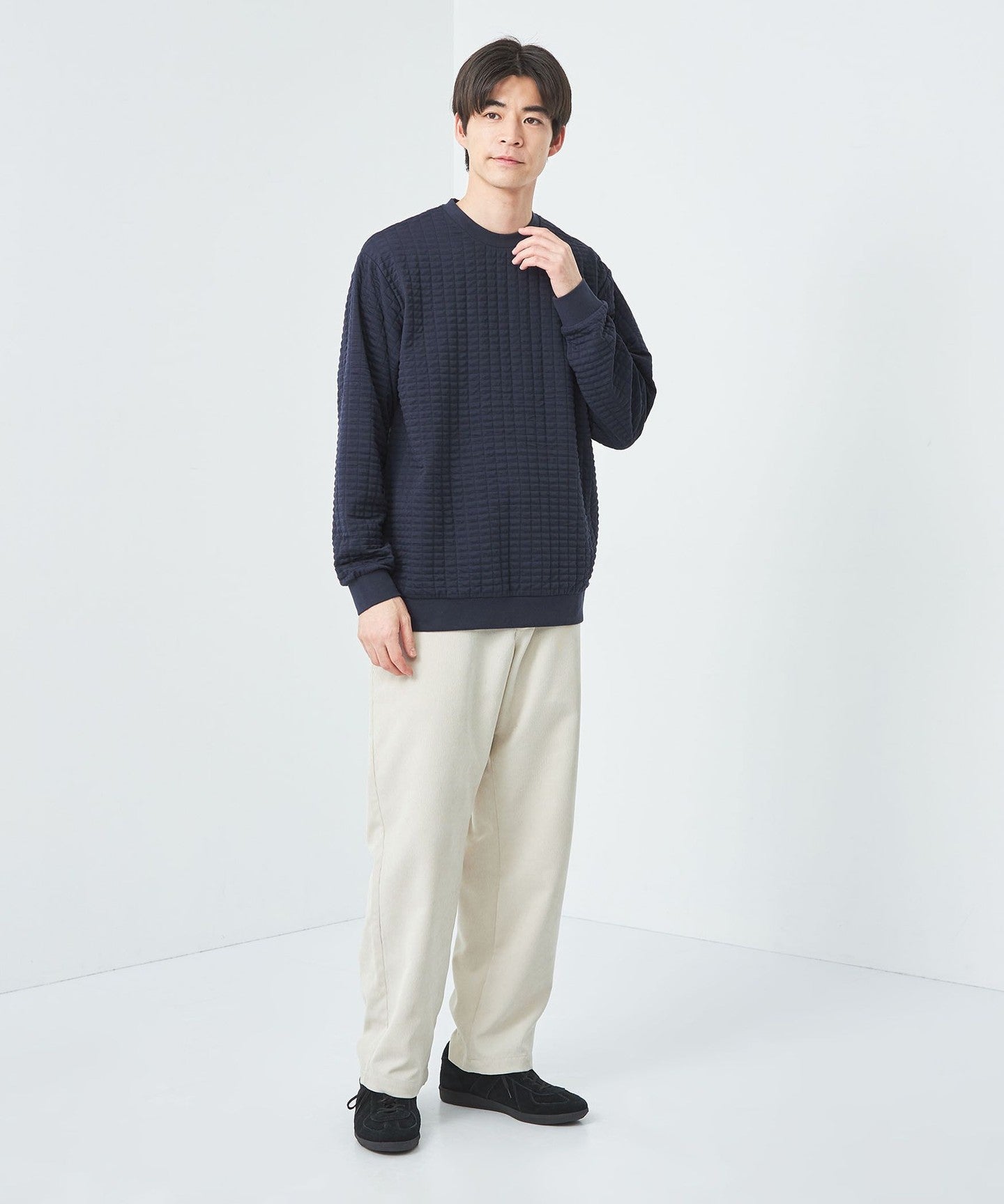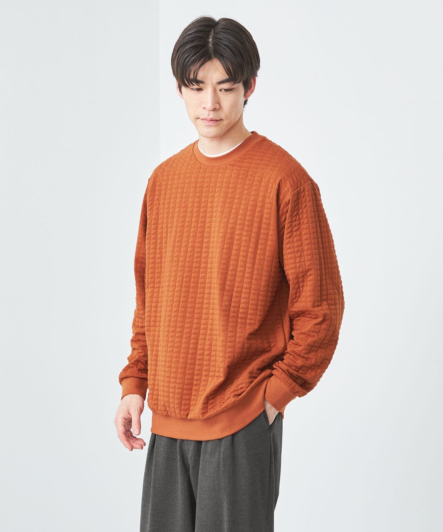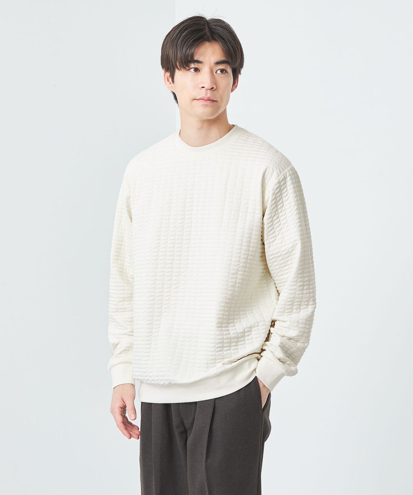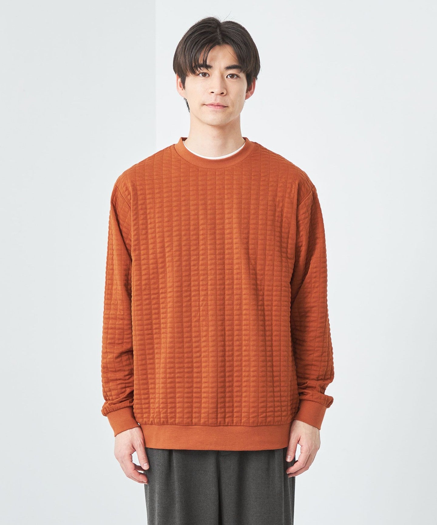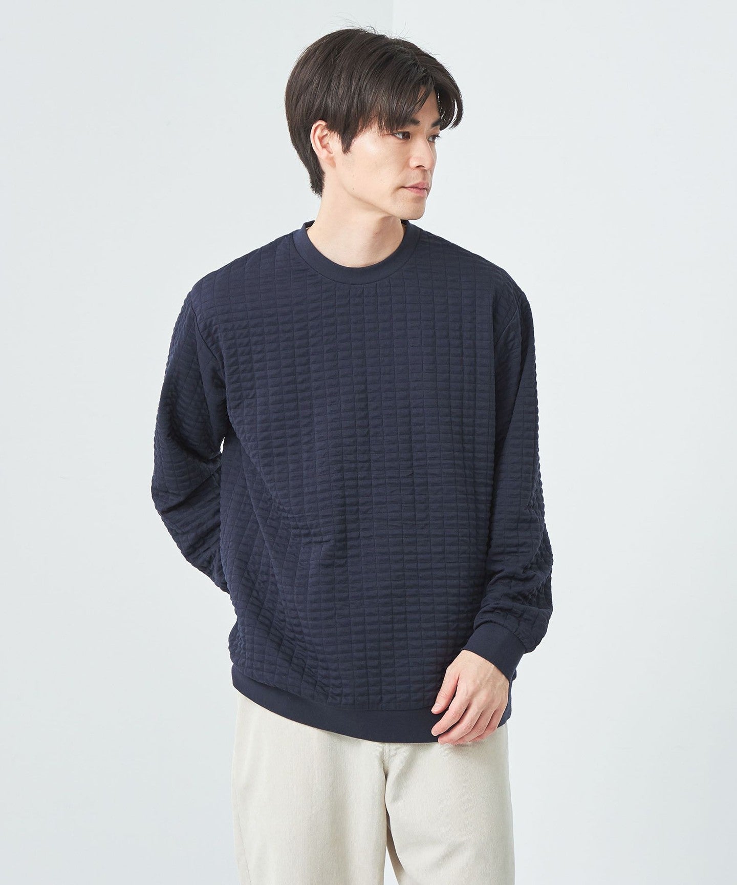 This is a crew neck cut-and-sew with a moderately loose silhouette.