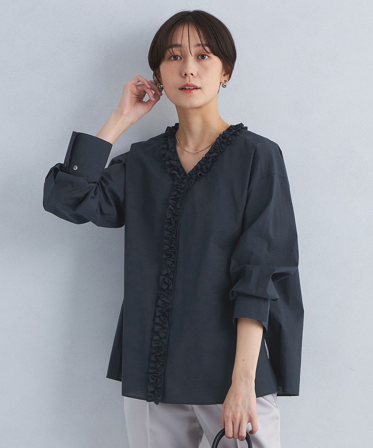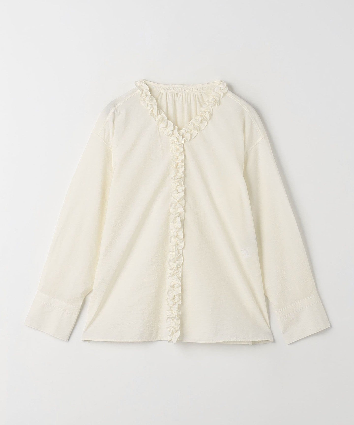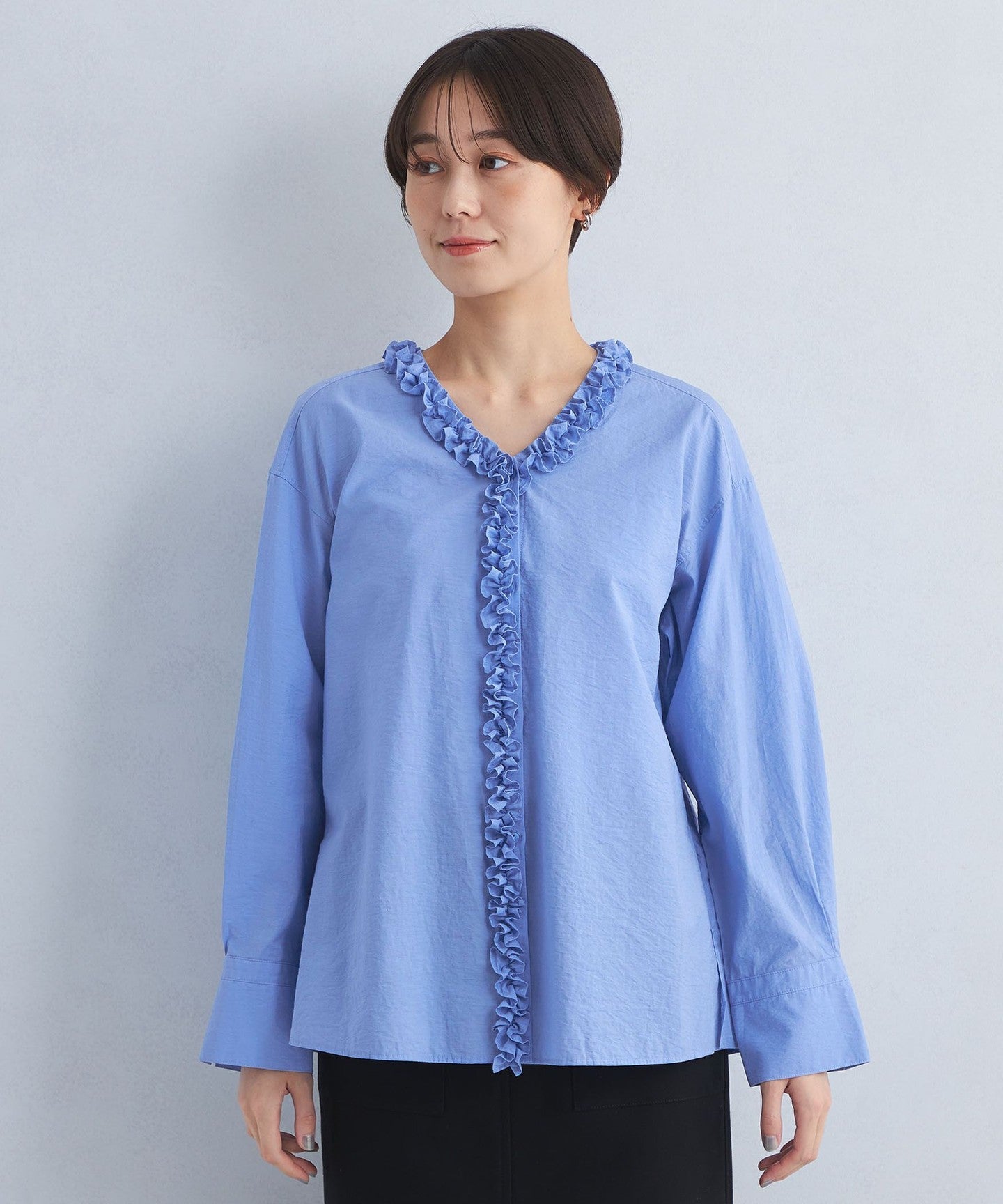 A one-piece blouse with an eye-catching frill design that looks great on its own!