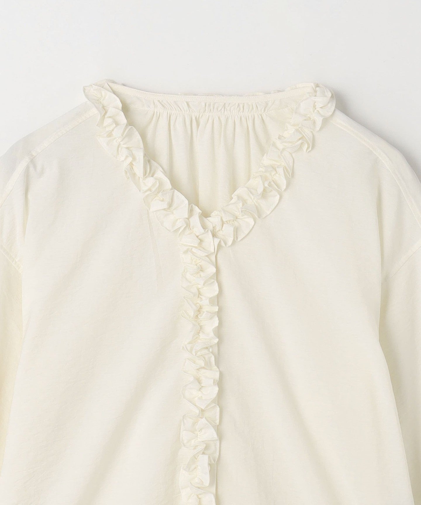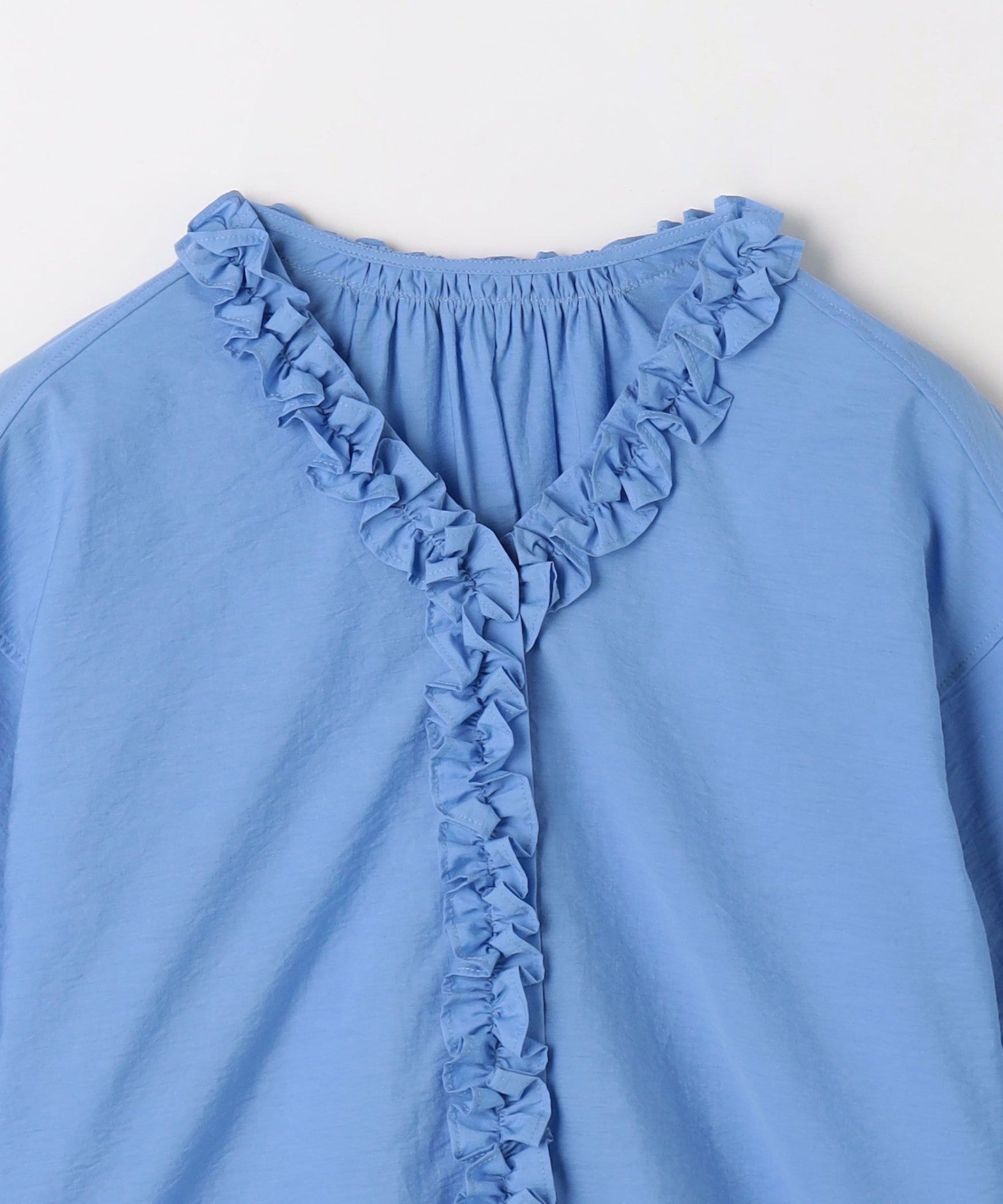 A blouse with eye-catching ruffles on the front and neck.