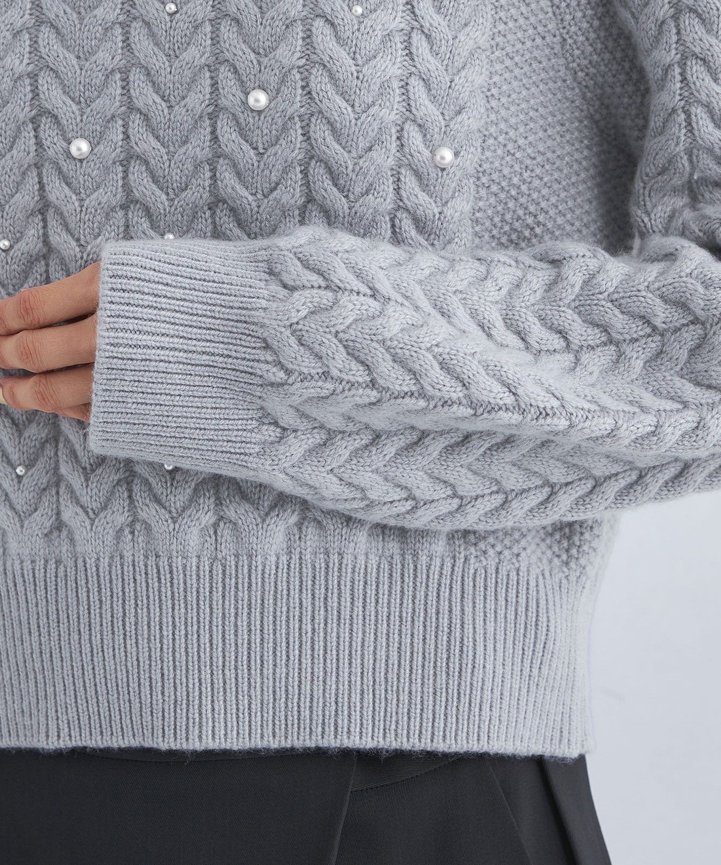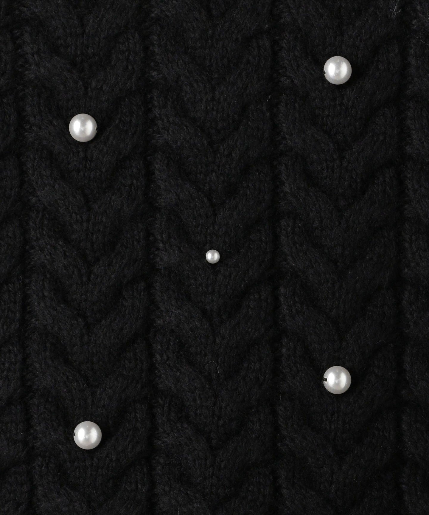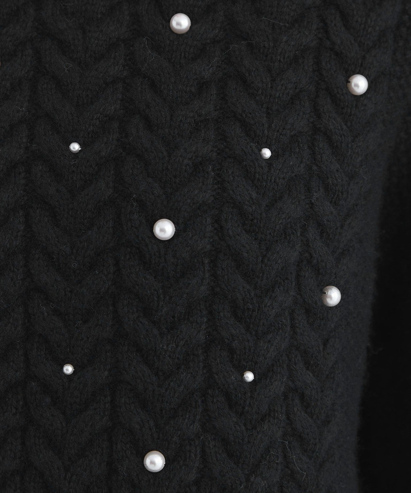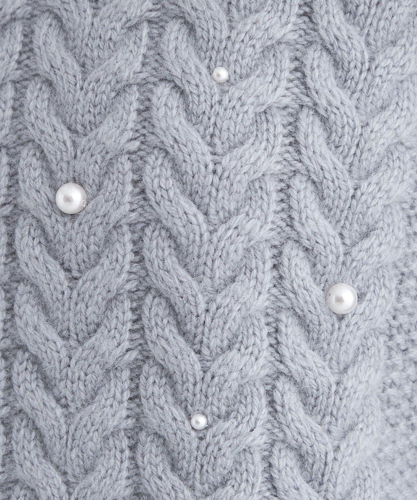 This eye-catching piece features cable knit sweater with fake pearls scattered throughout.