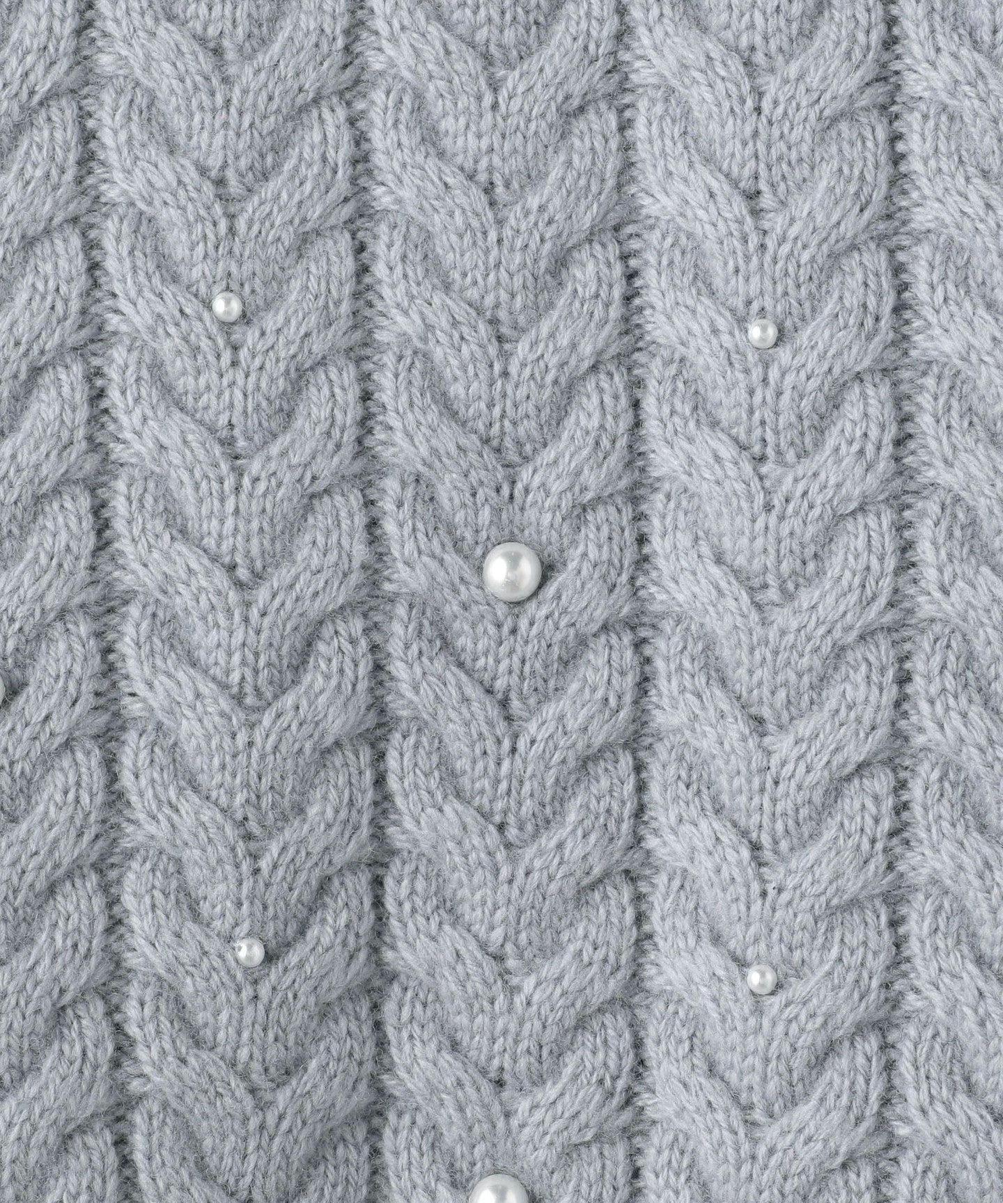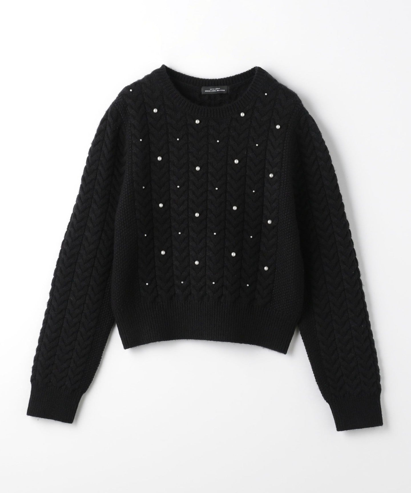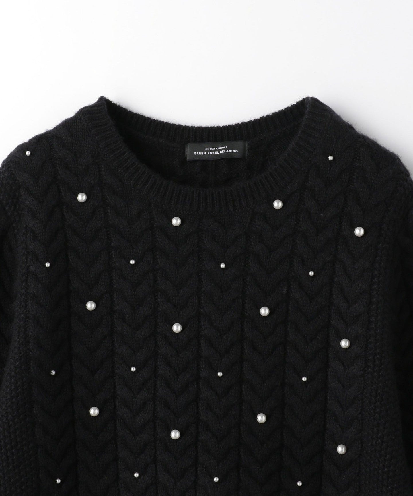 This eye-catching piece features cable knit sweater with fake pearls scattered throughout.
