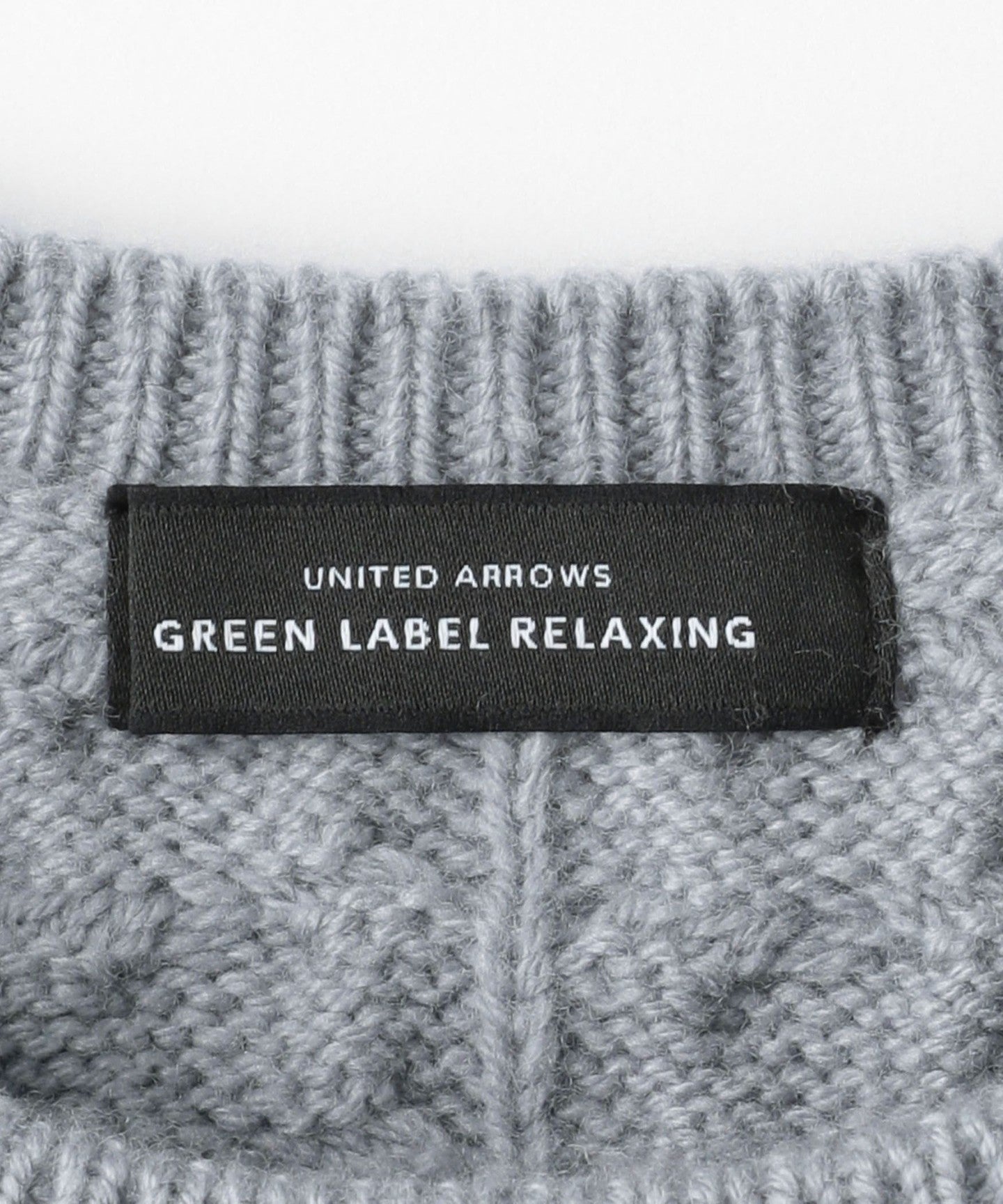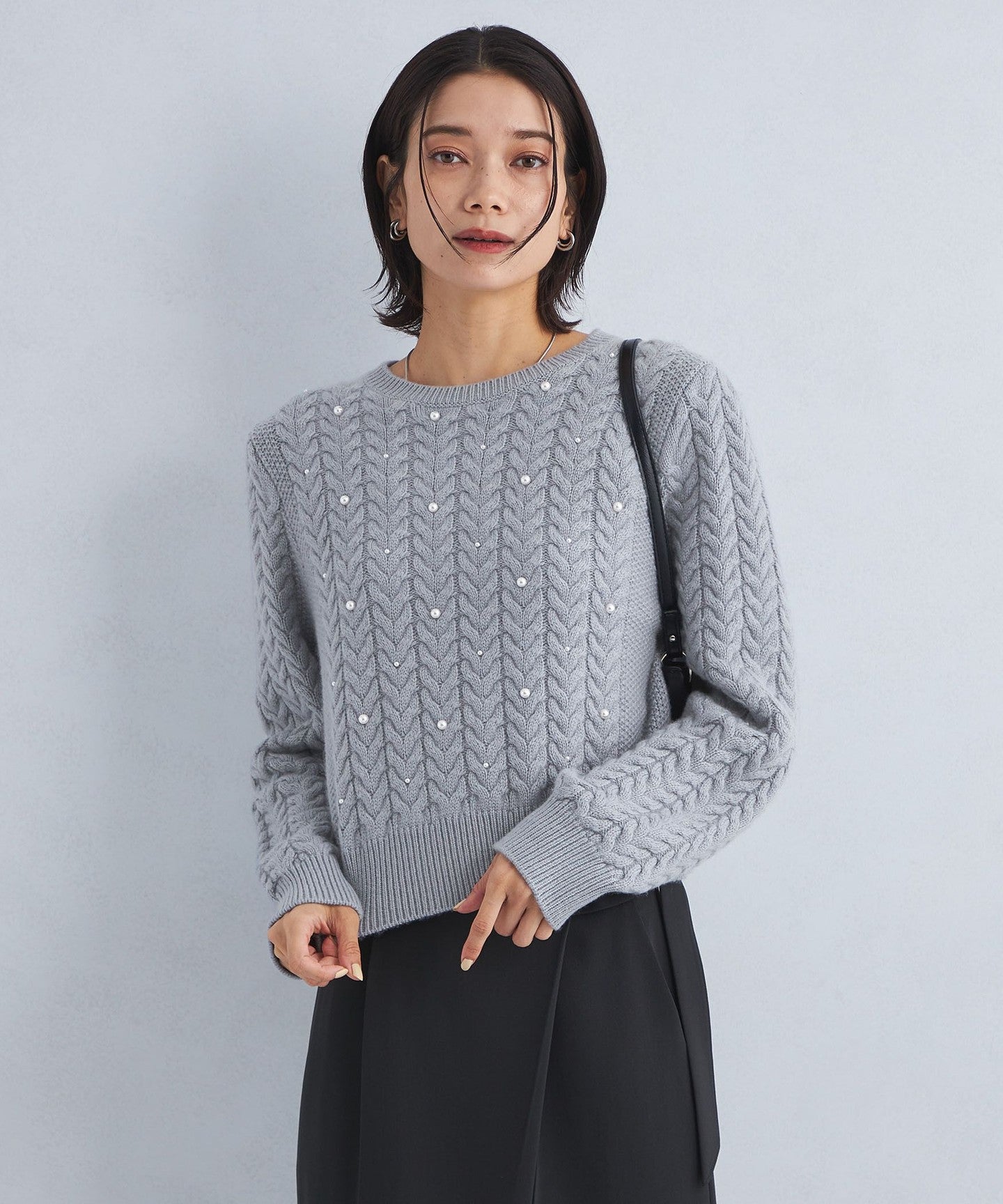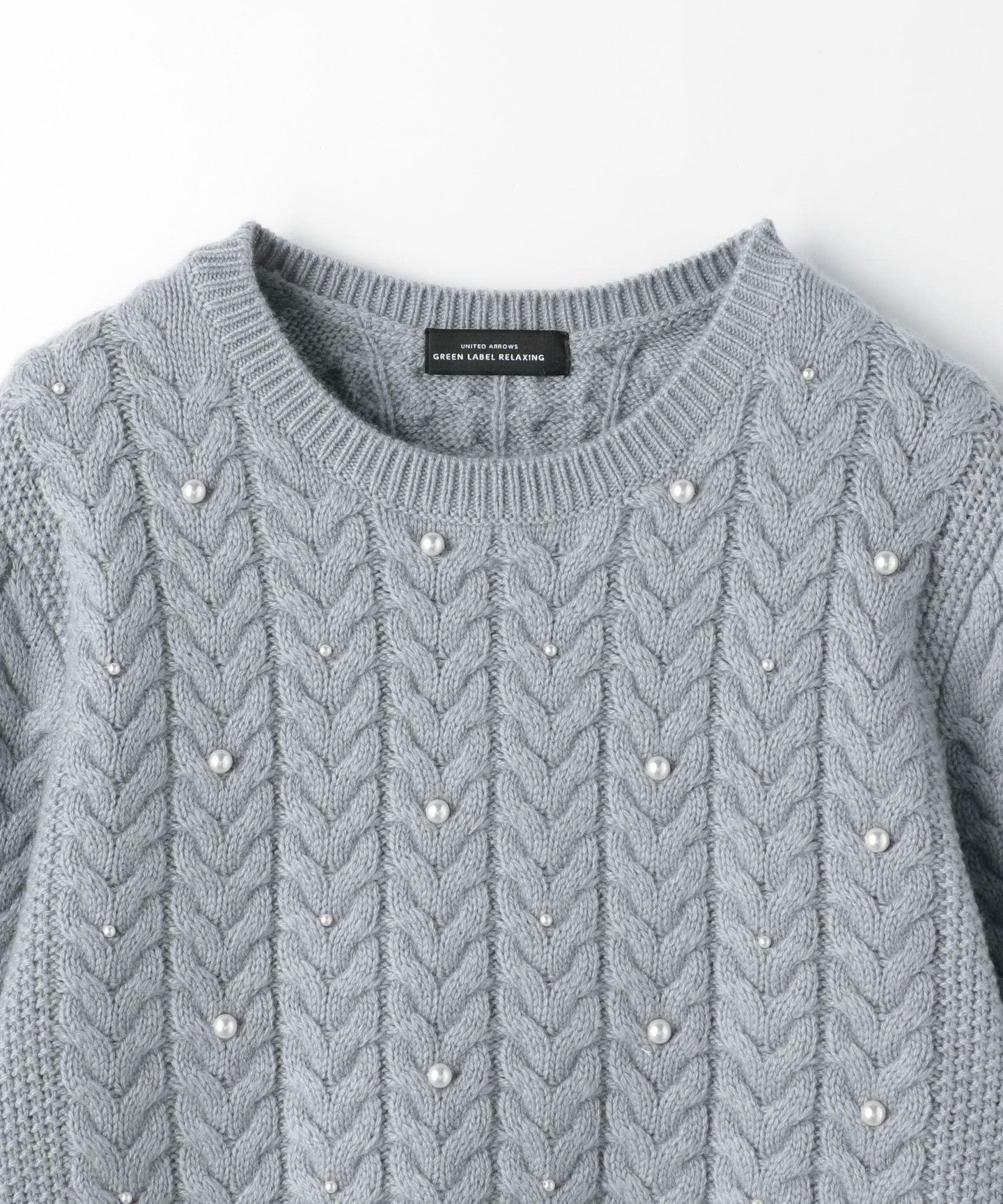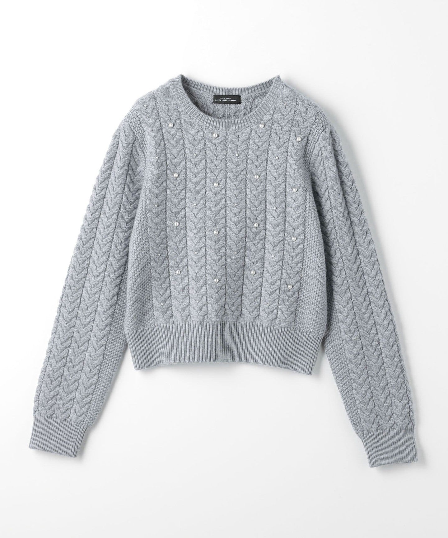 This eye-catching piece features cable knit sweater with fake pearls scattered throughout.
