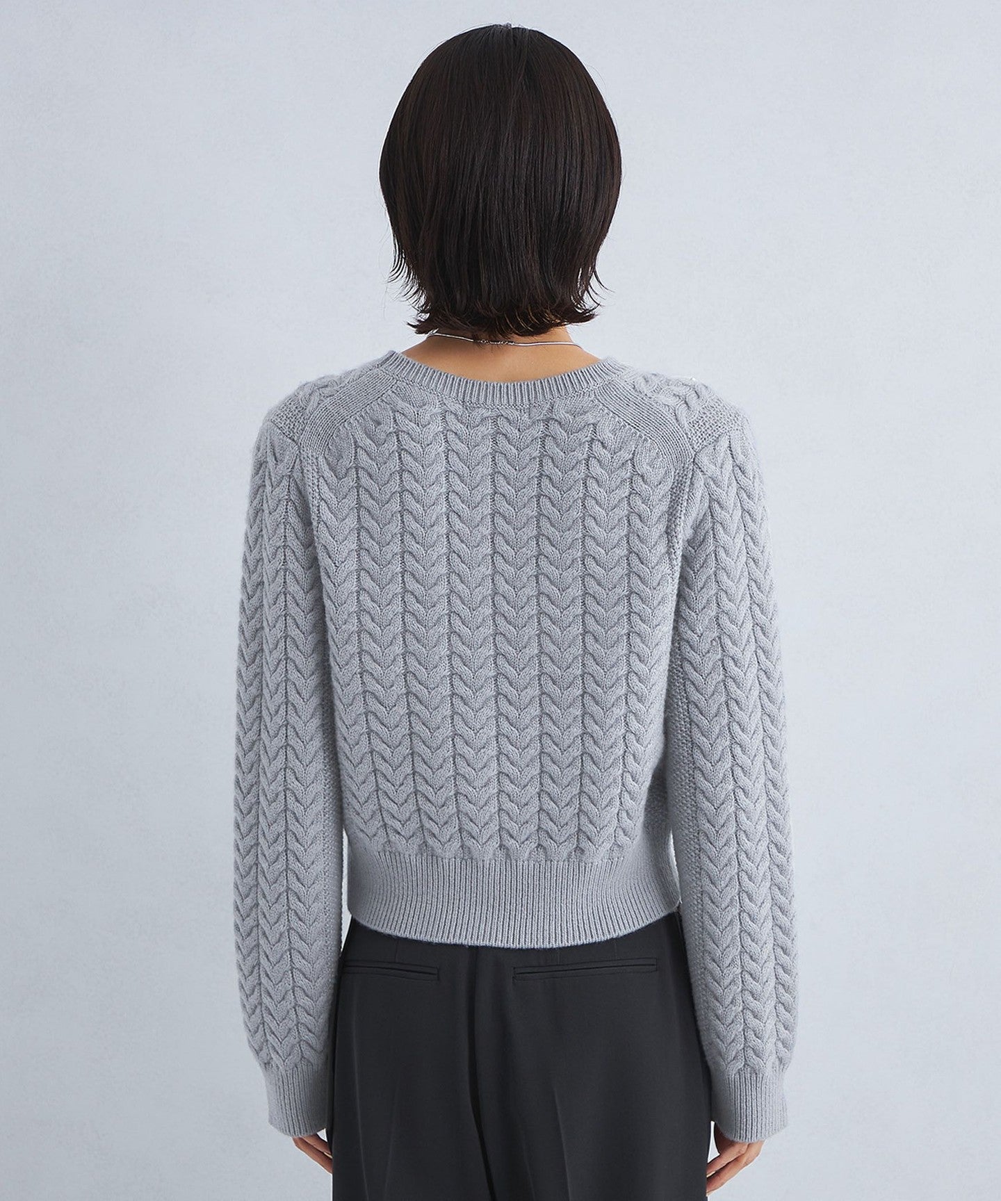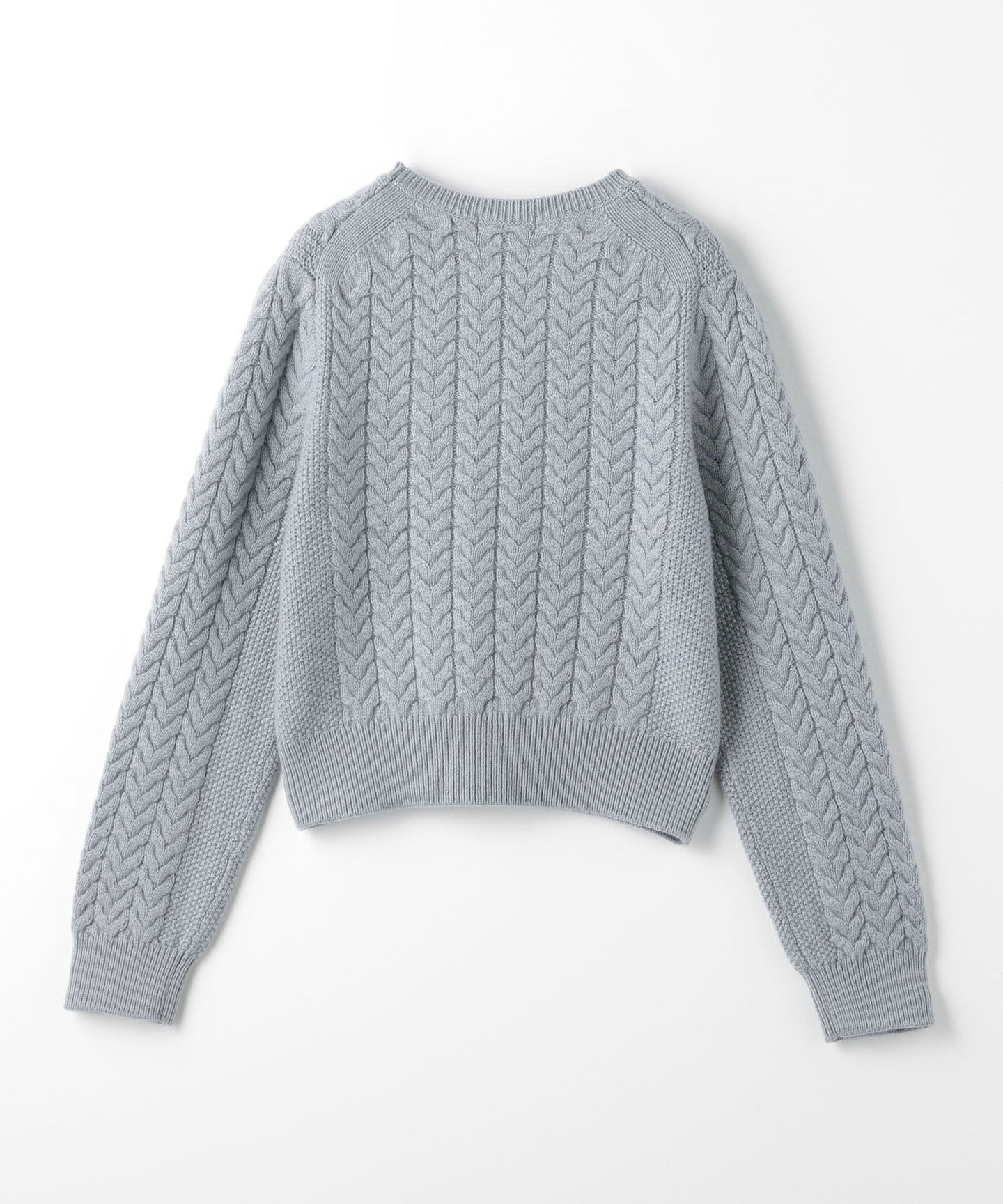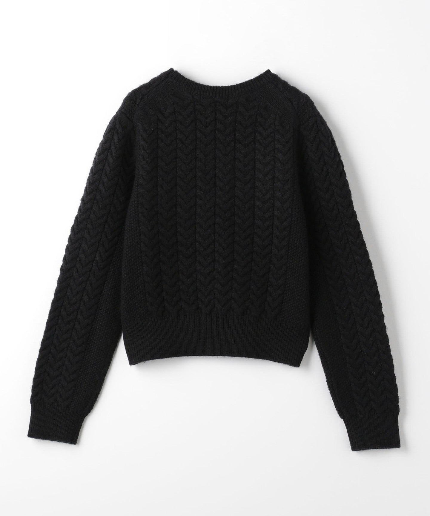 This knit features a fake pearl and cable knit design for a sophisticated and feminine look.