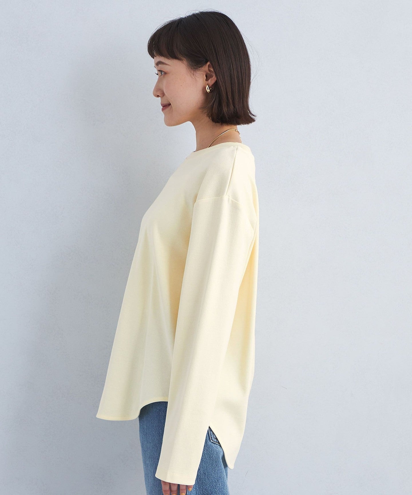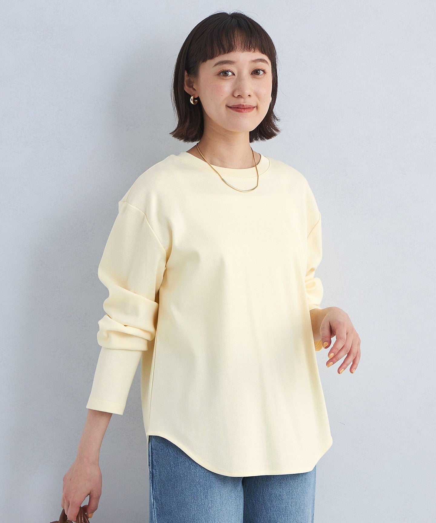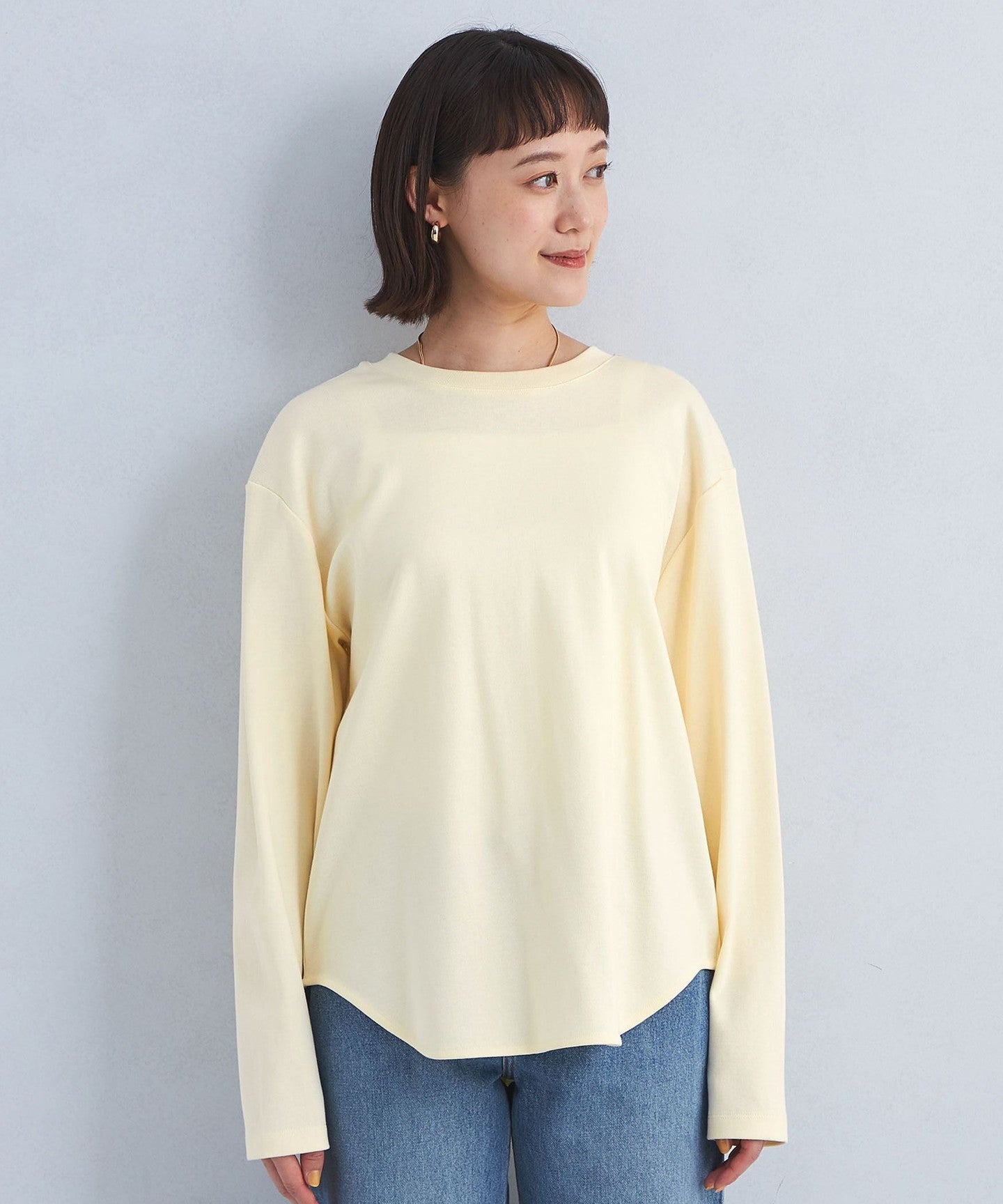This pullover has a sophisticated round hem design that makes it easy to wear on its own.