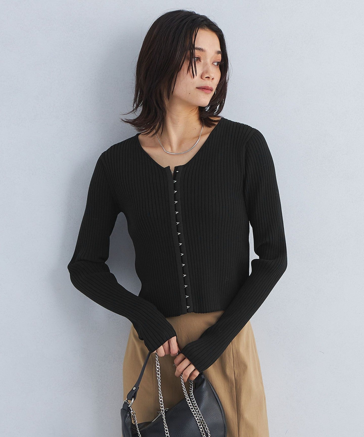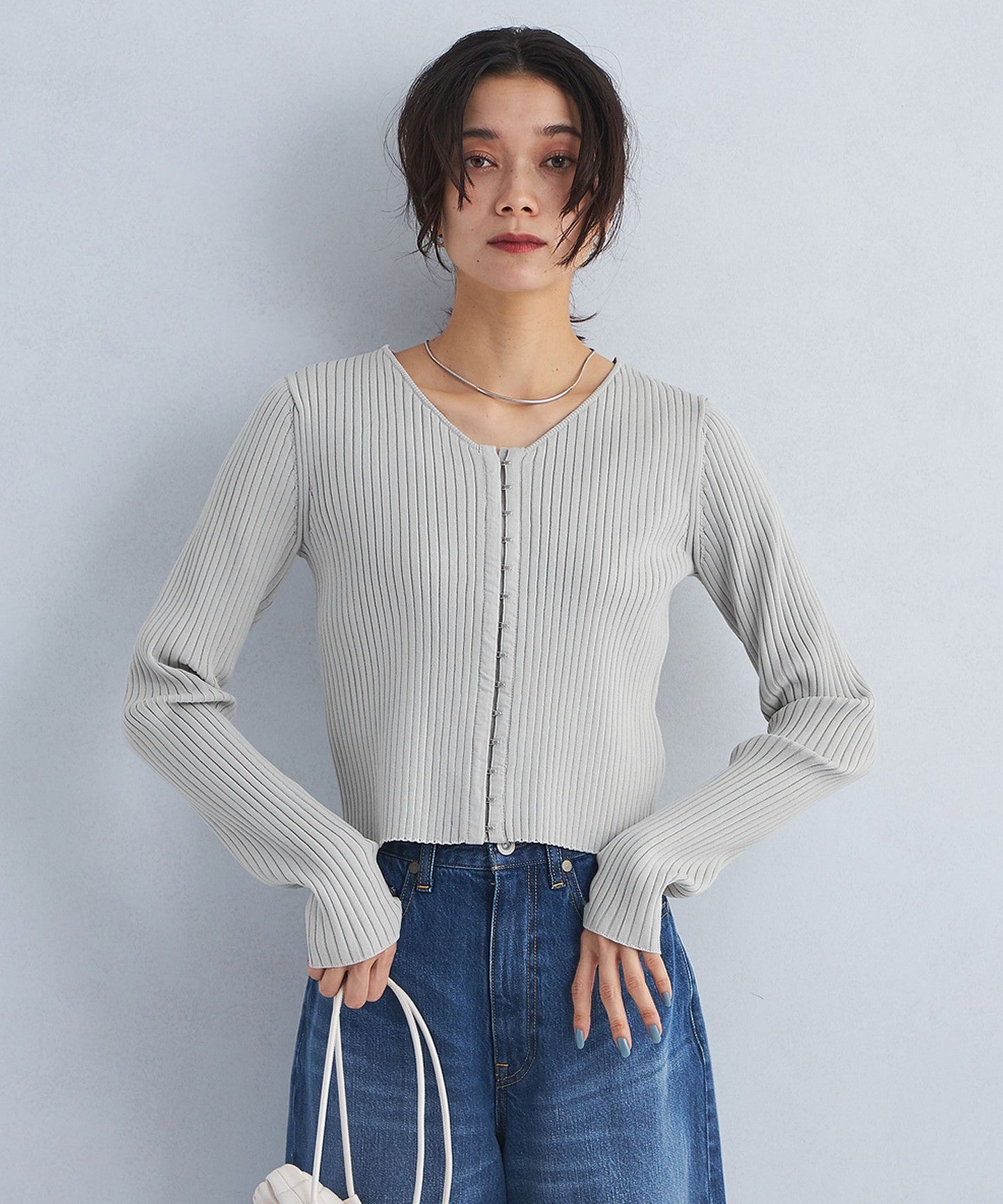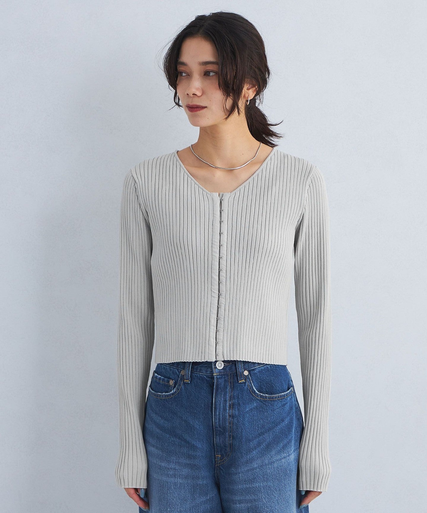 A pullover knit with a clean V-neck that makes your neck look beautiful.