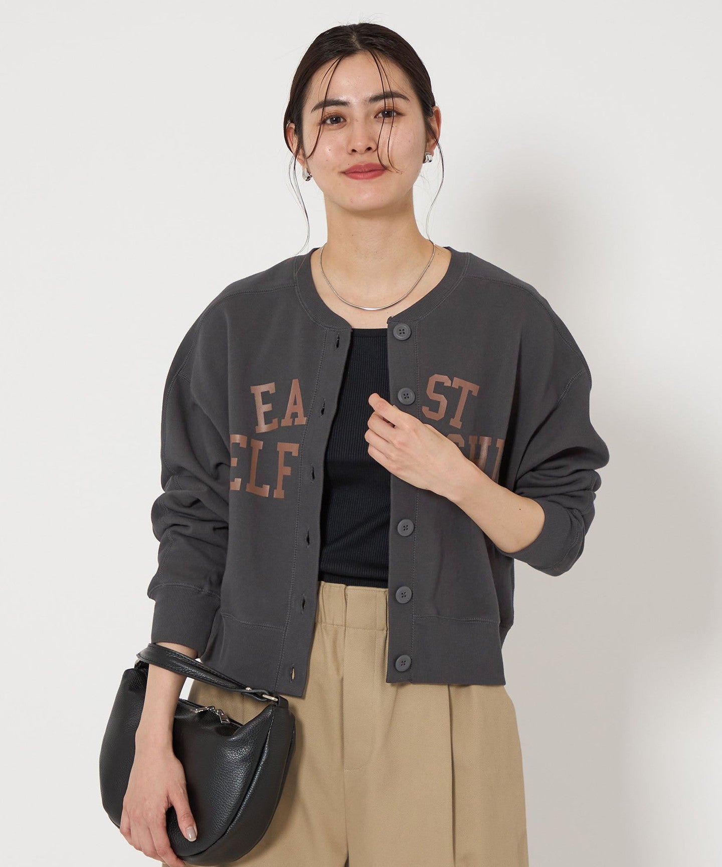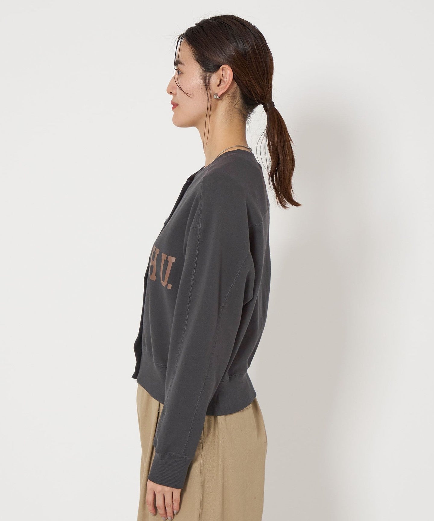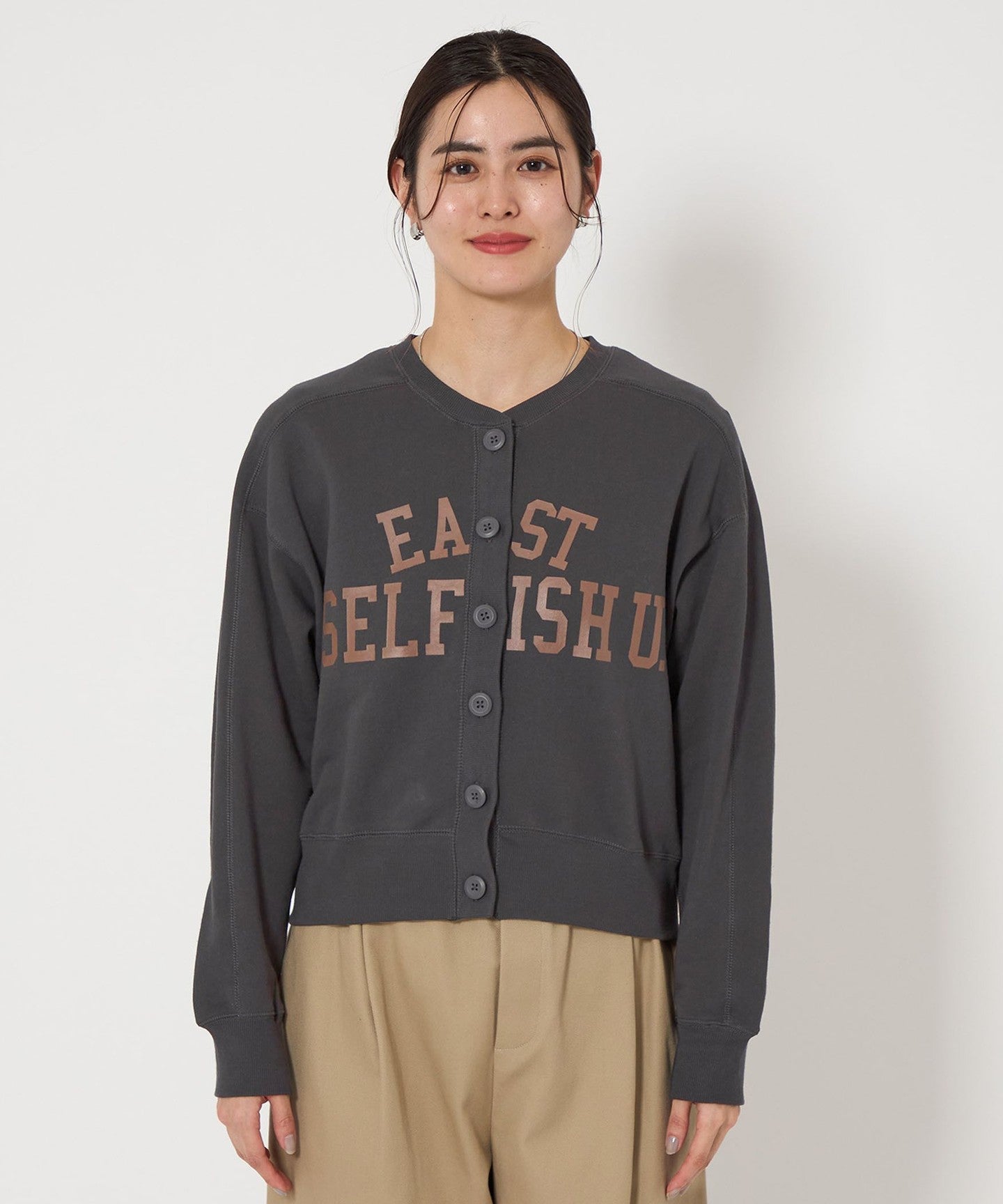 The key feature of this sweatshirt cardigan is its moderately loose sizing.