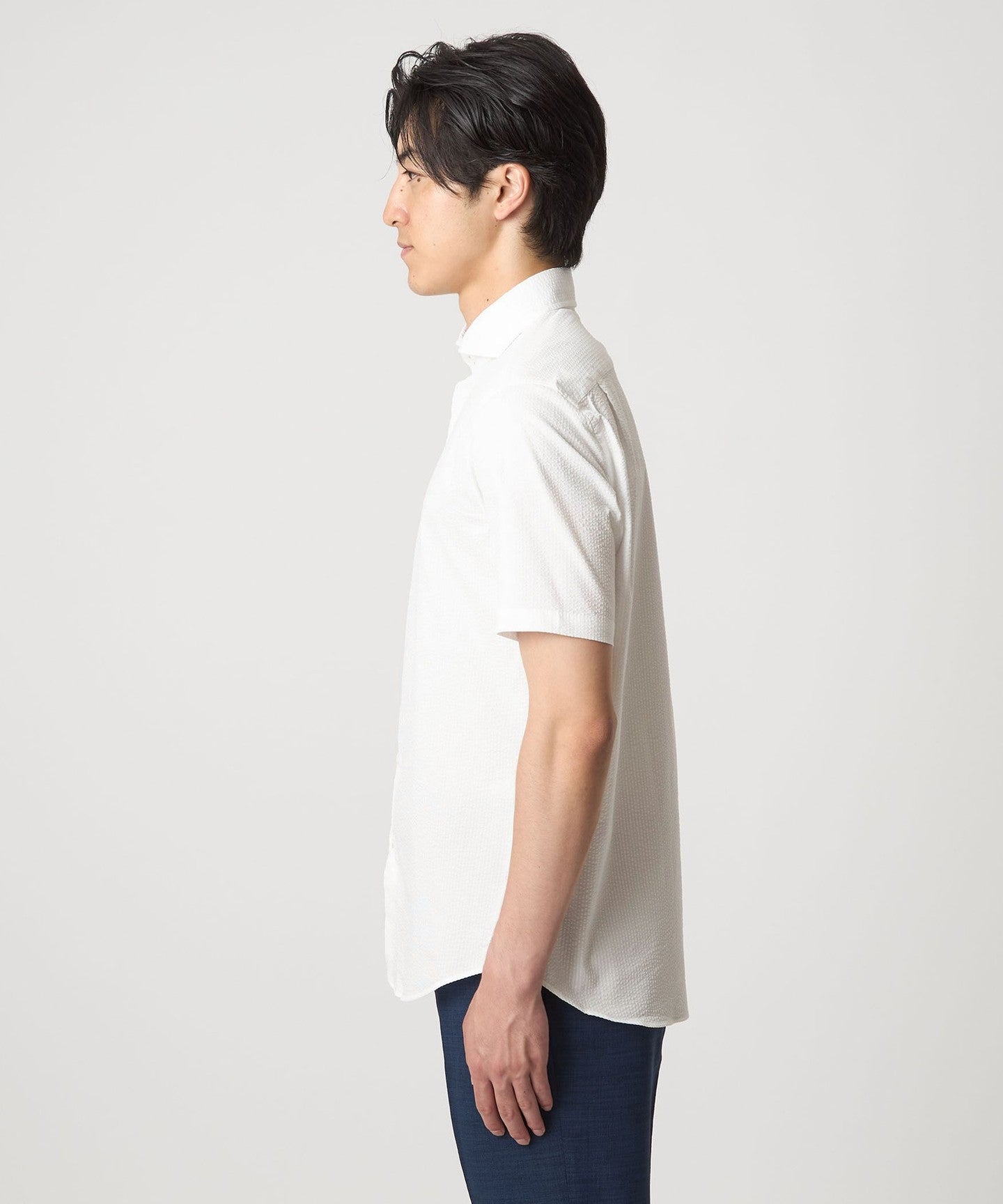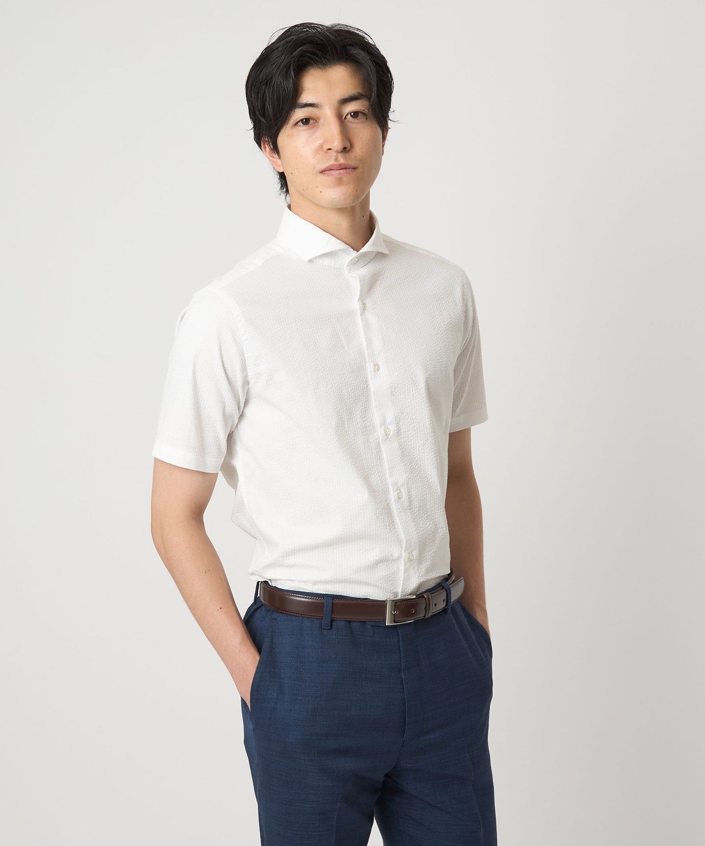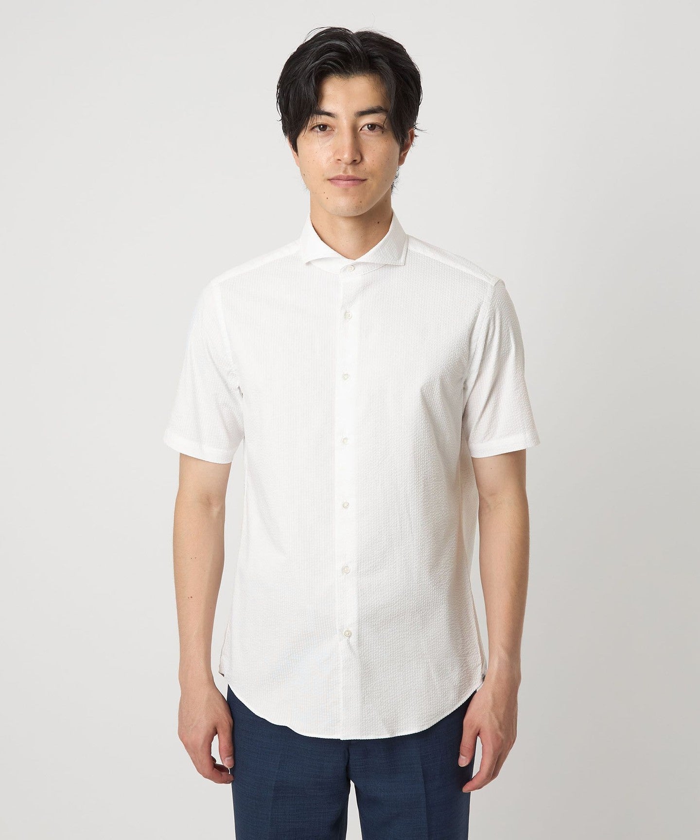 A regular-body business casual shirt made from soccer fabric that is comfortable even in the summer.