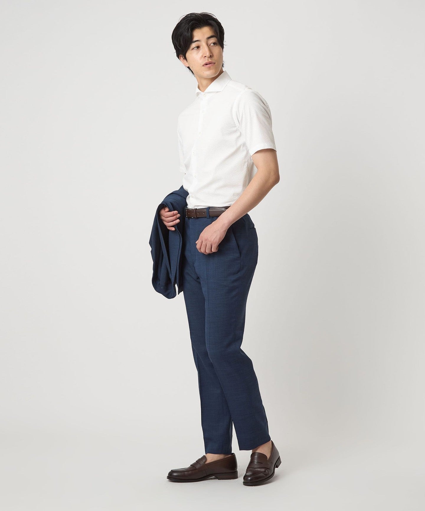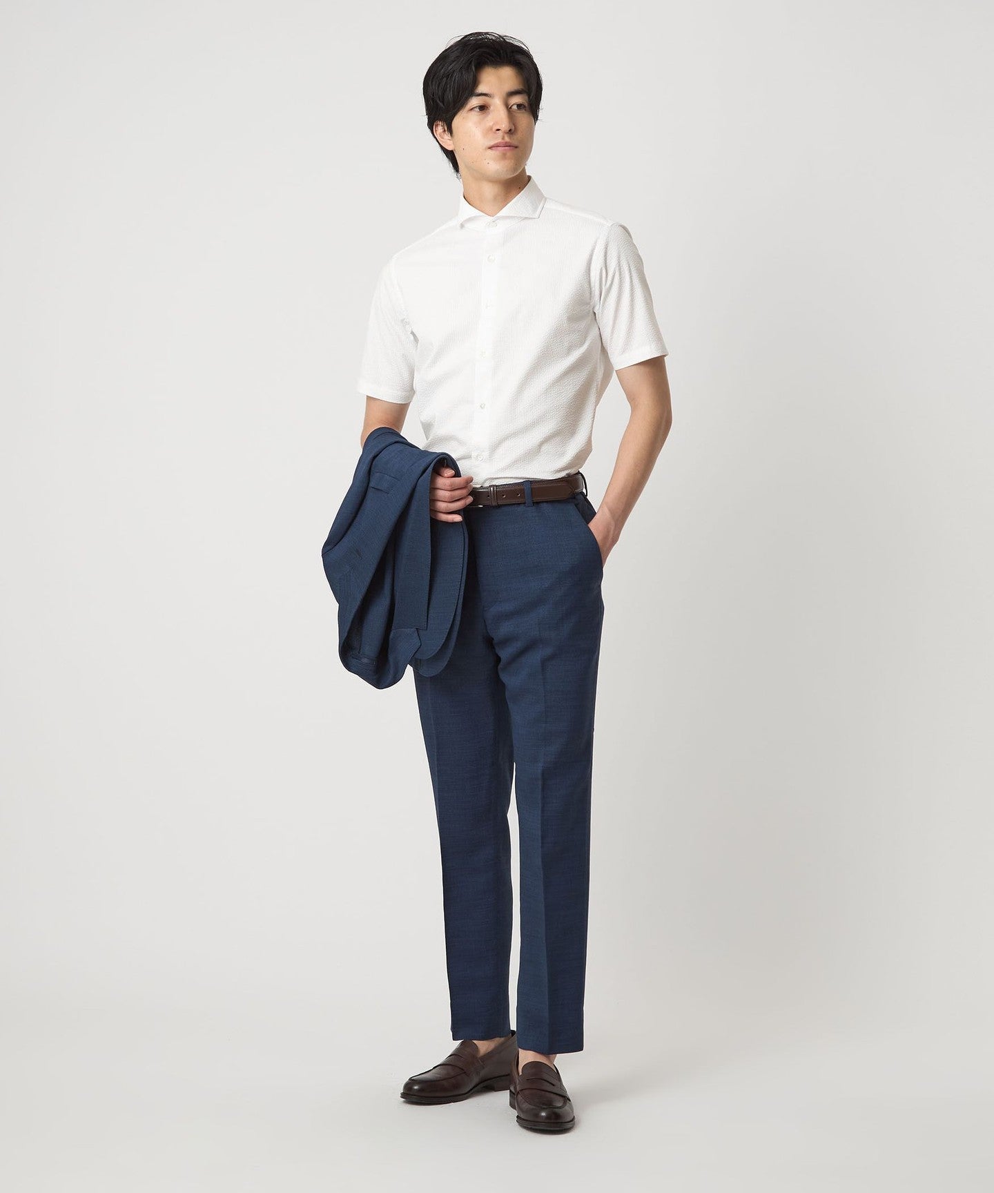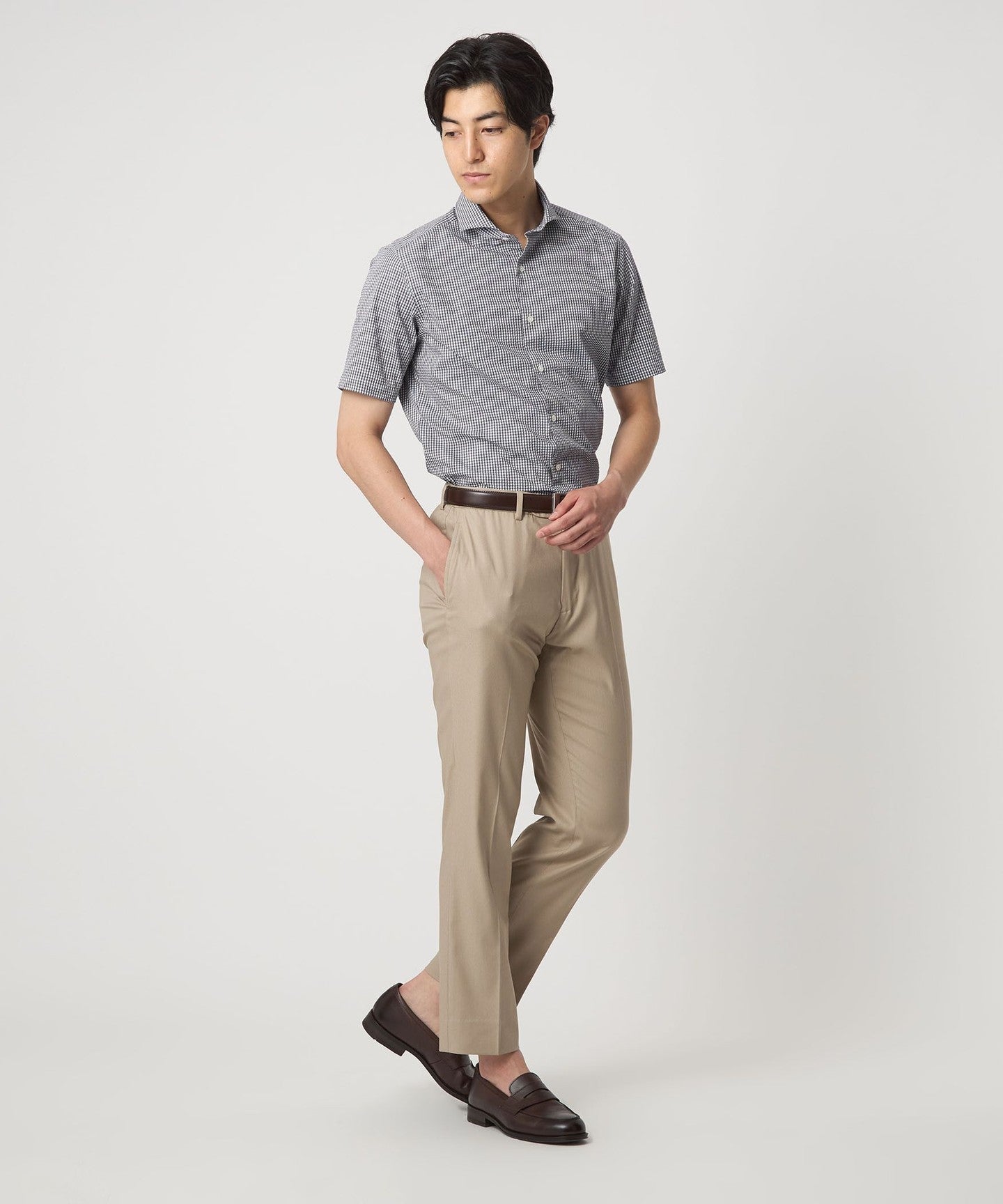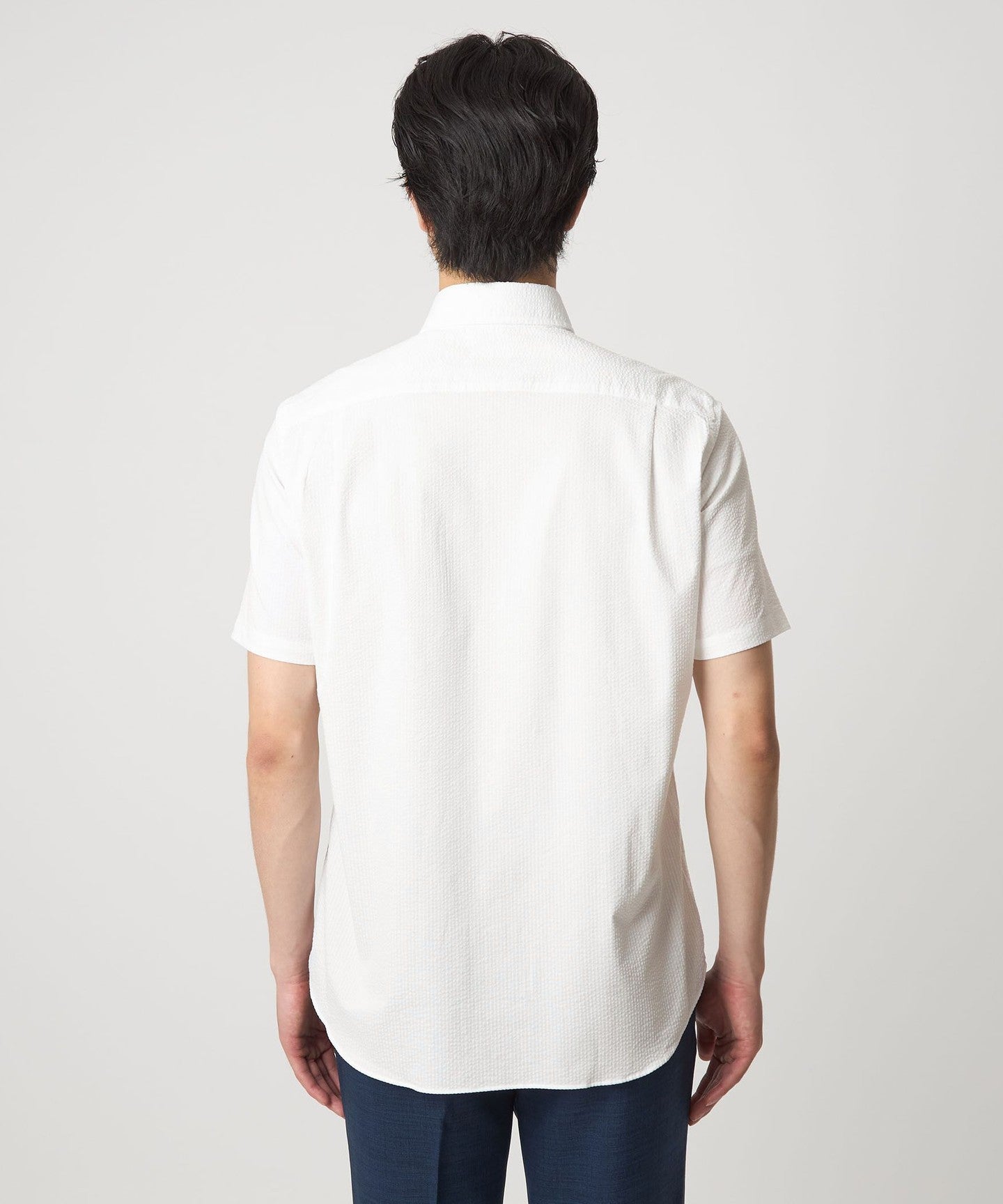 A regular-body business casual shirt made from soccer fabric that is comfortable even in the summer.