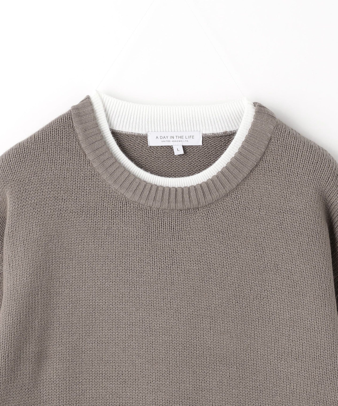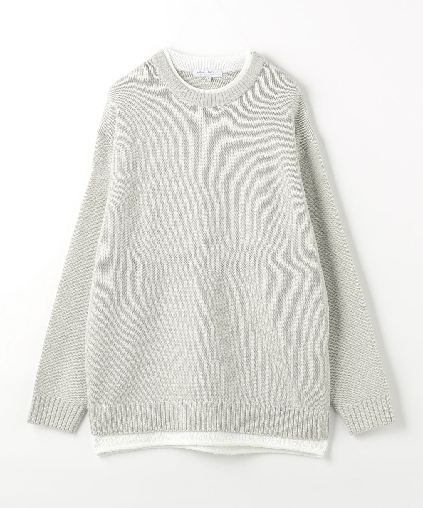 A top with a fake design that allows you to enjoy the classic, neat layered style of a T-shirt and knit top.