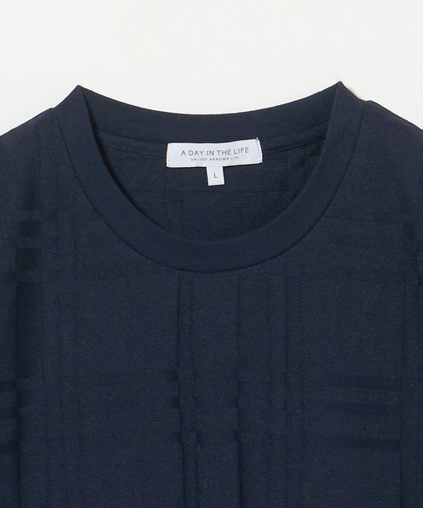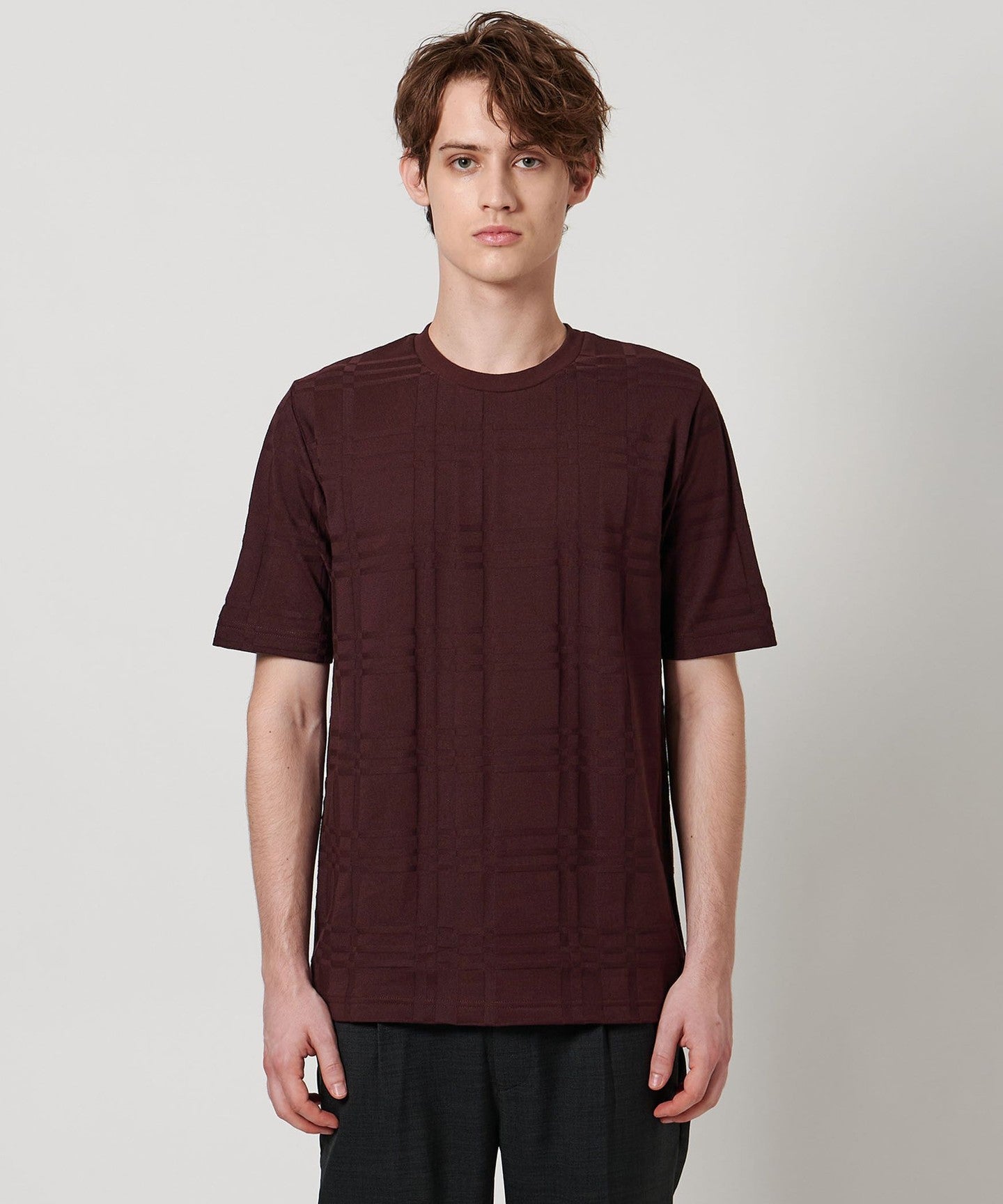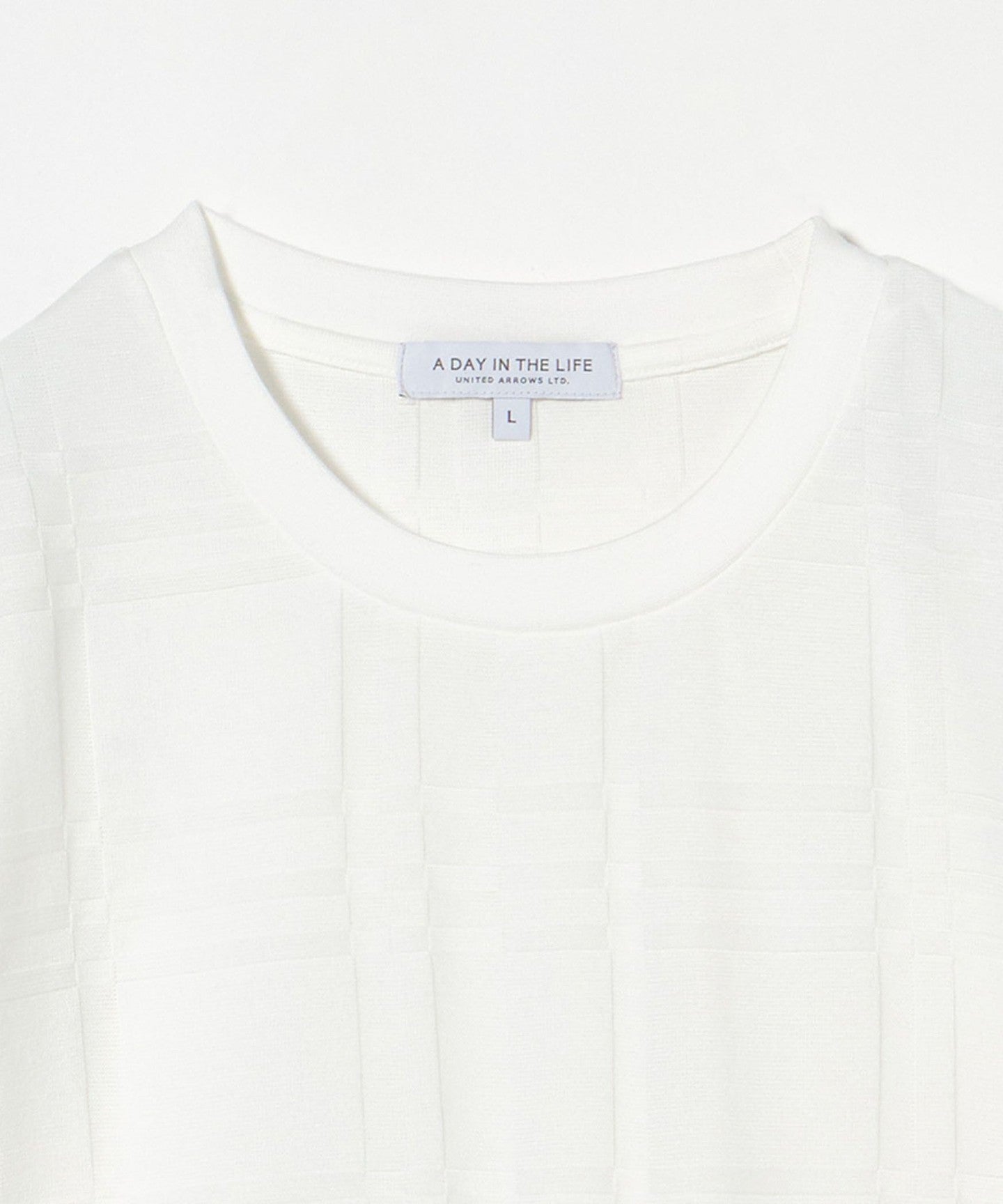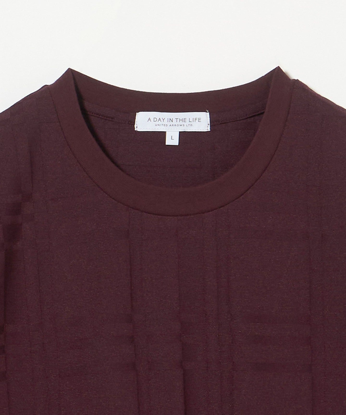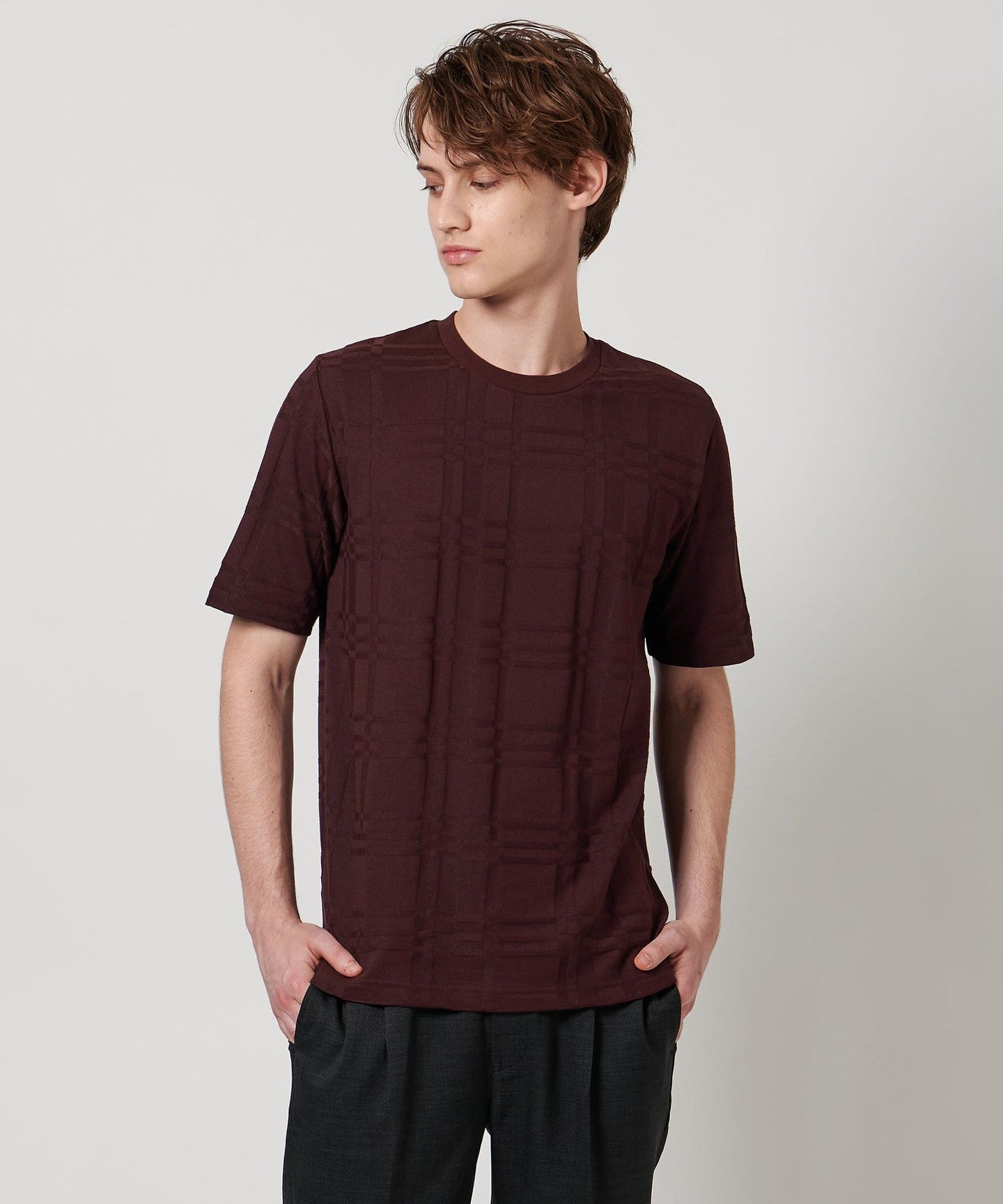 A cut-and-sew top with a subtle check pattern created by the unevenness of the knit fabric.