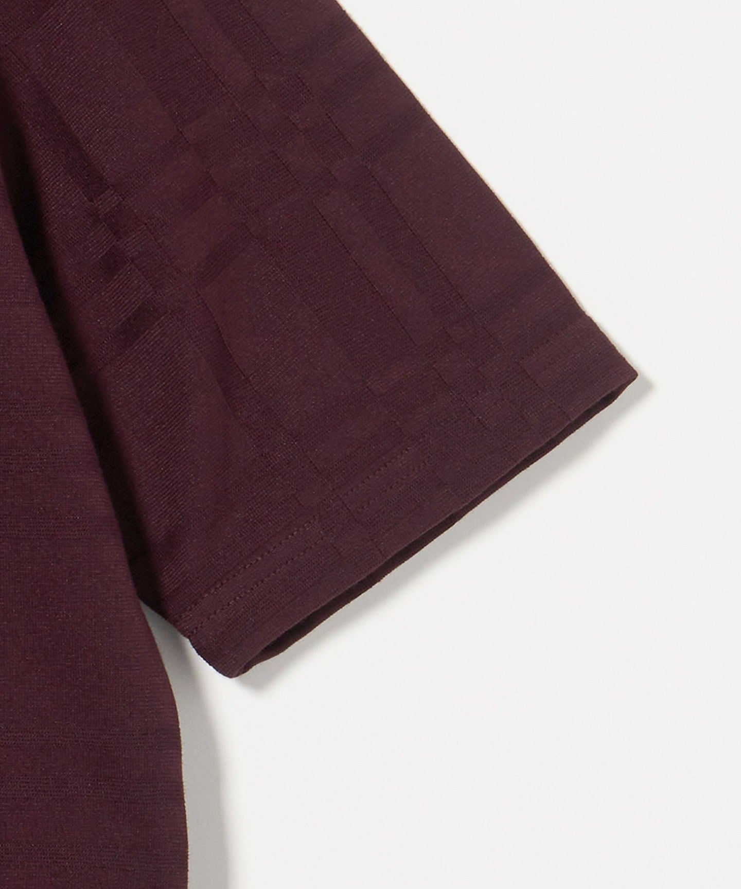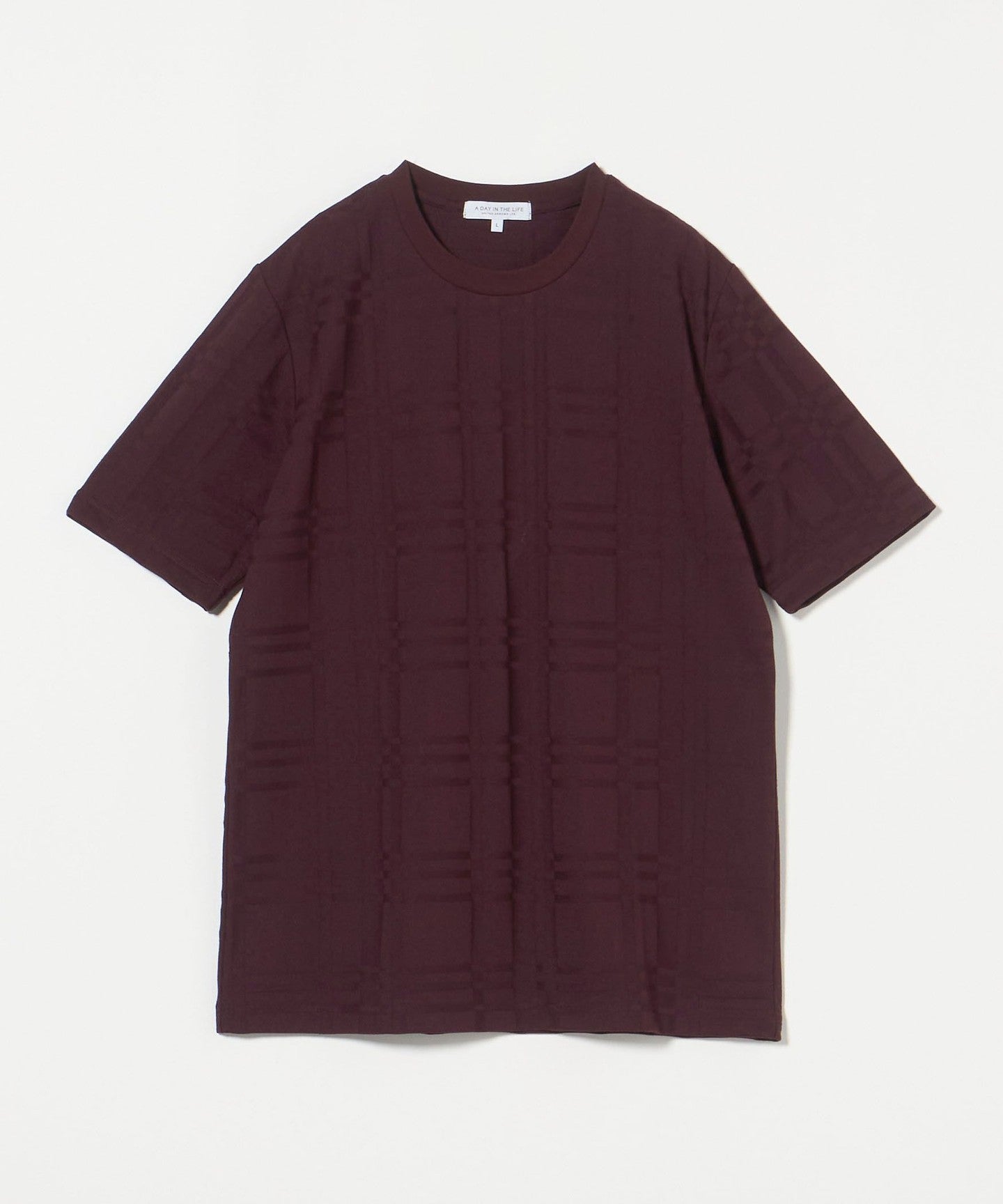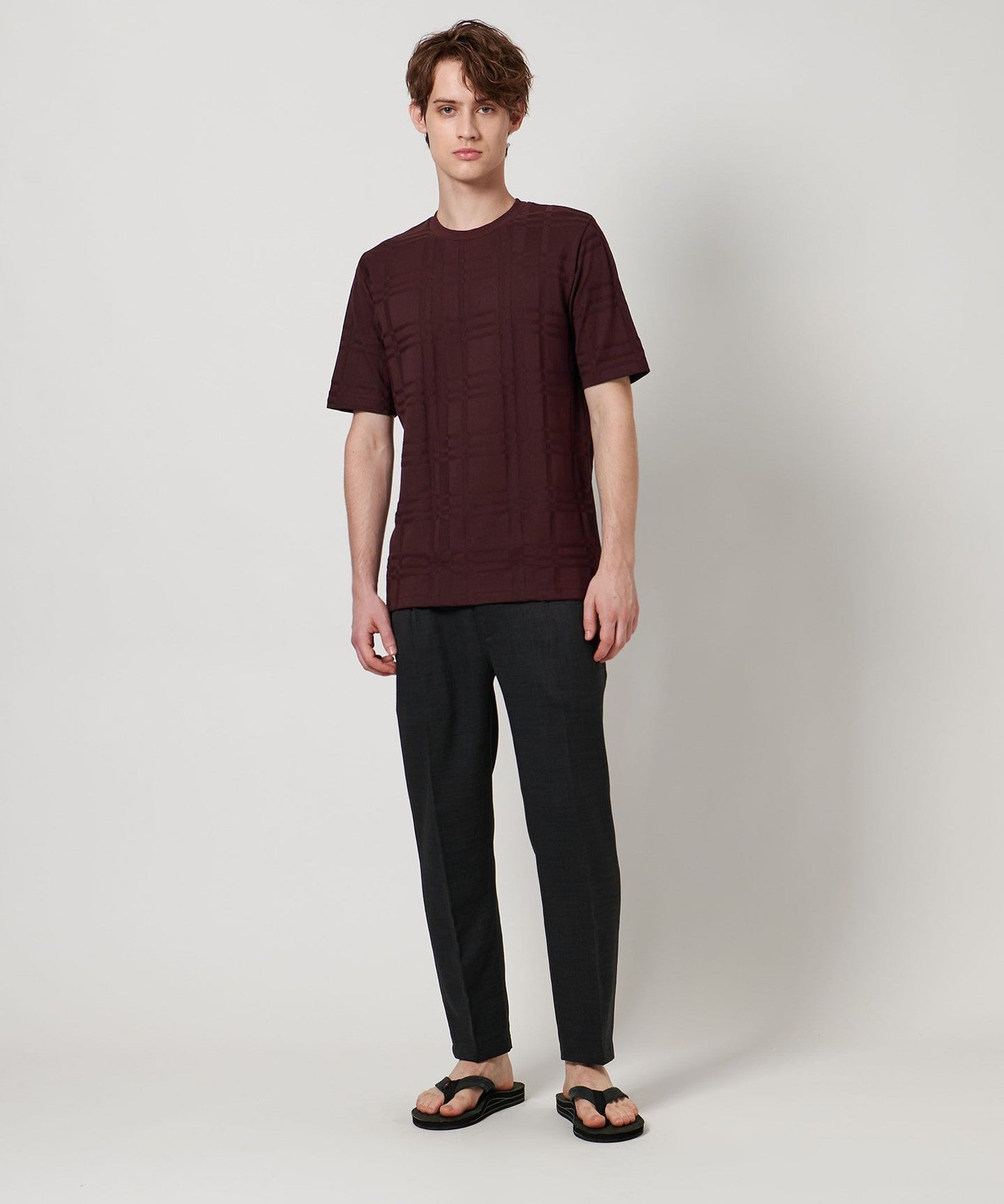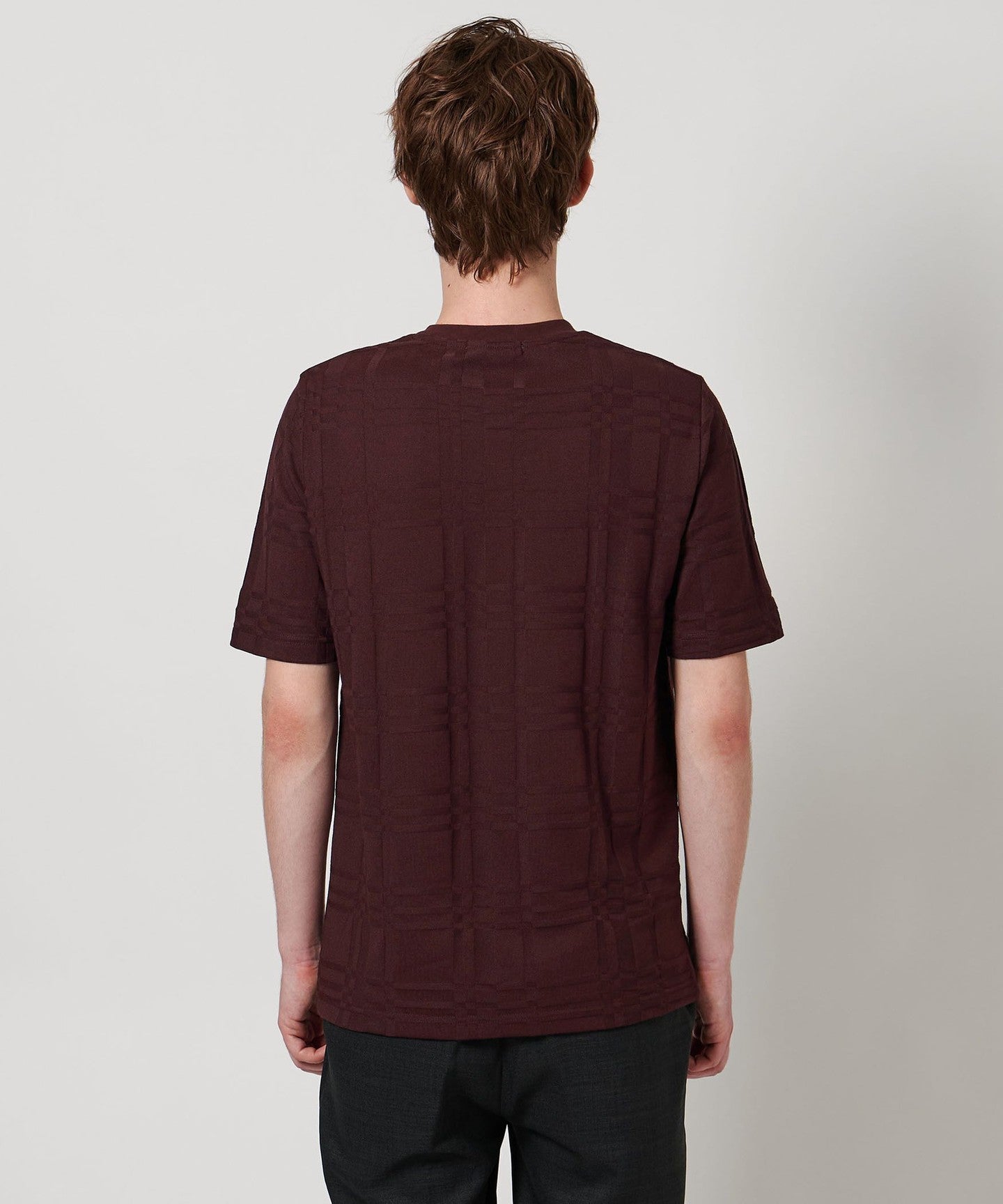 A cut-and-sew top with a subtle check pattern created by the unevenness of the knit fabric.