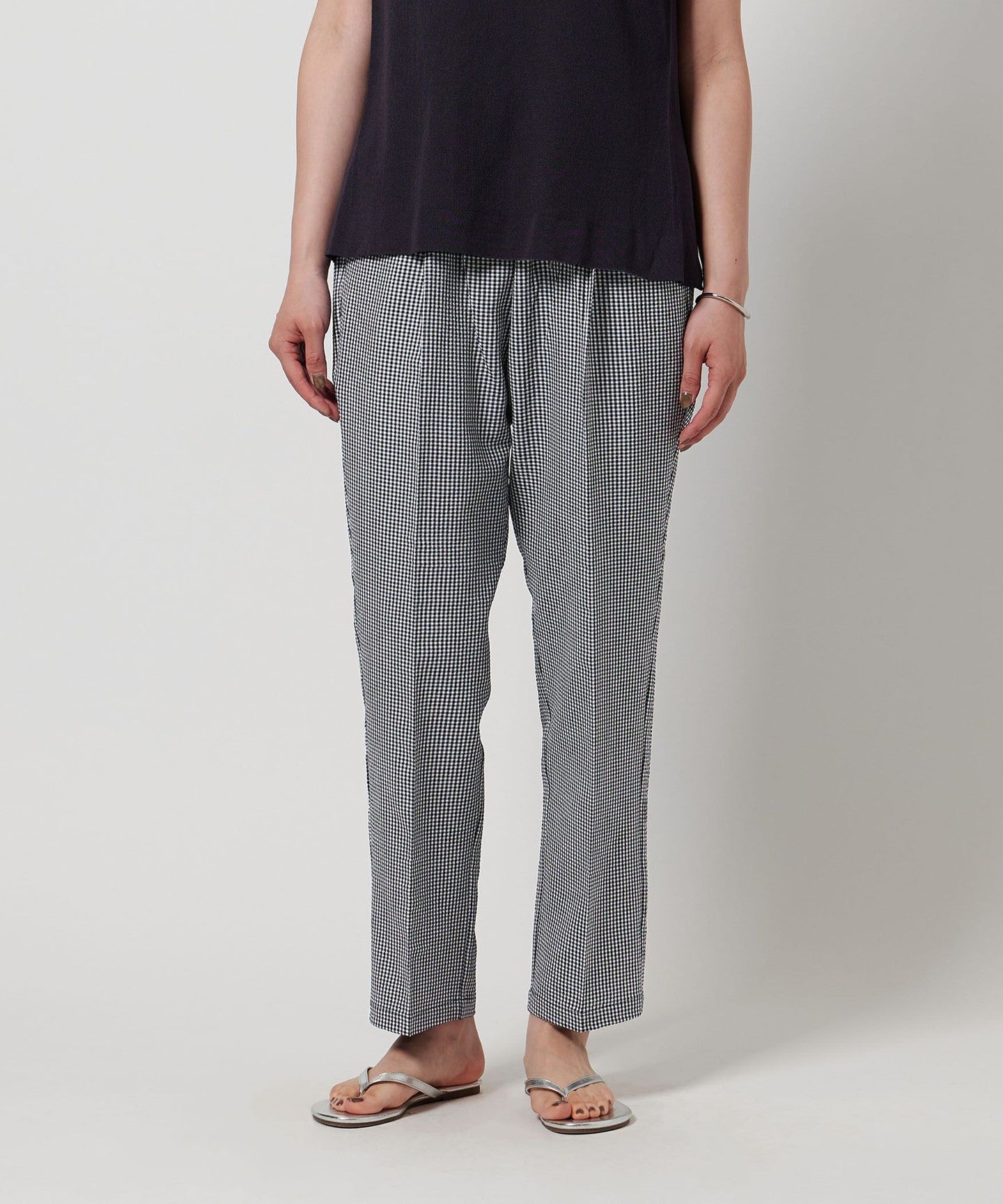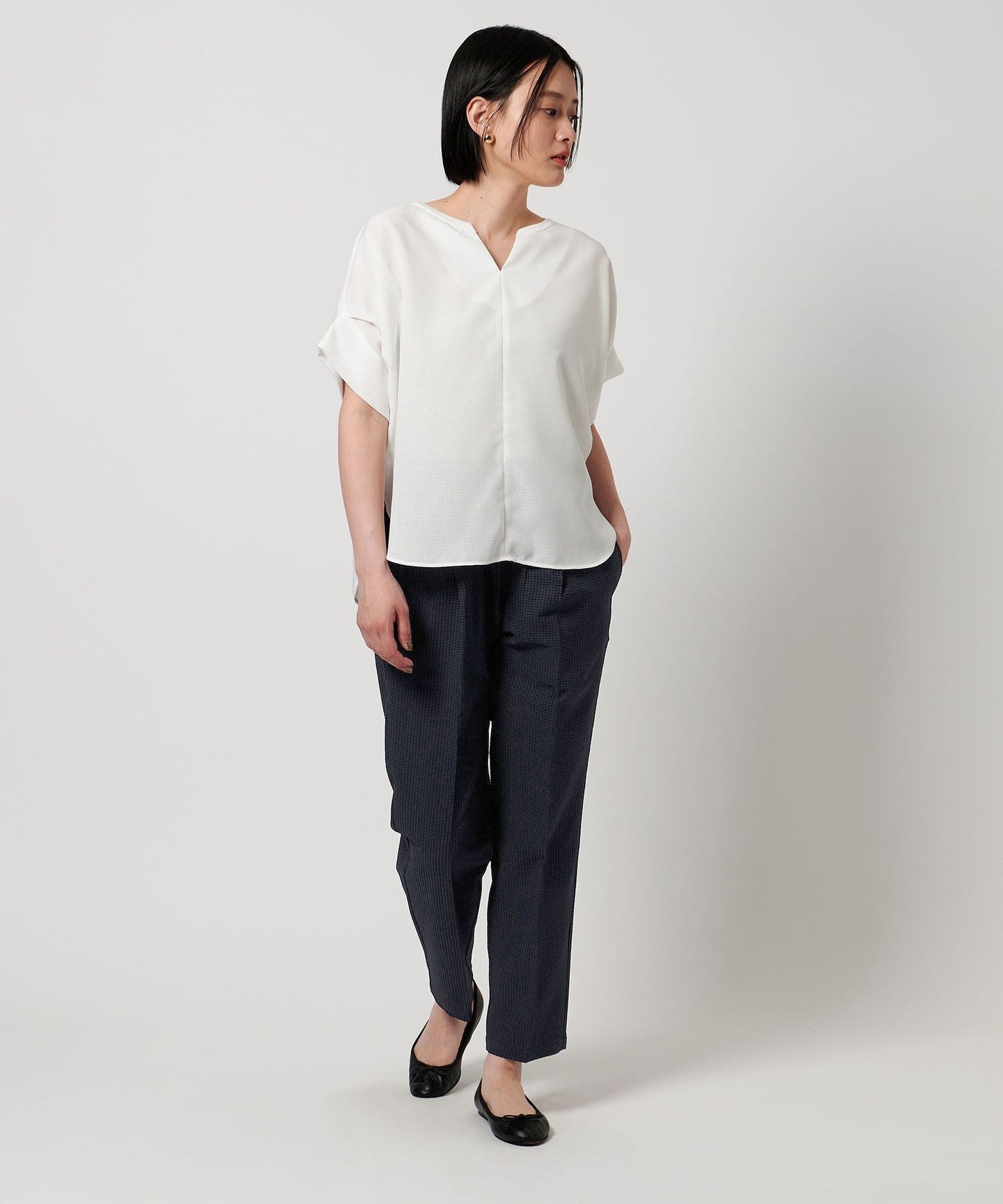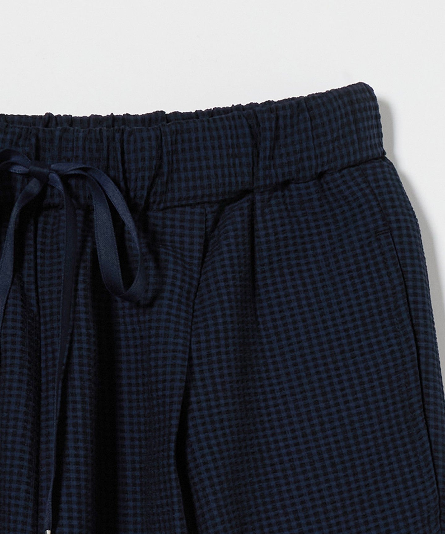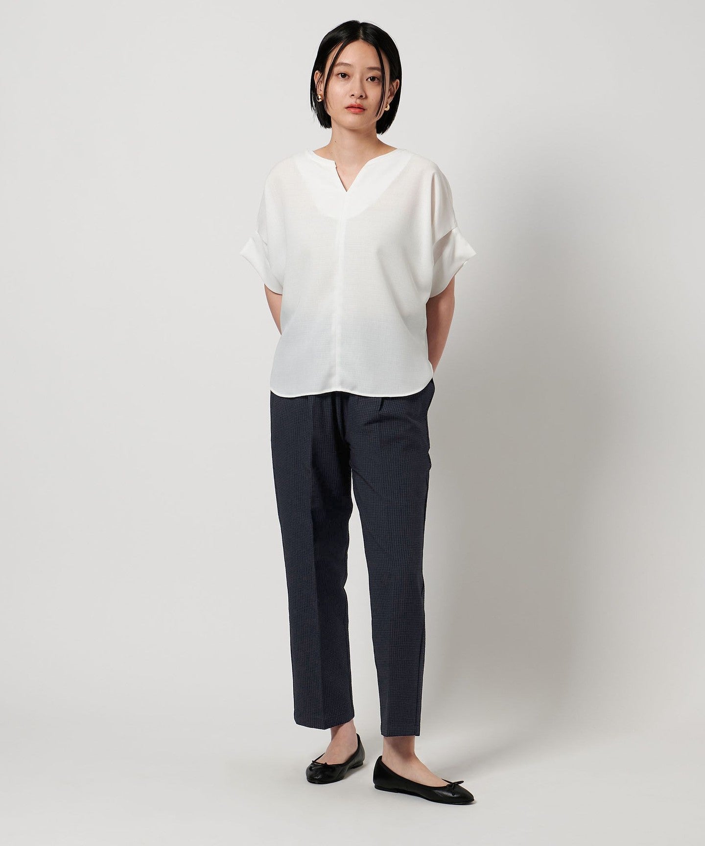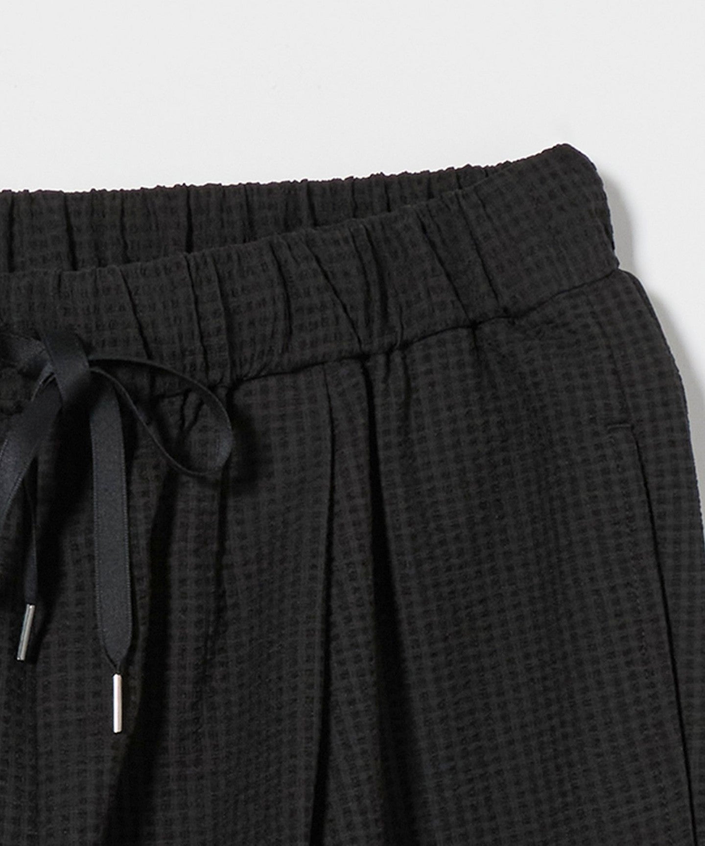 The tapered silhouette with tucks provides just the right amount of looseness, making it comfortable to wear even in hot weather.