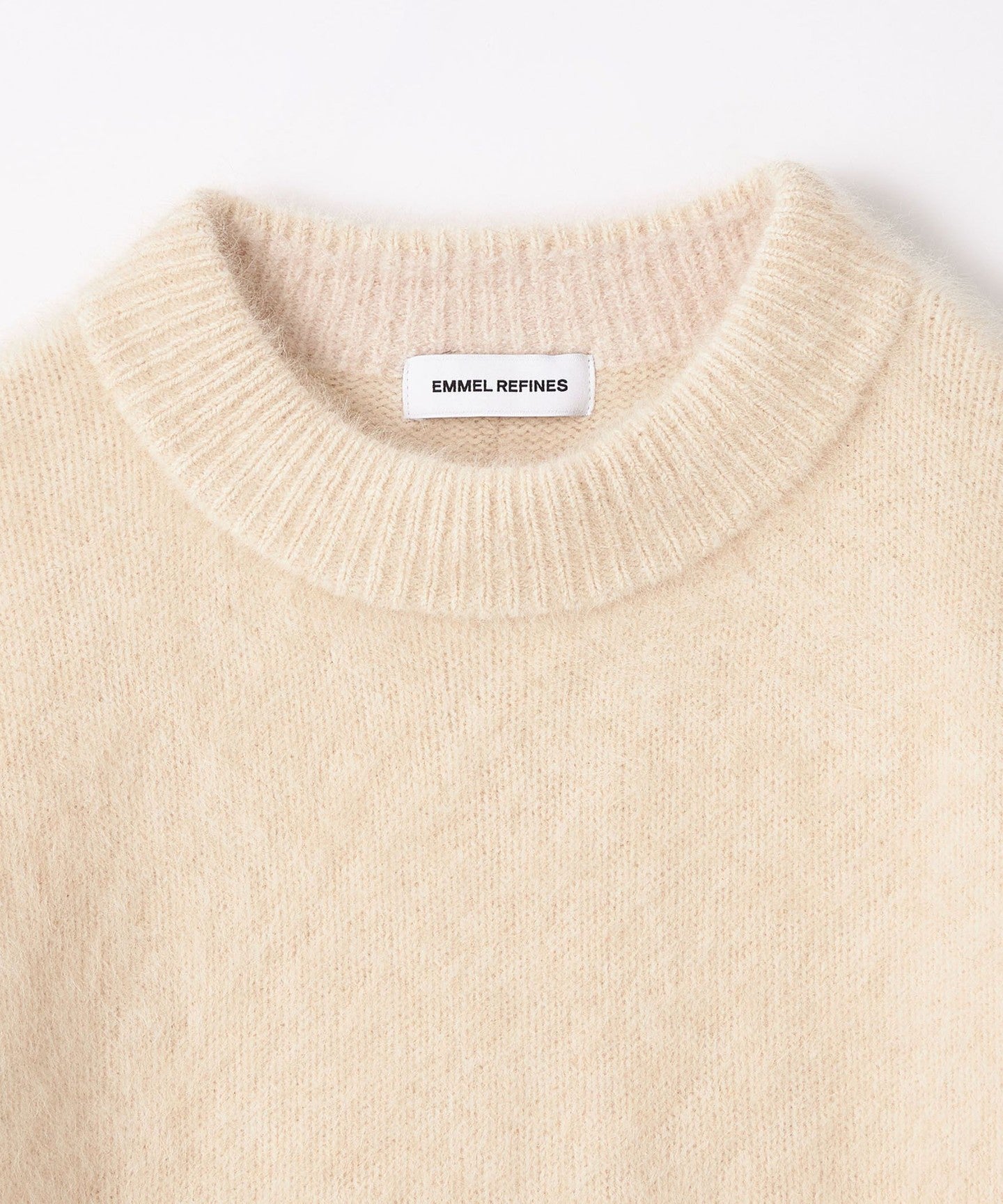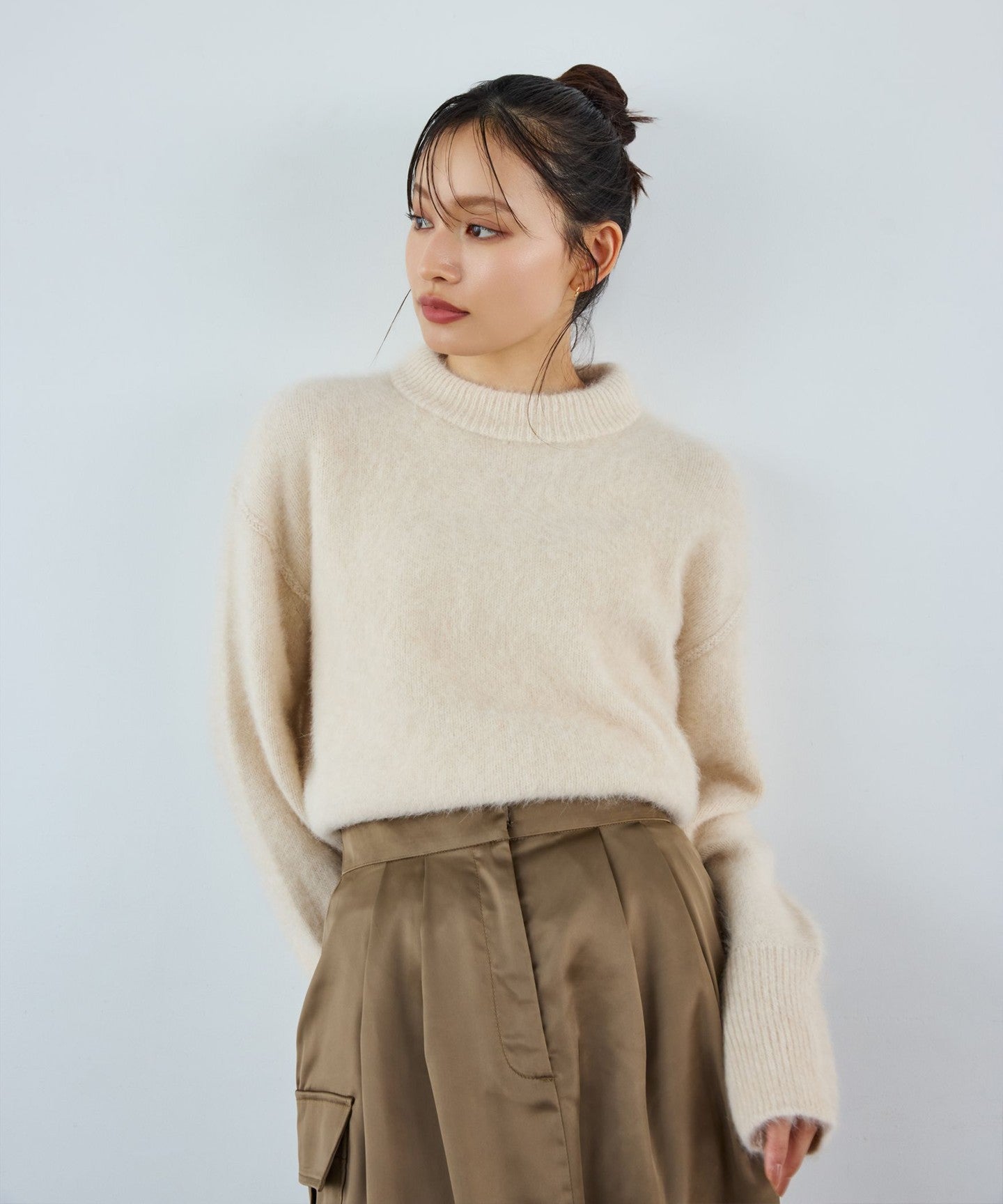 This knit features feminine details with a minimalist crew neck and voluminous sleeves.