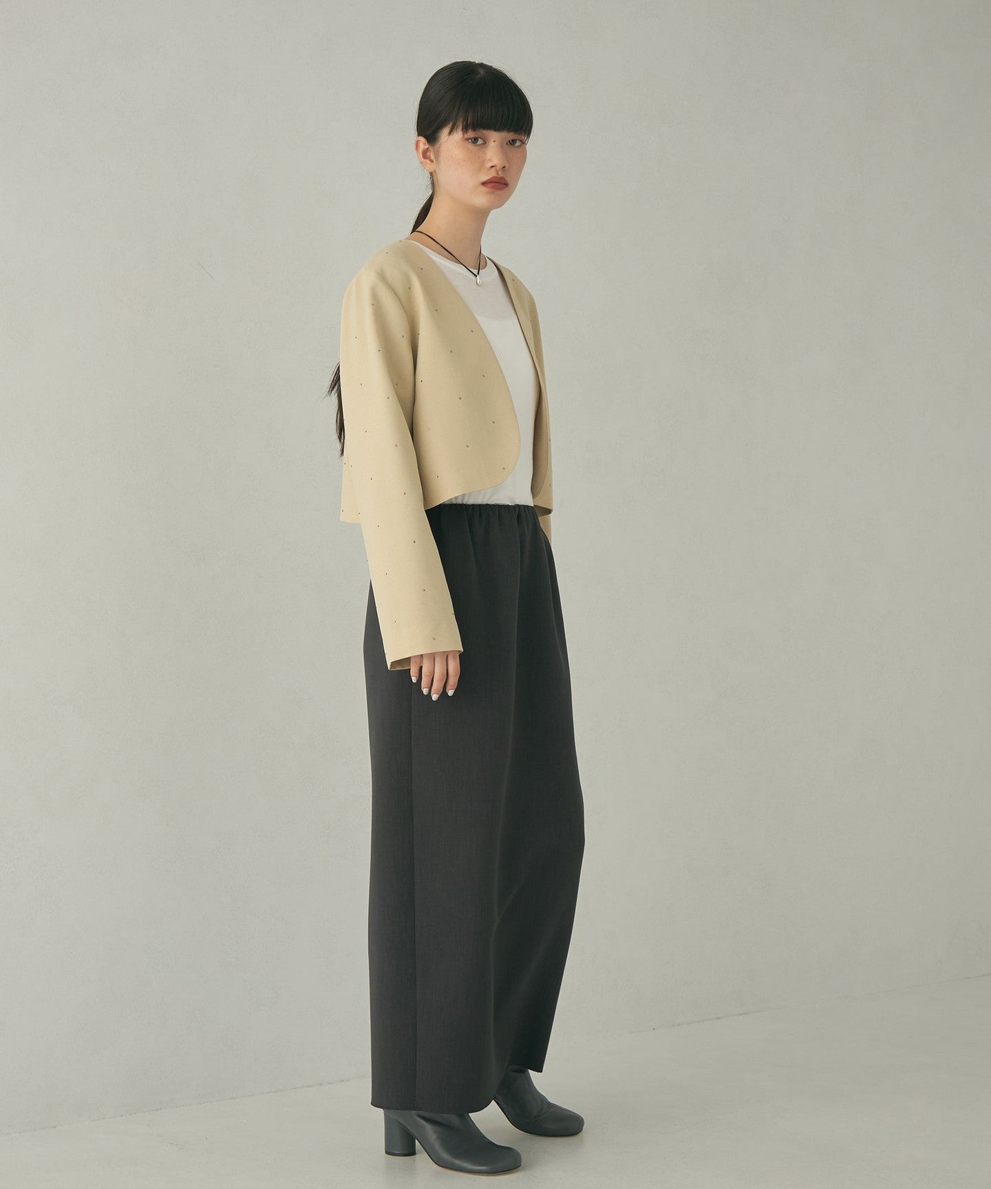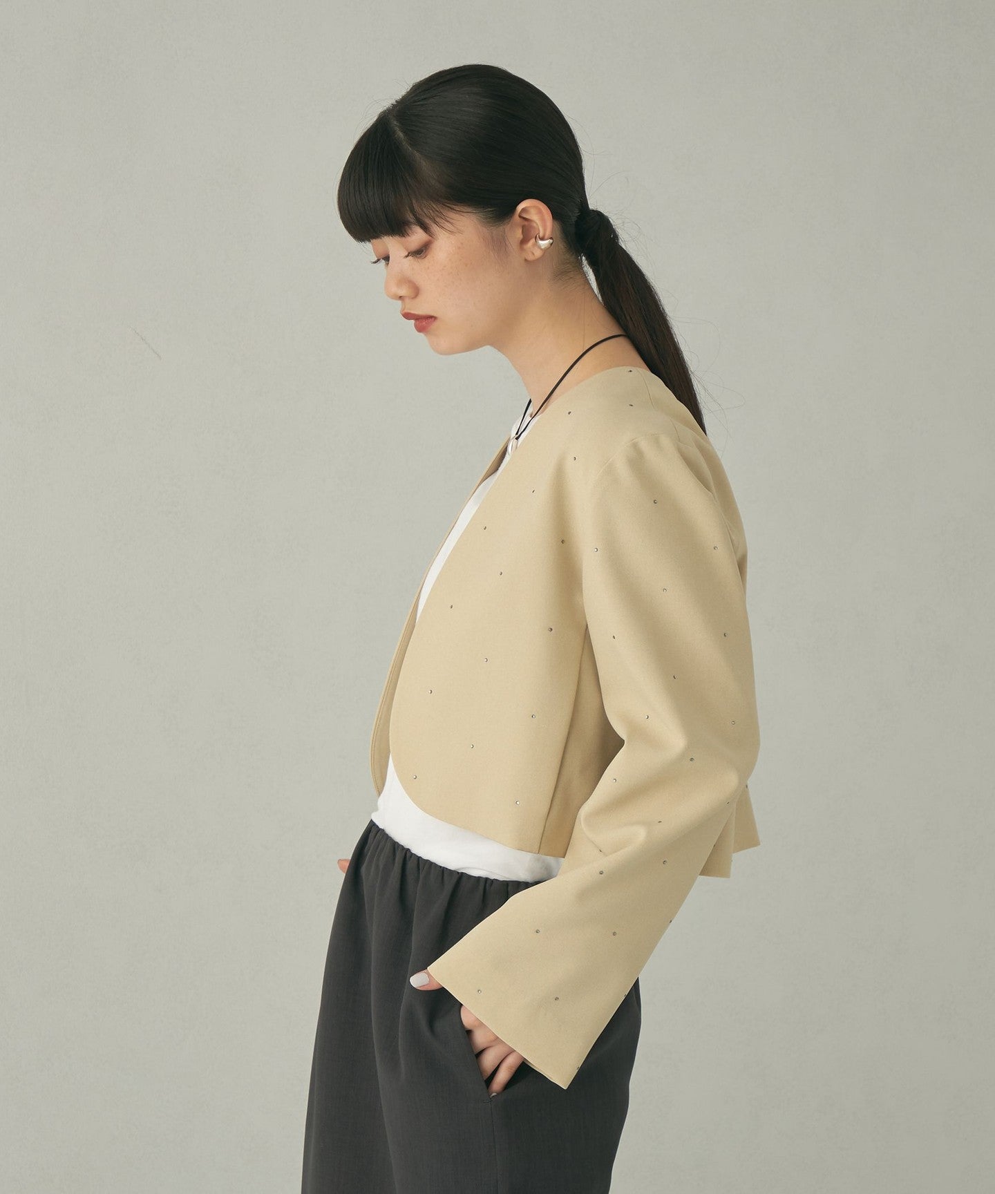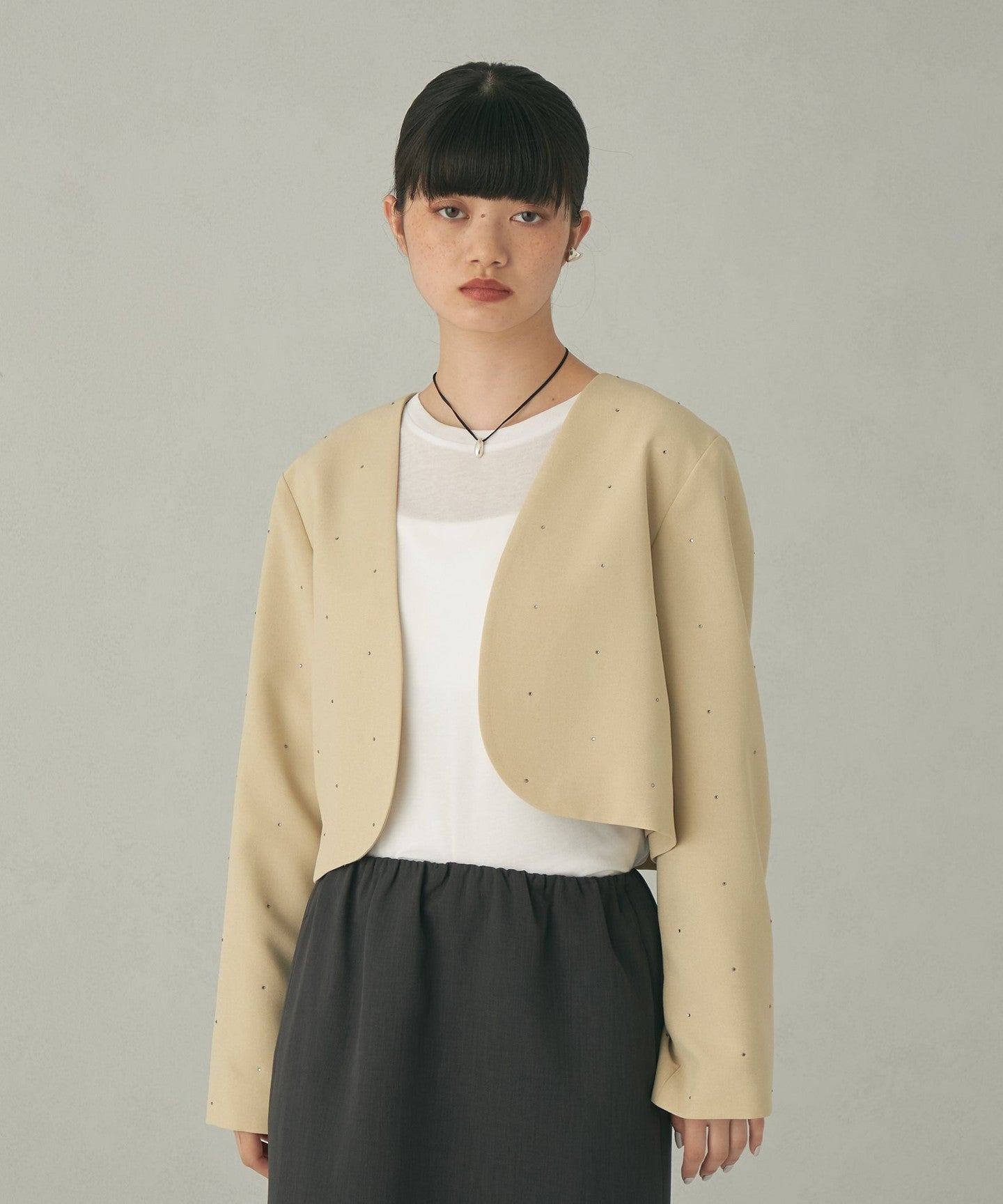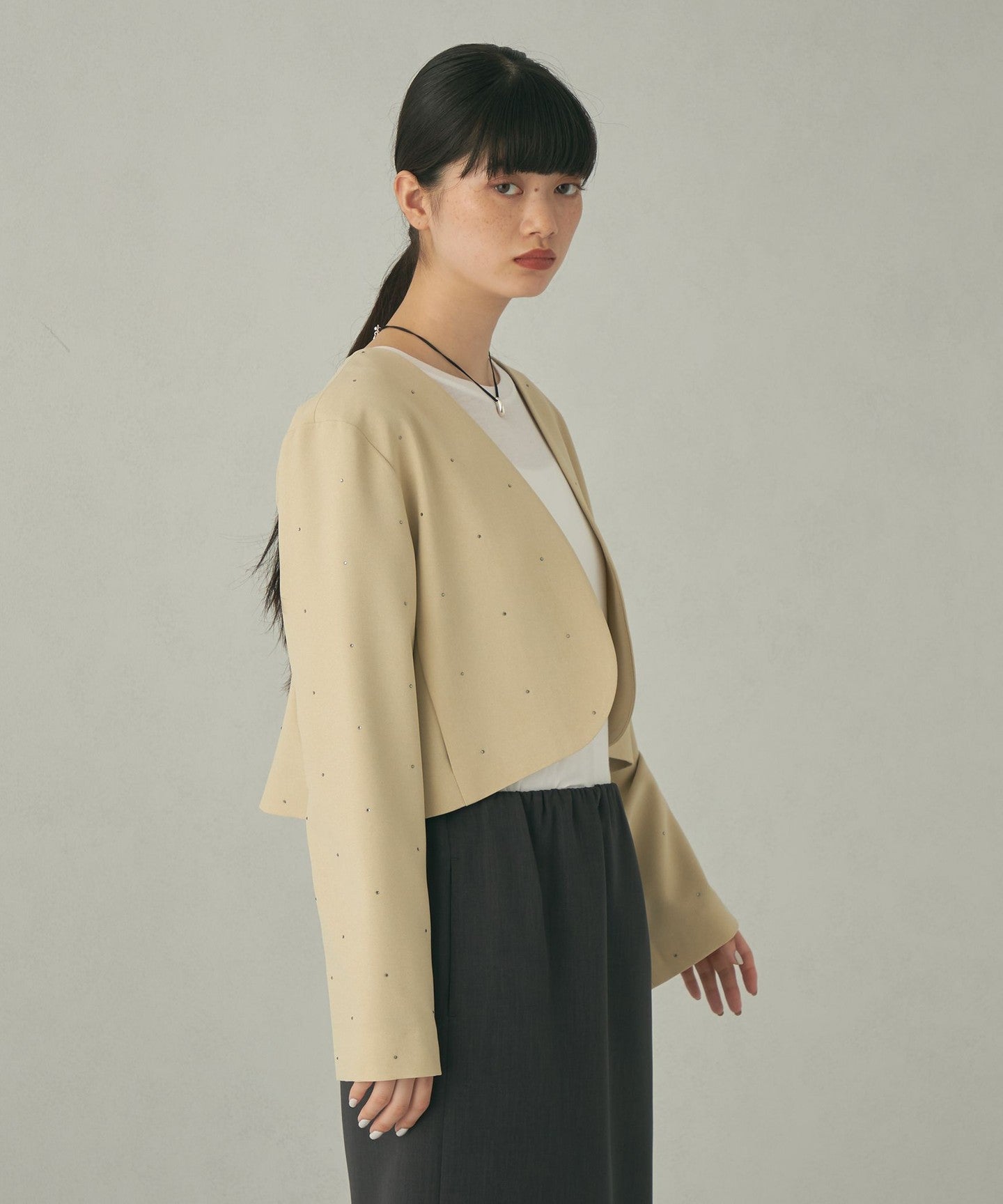 This short, buttonless, bolero-style jacket is easy to put on and can be worn casually without giving off a stiff impression.