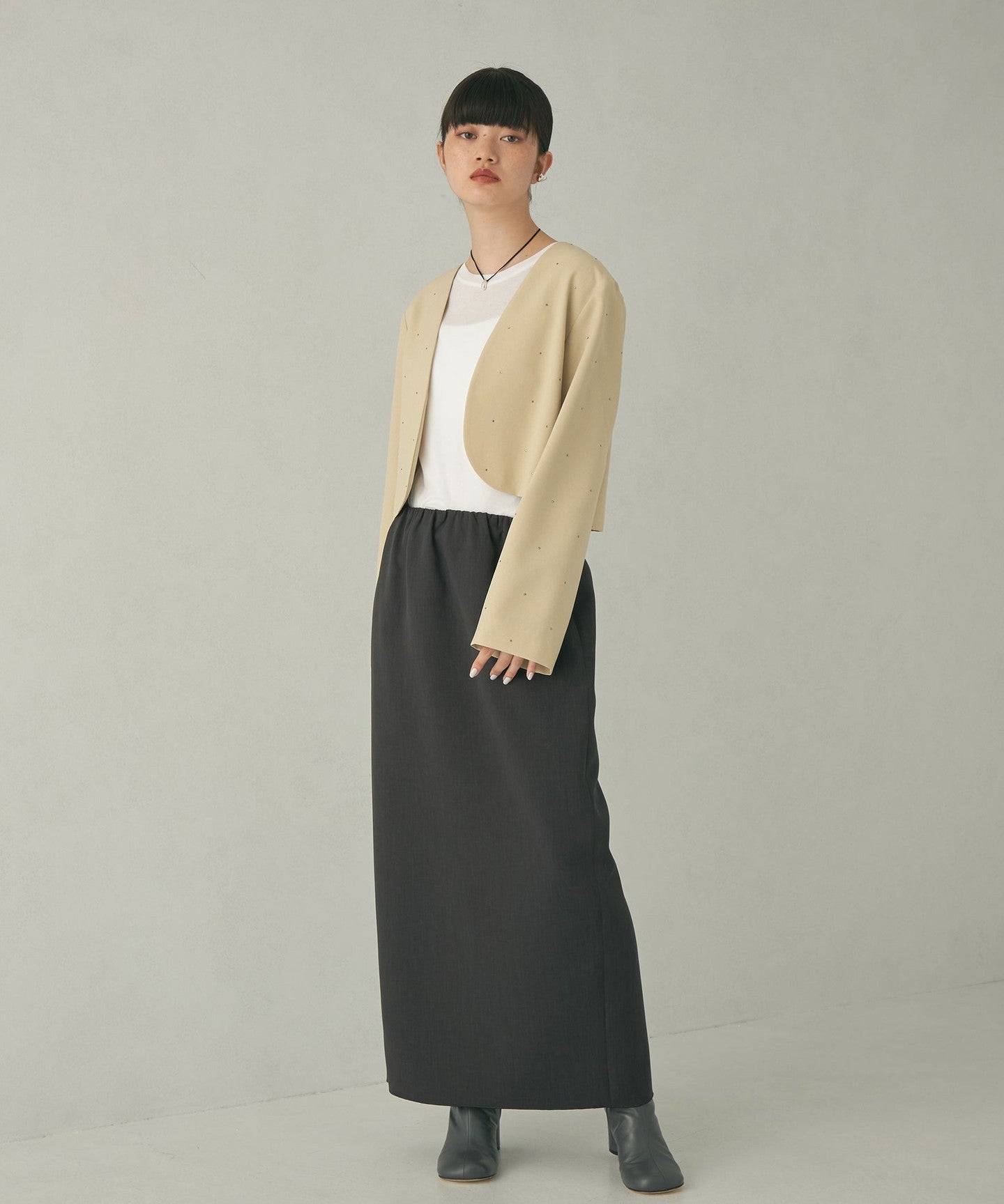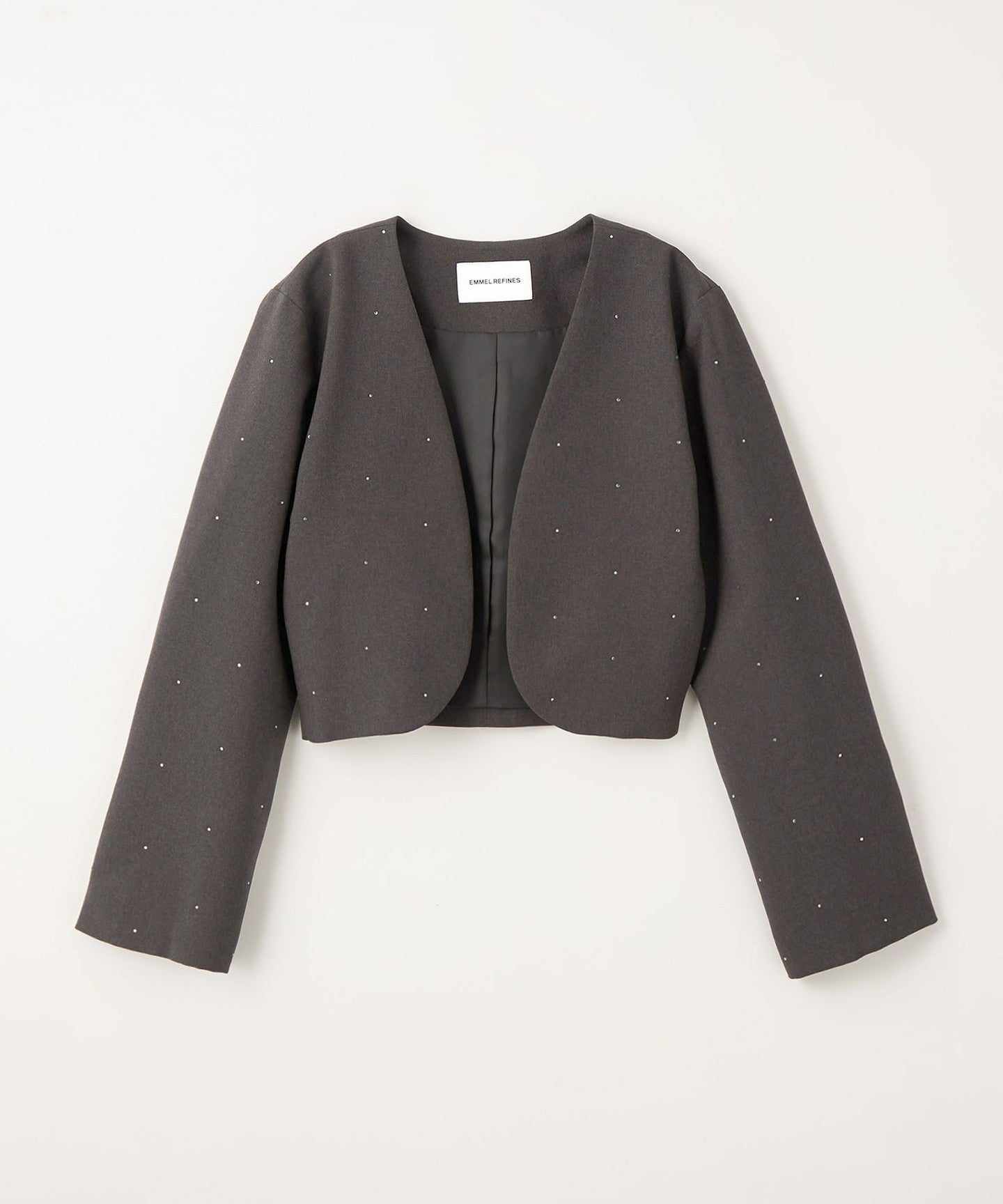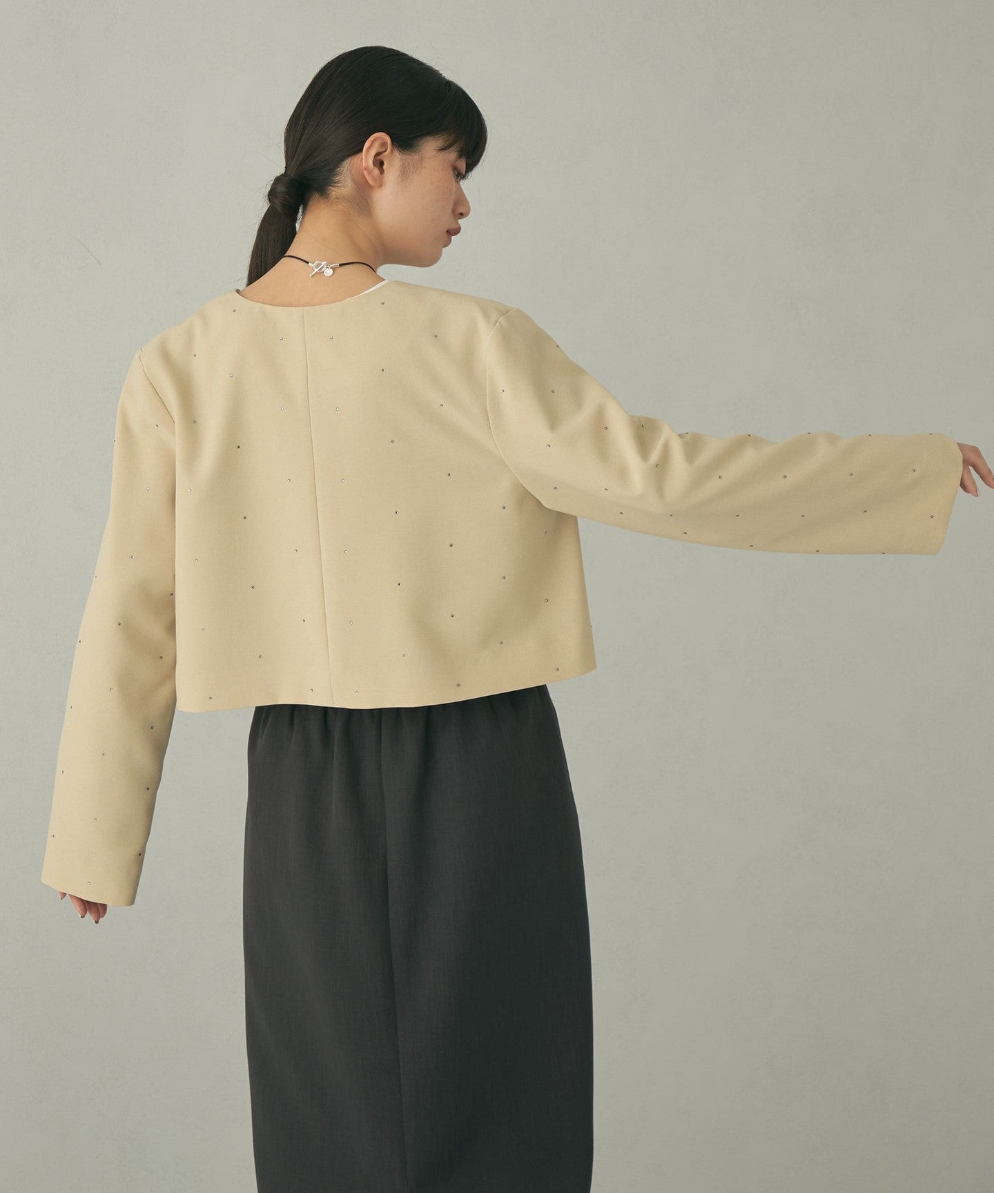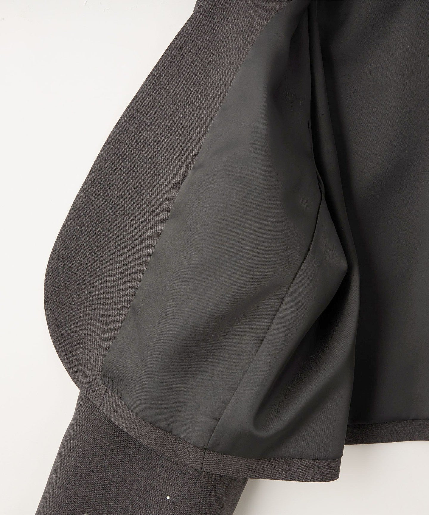 This short, buttonless, bolero-style jacket is easy to put on and can be worn casually without giving off a stiff impression.