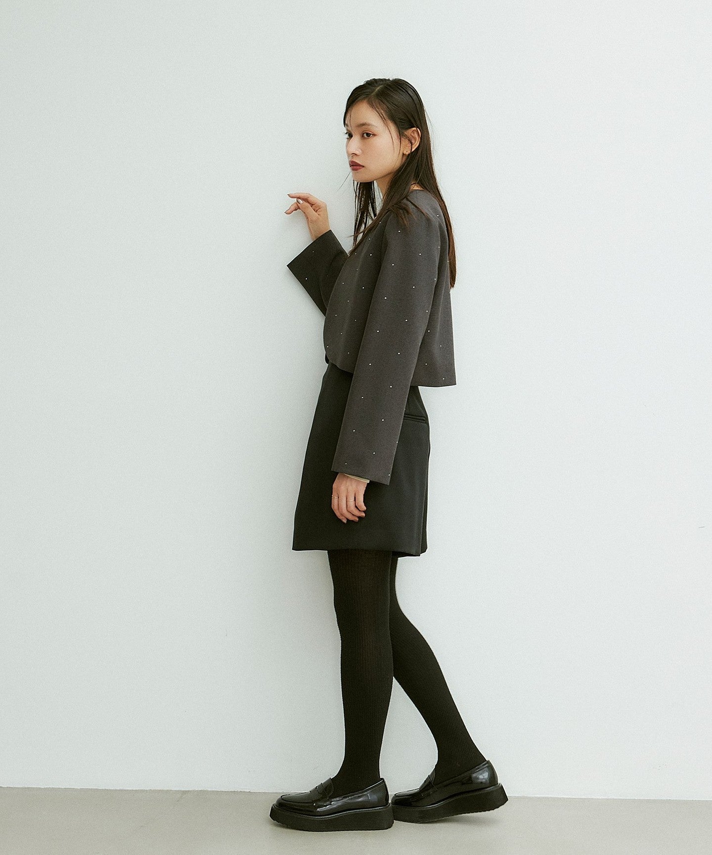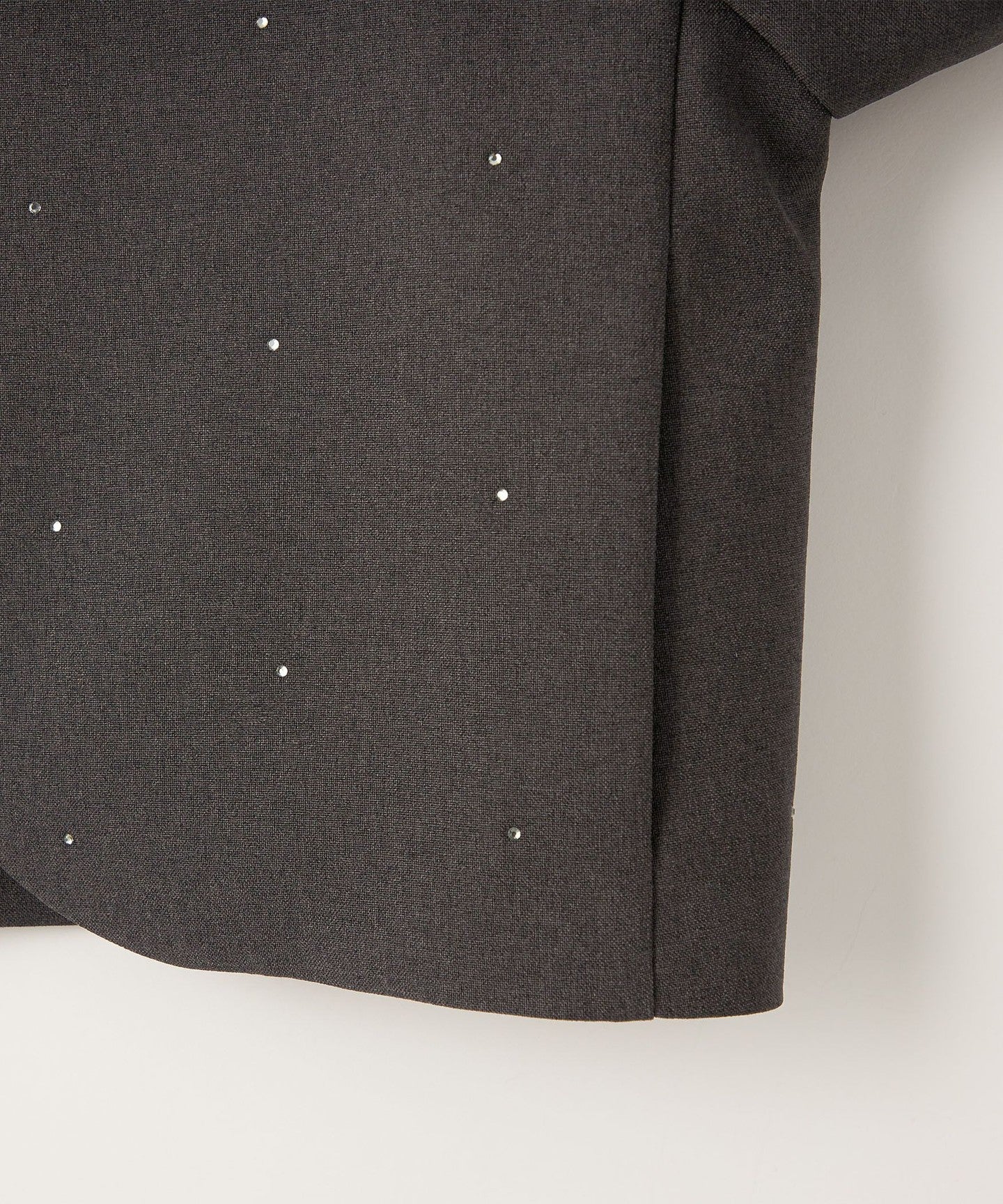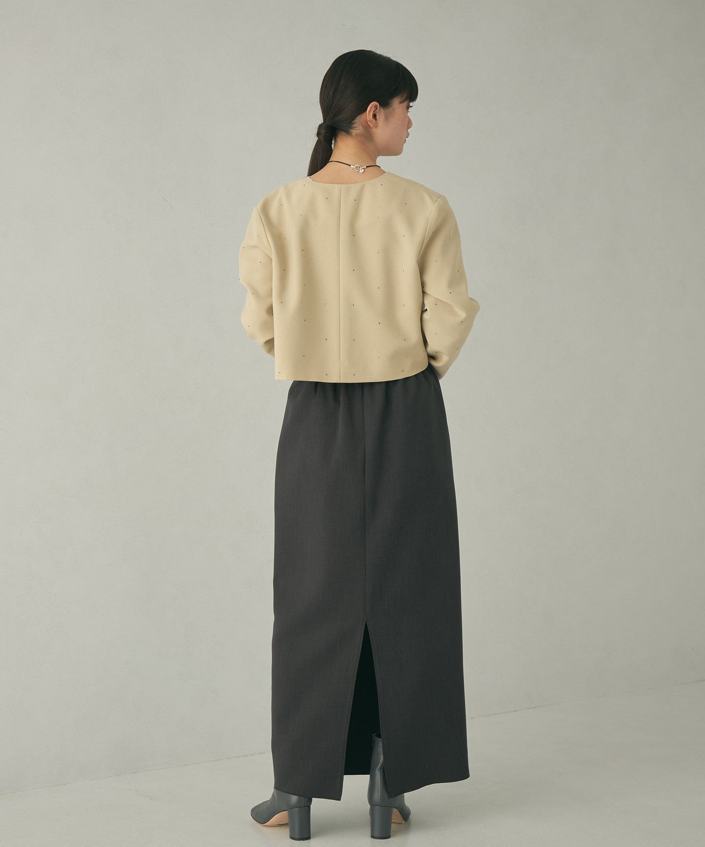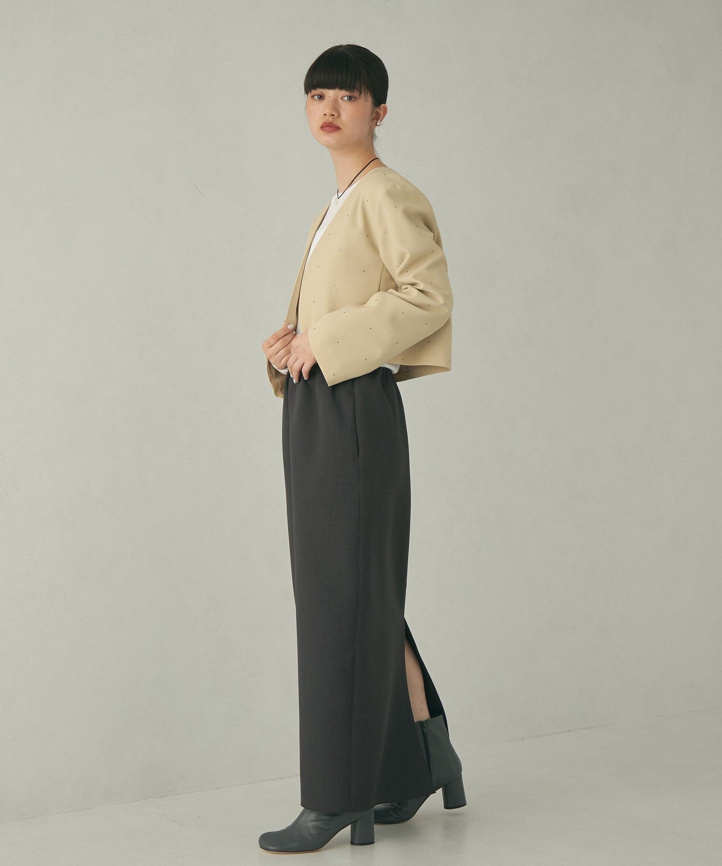 This short, buttonless, bolero-style jacket is easy to put on and can be worn casually without giving off a stiff impression.