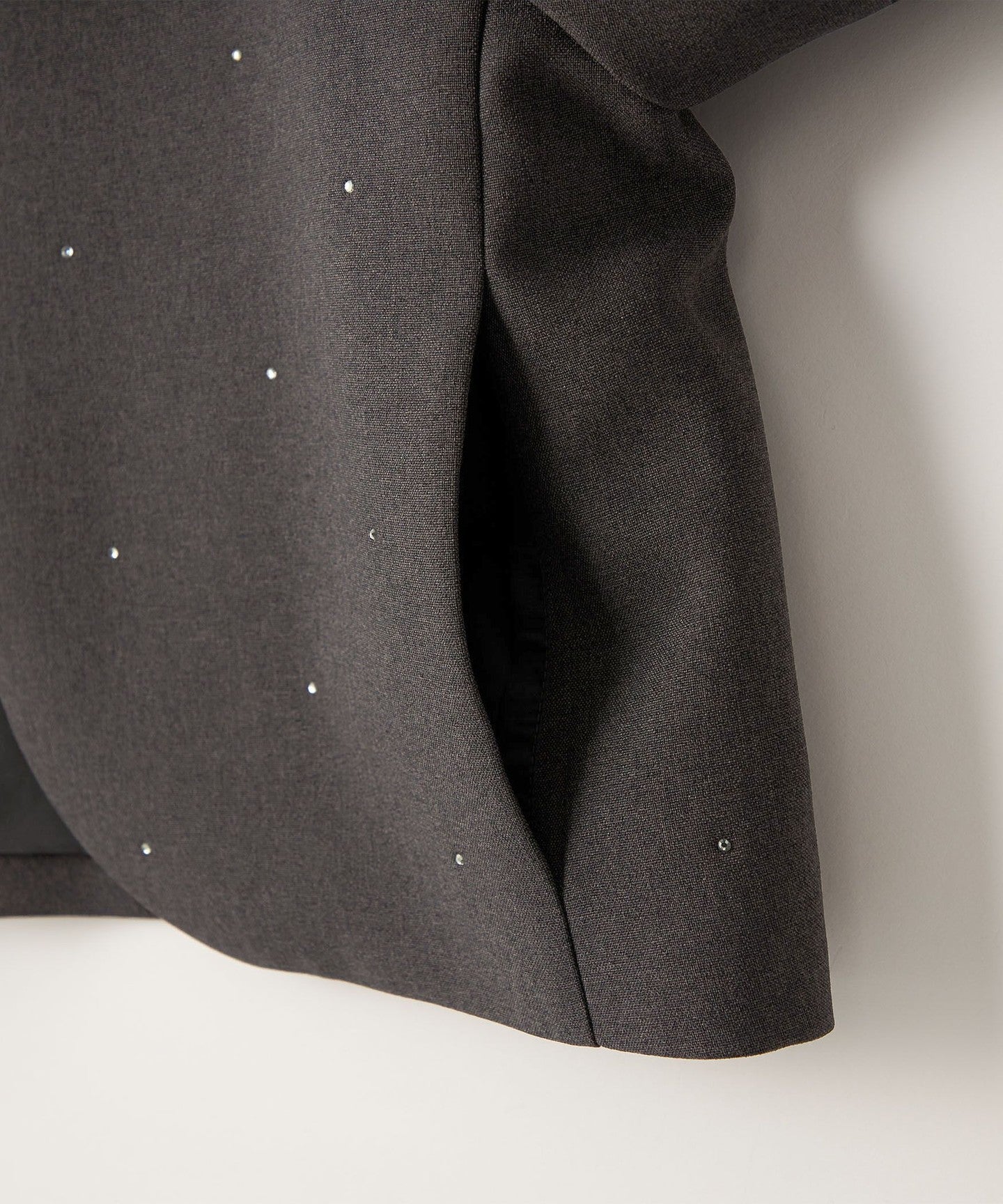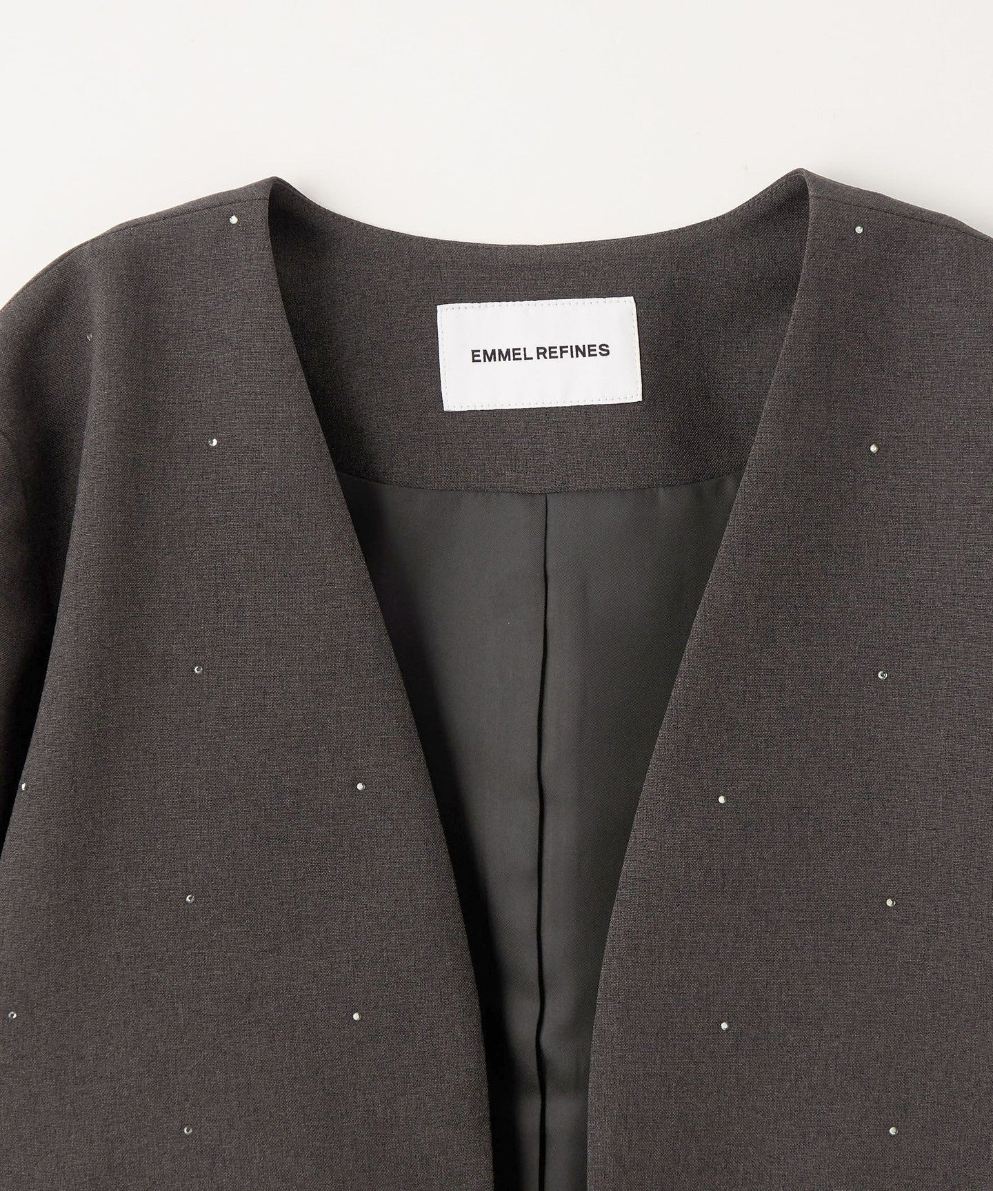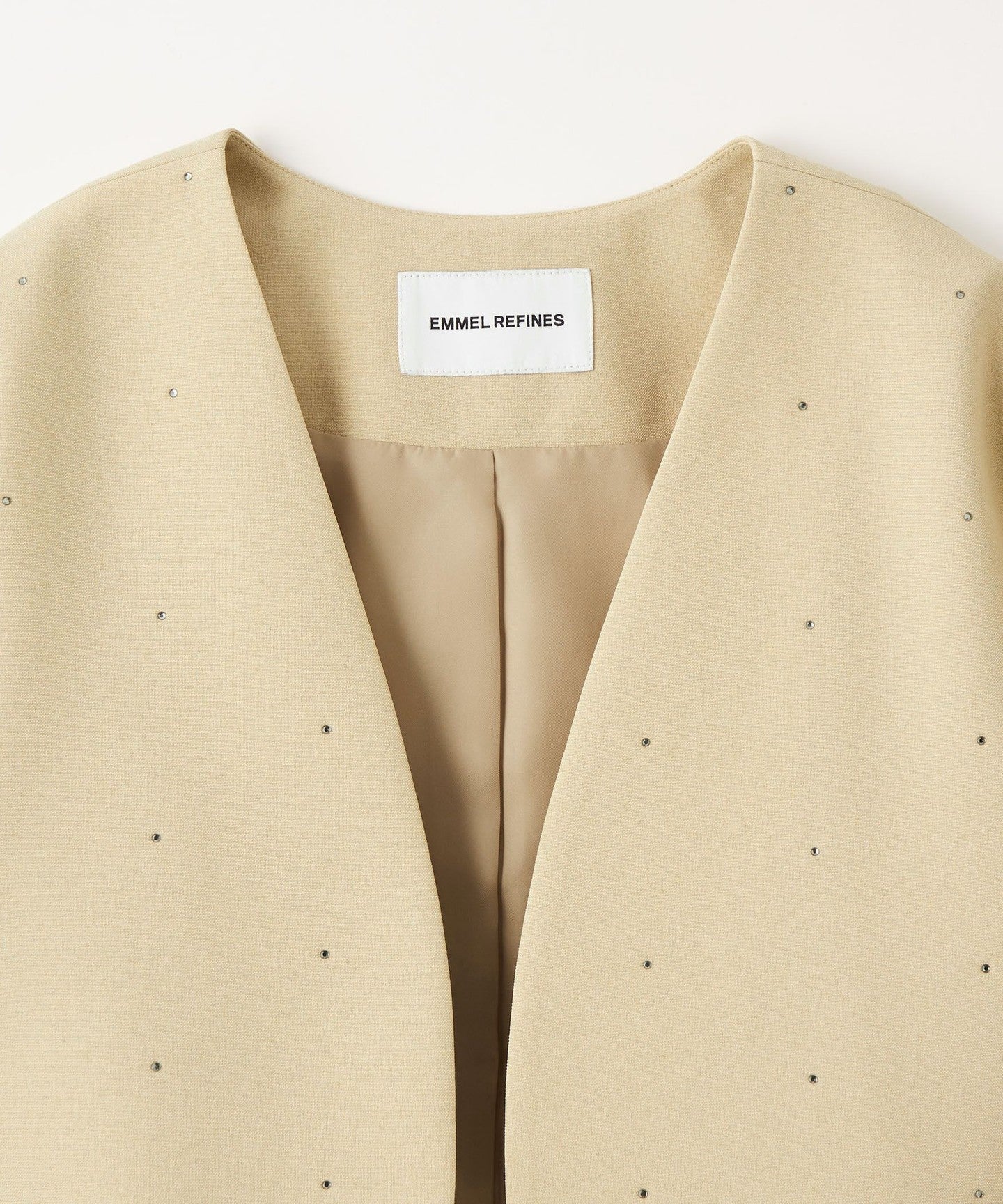 We have created a minimalist collarless jacket by taking advantage of the trendy hot fit processing.