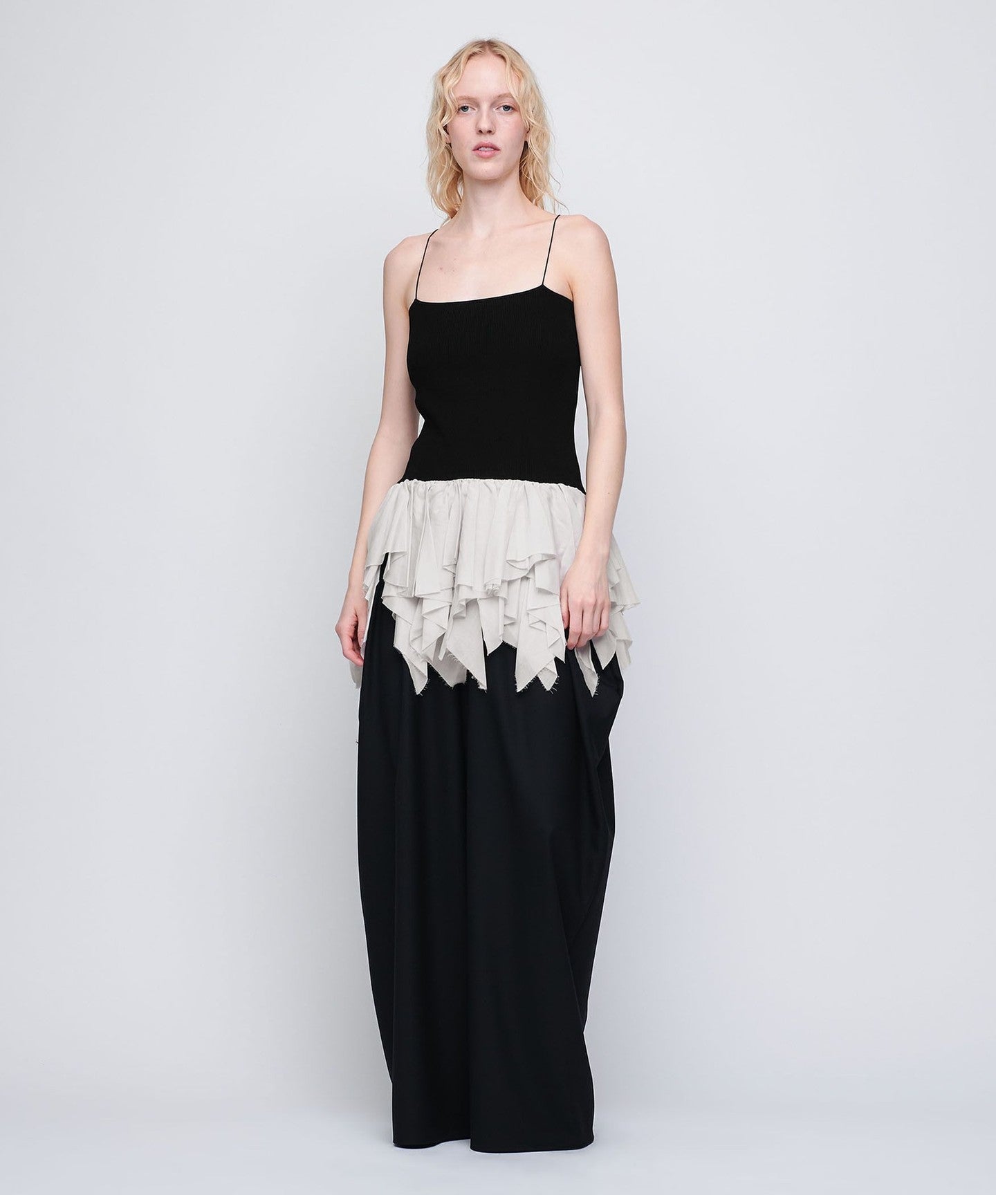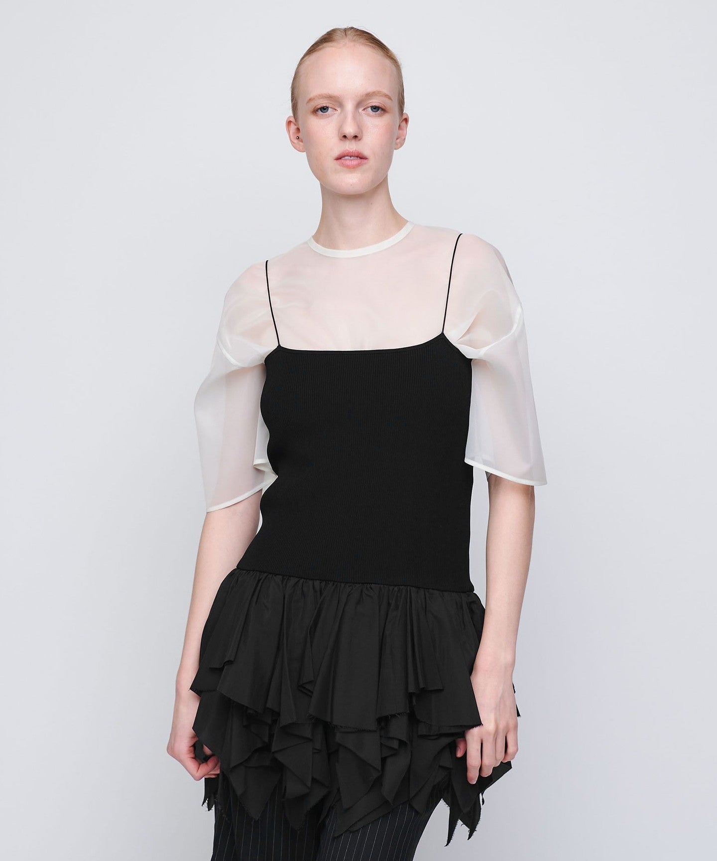 The knitted body fits the body perfectly, creating a beautiful contrast with the voluminous ruffled hem.