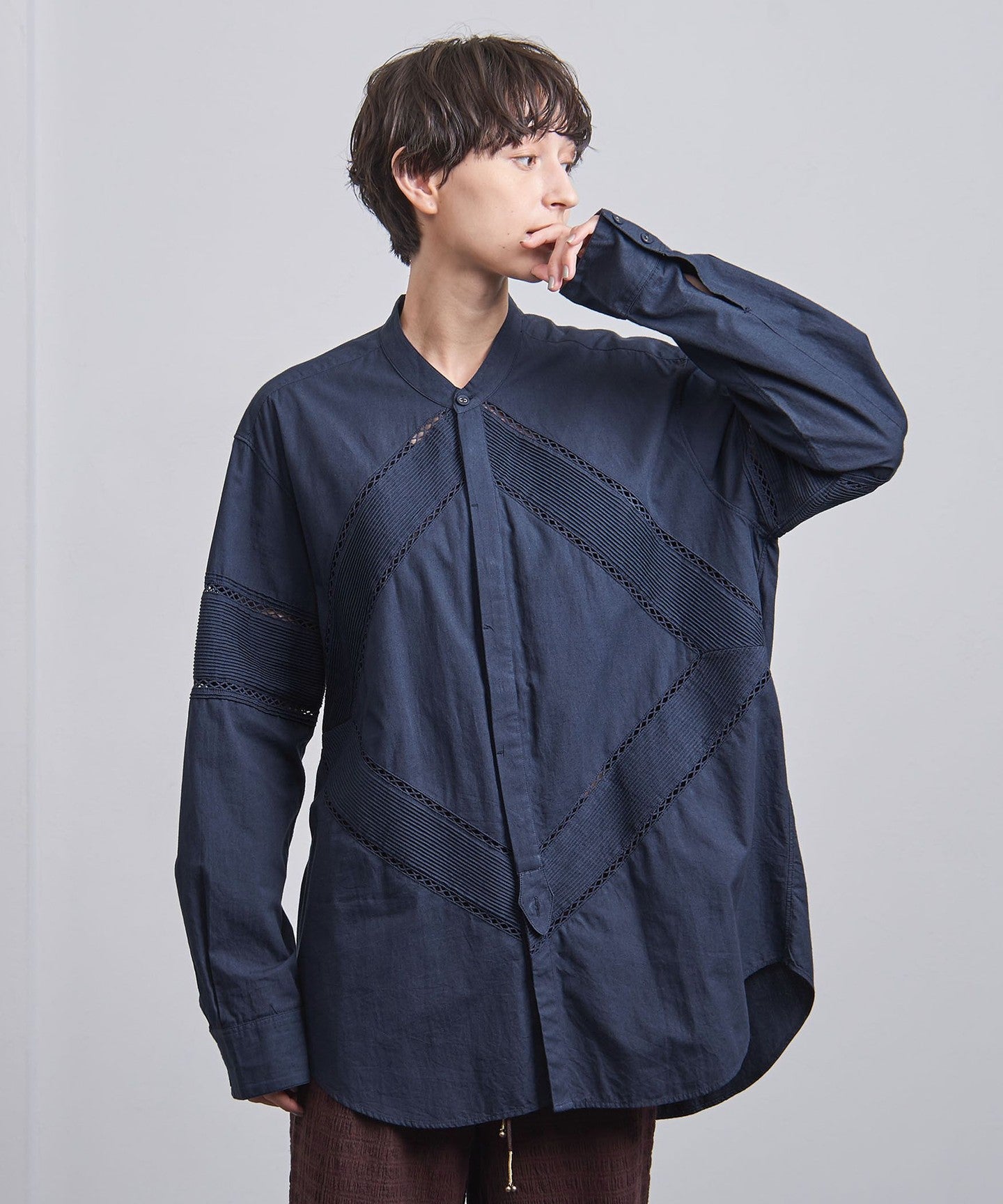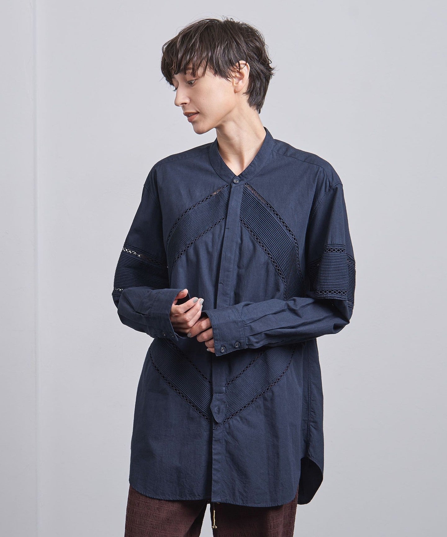 "Trinity" is a series that incorporates men's formal bustle shirts with contrasting fabrics around the chest into women's everyday wear.