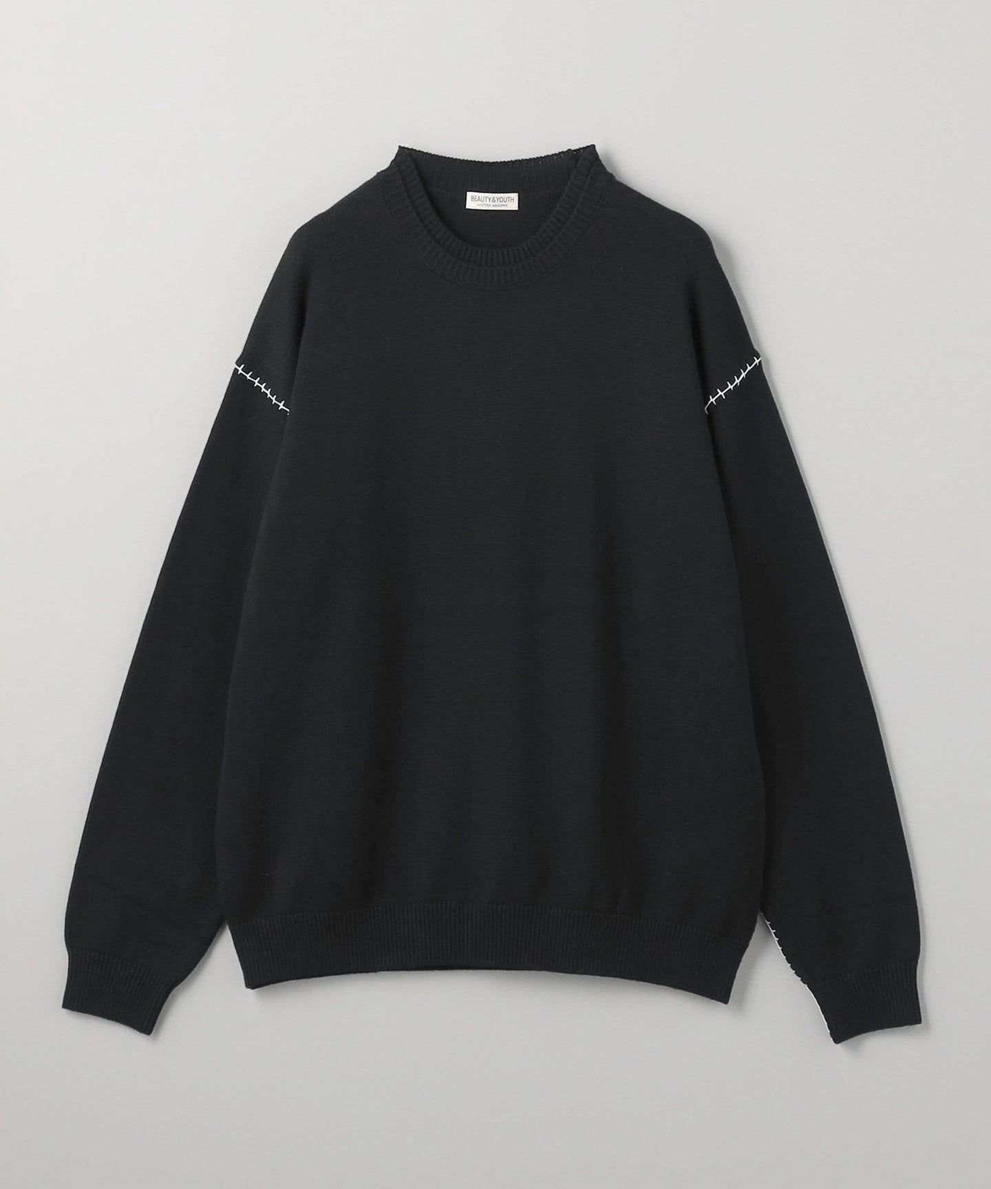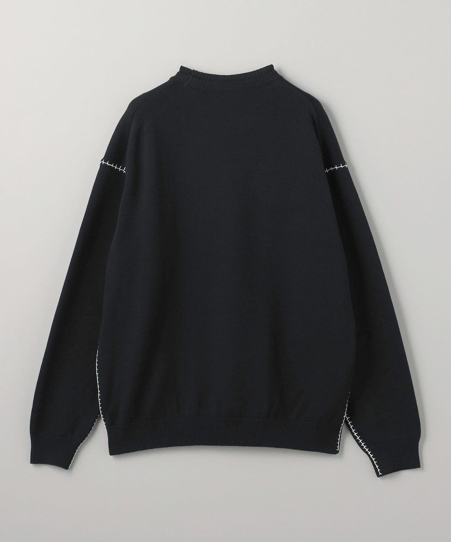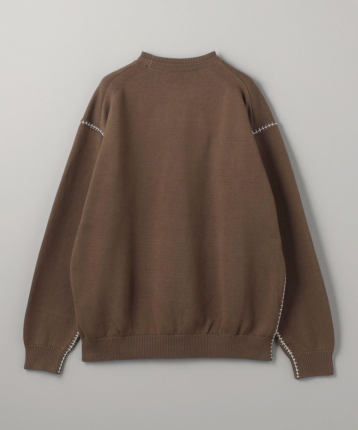 A unique crew neck knit with a hand-stitched design and color scheme that gives it a craft feel.