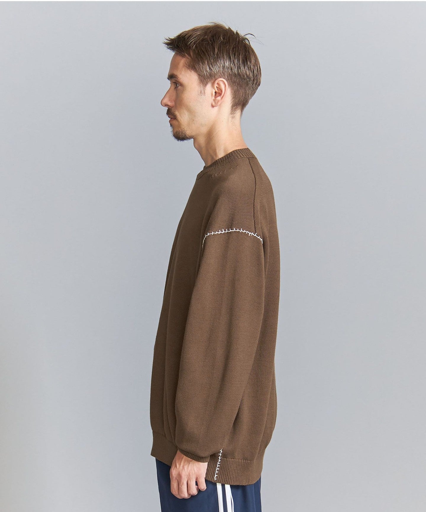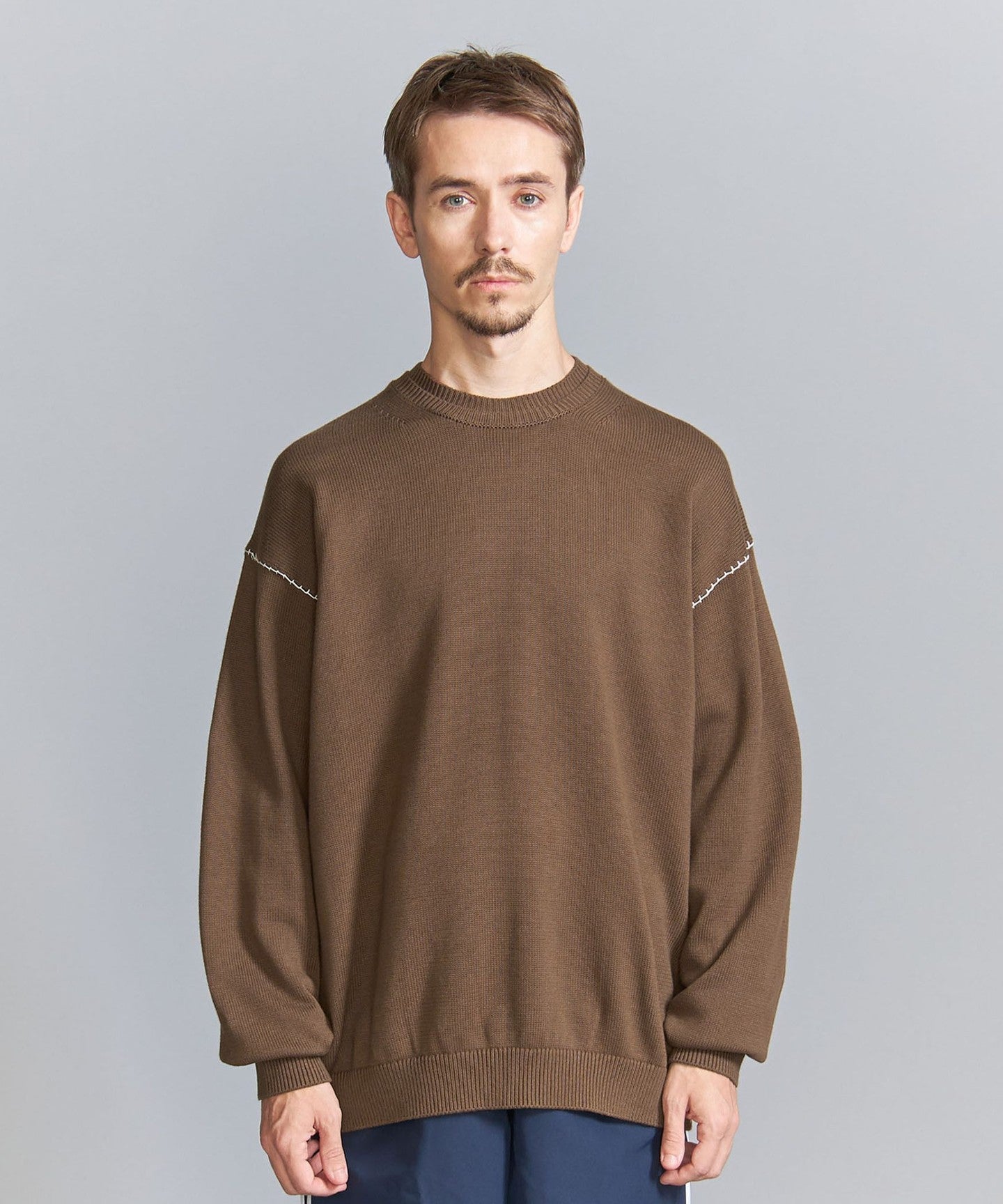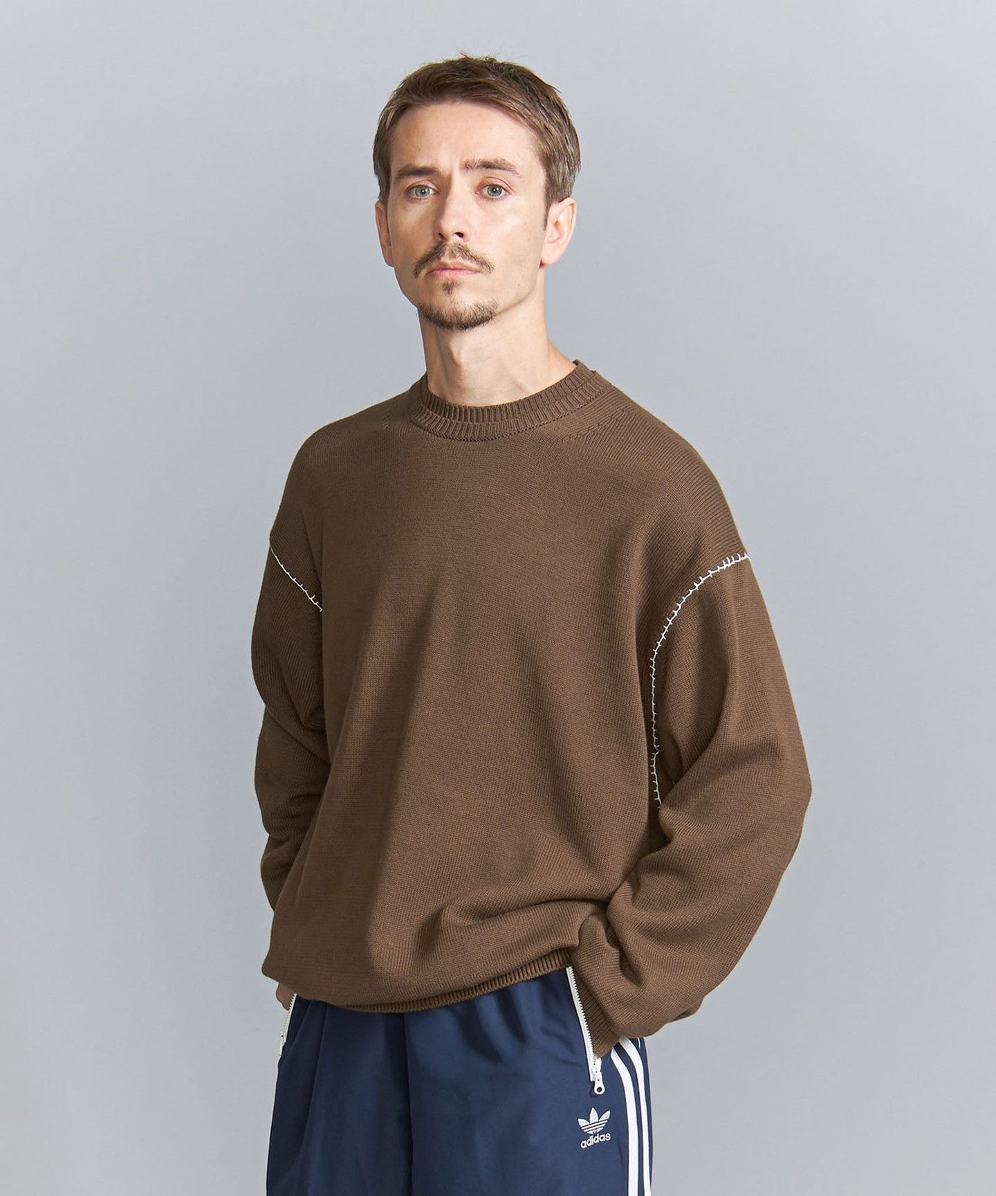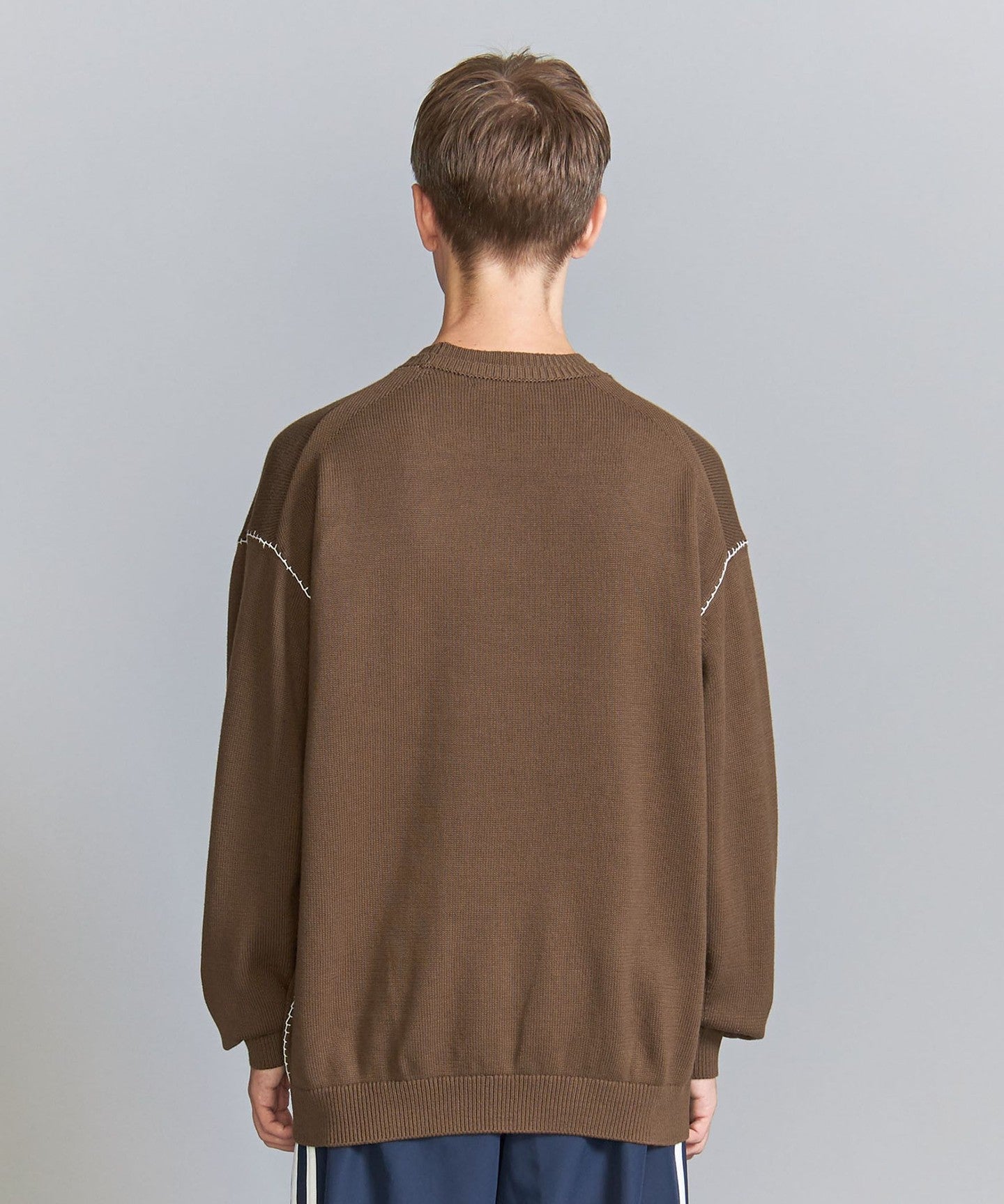 A unique crew neck knit with a hand-stitched design and color scheme that gives it a craft feel.