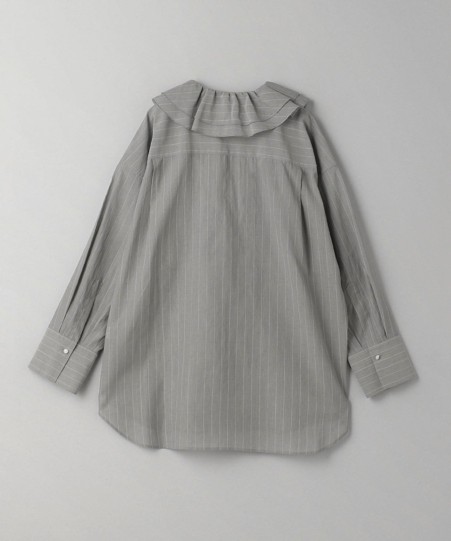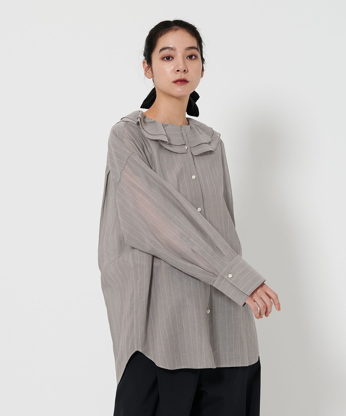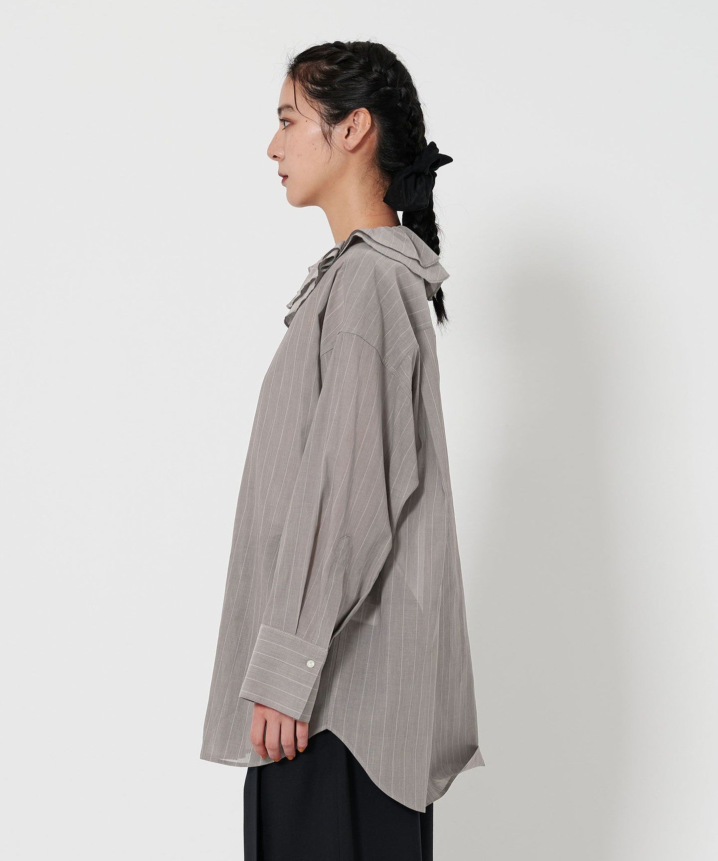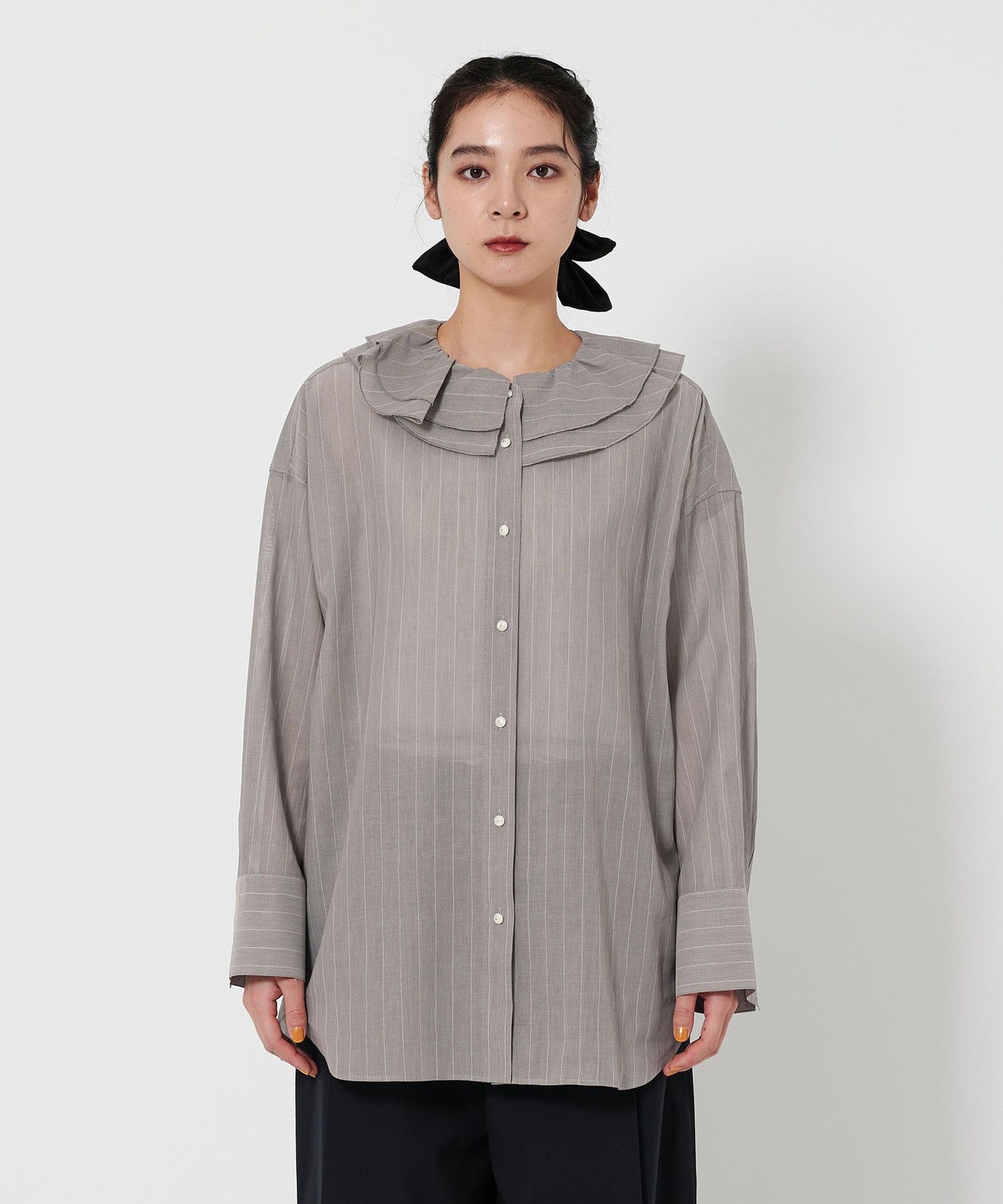 This is a ruffled shirt with thin stripes that give it a refined impression, asserting quiet elegance.
