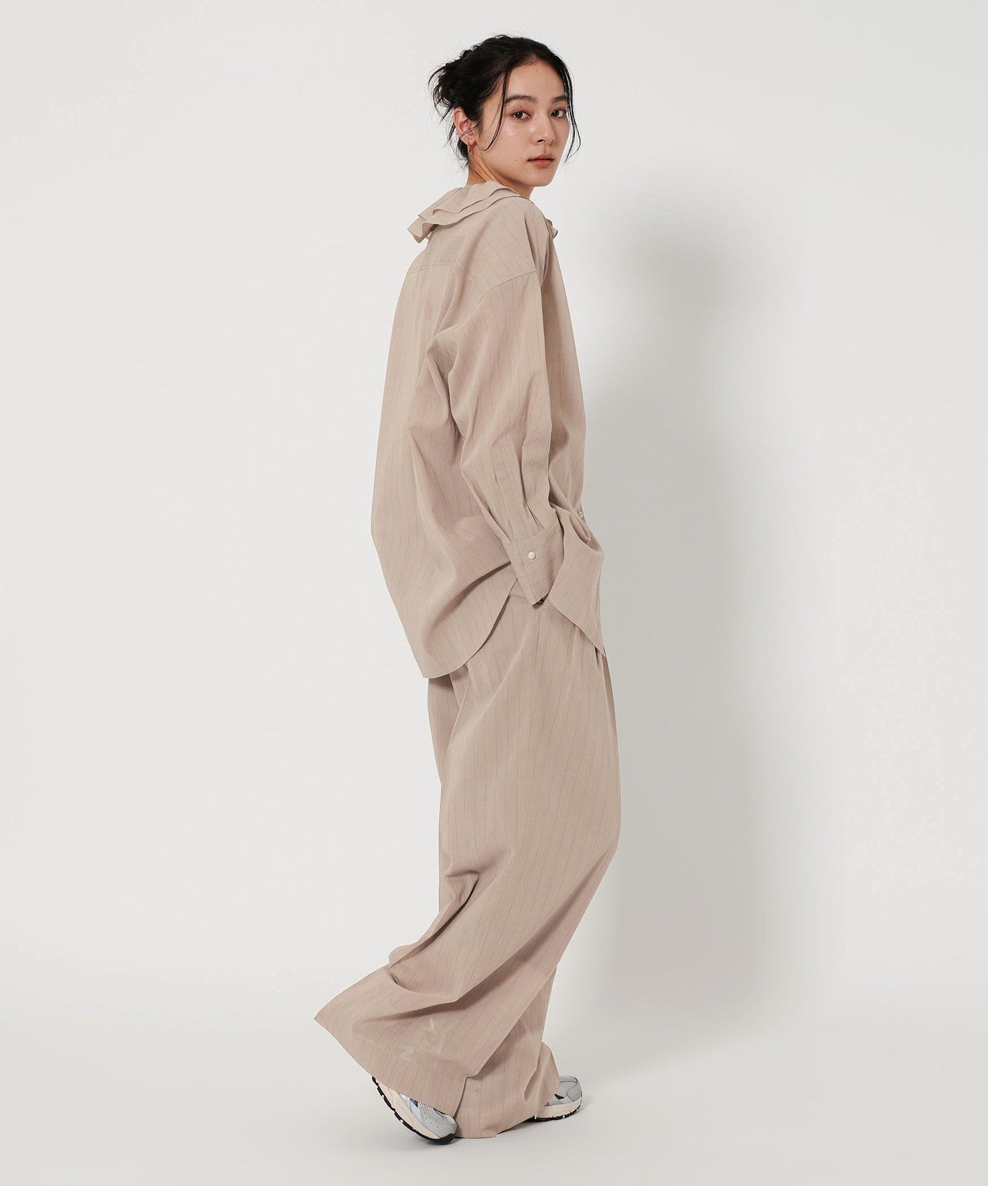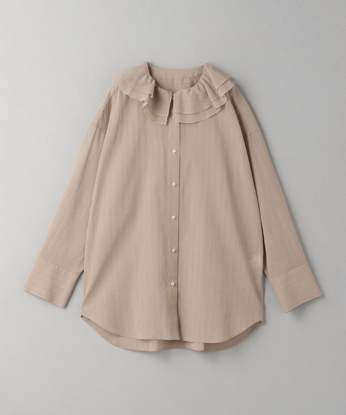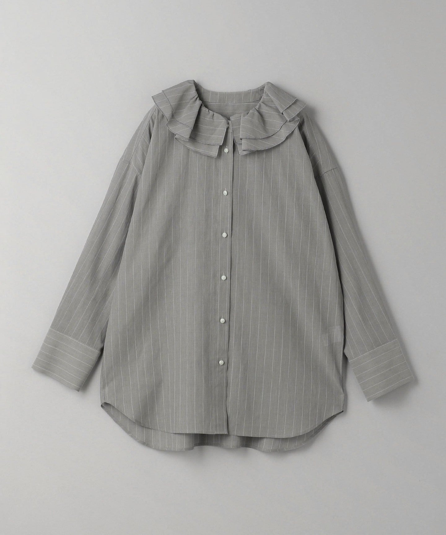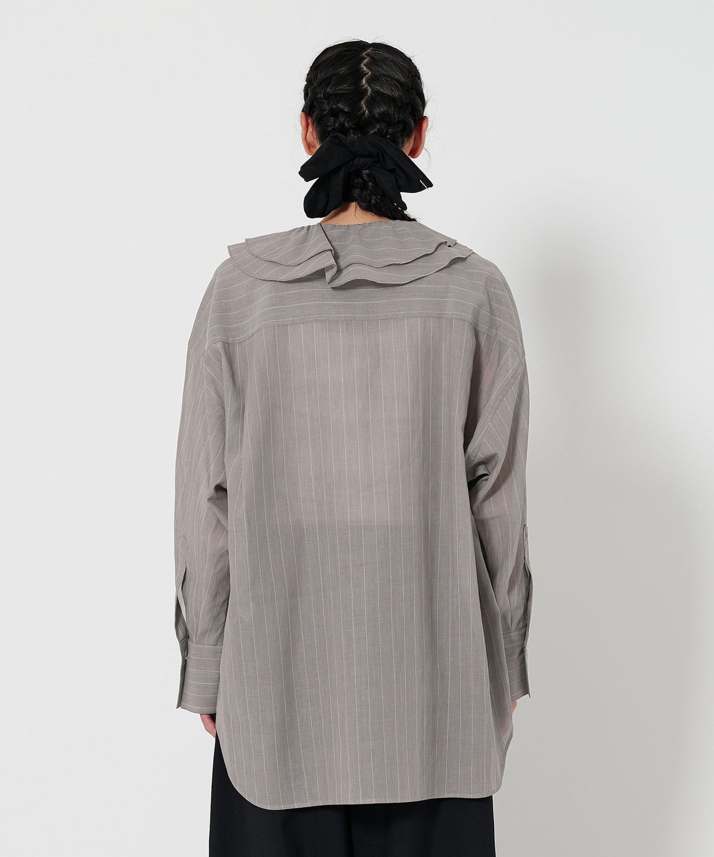 This is a ruffled shirt with thin stripes that give it a refined impression, asserting quiet elegance.