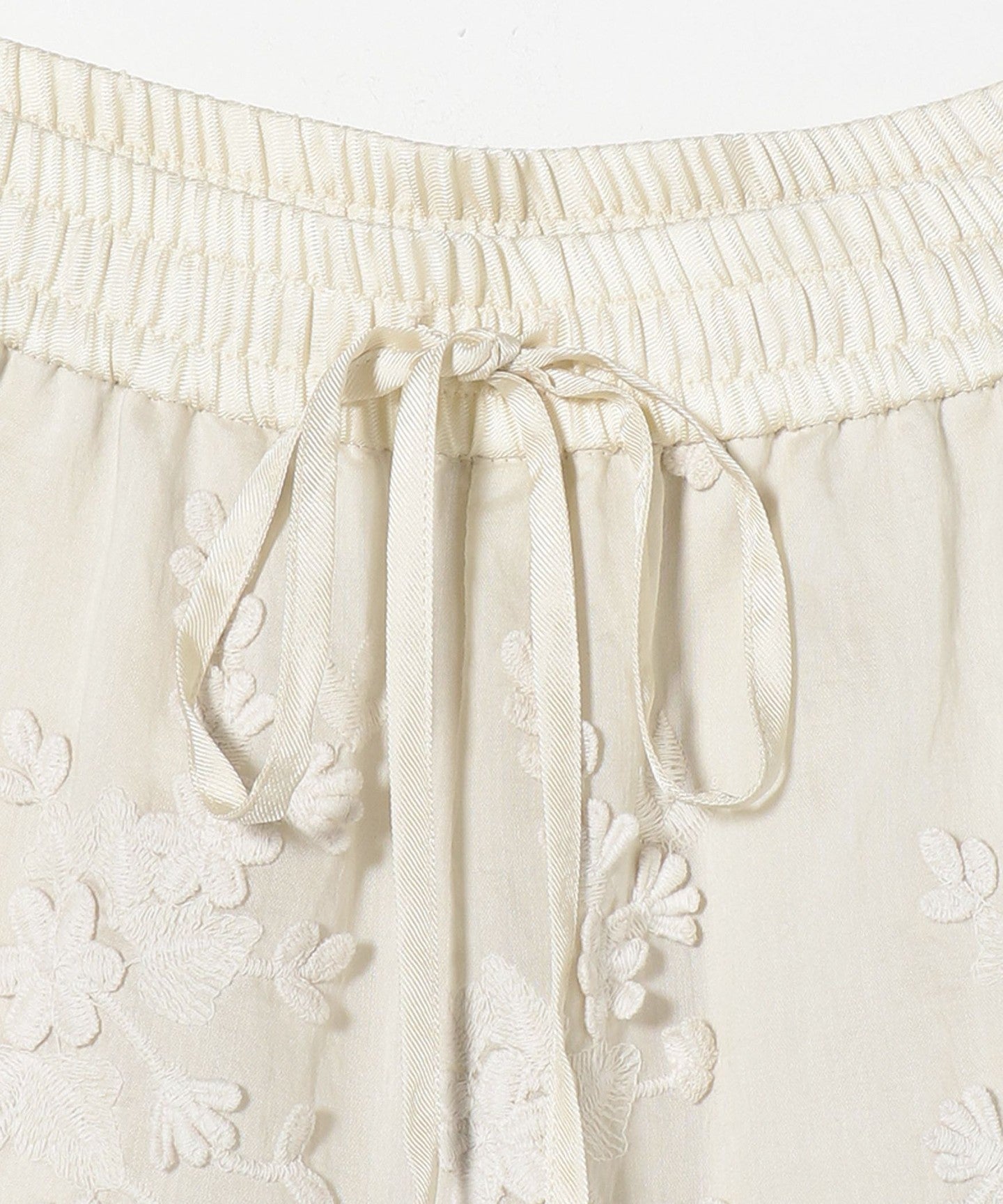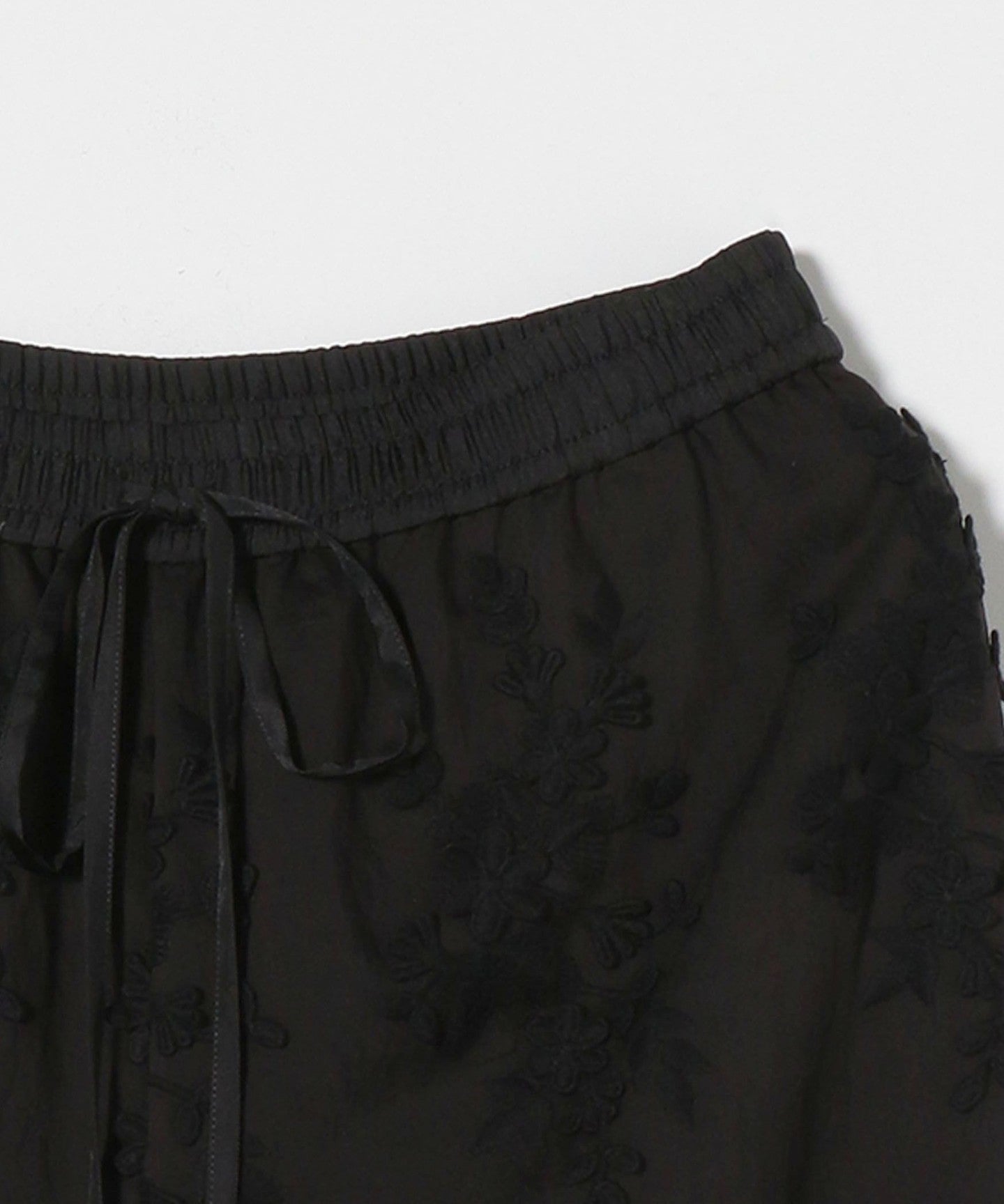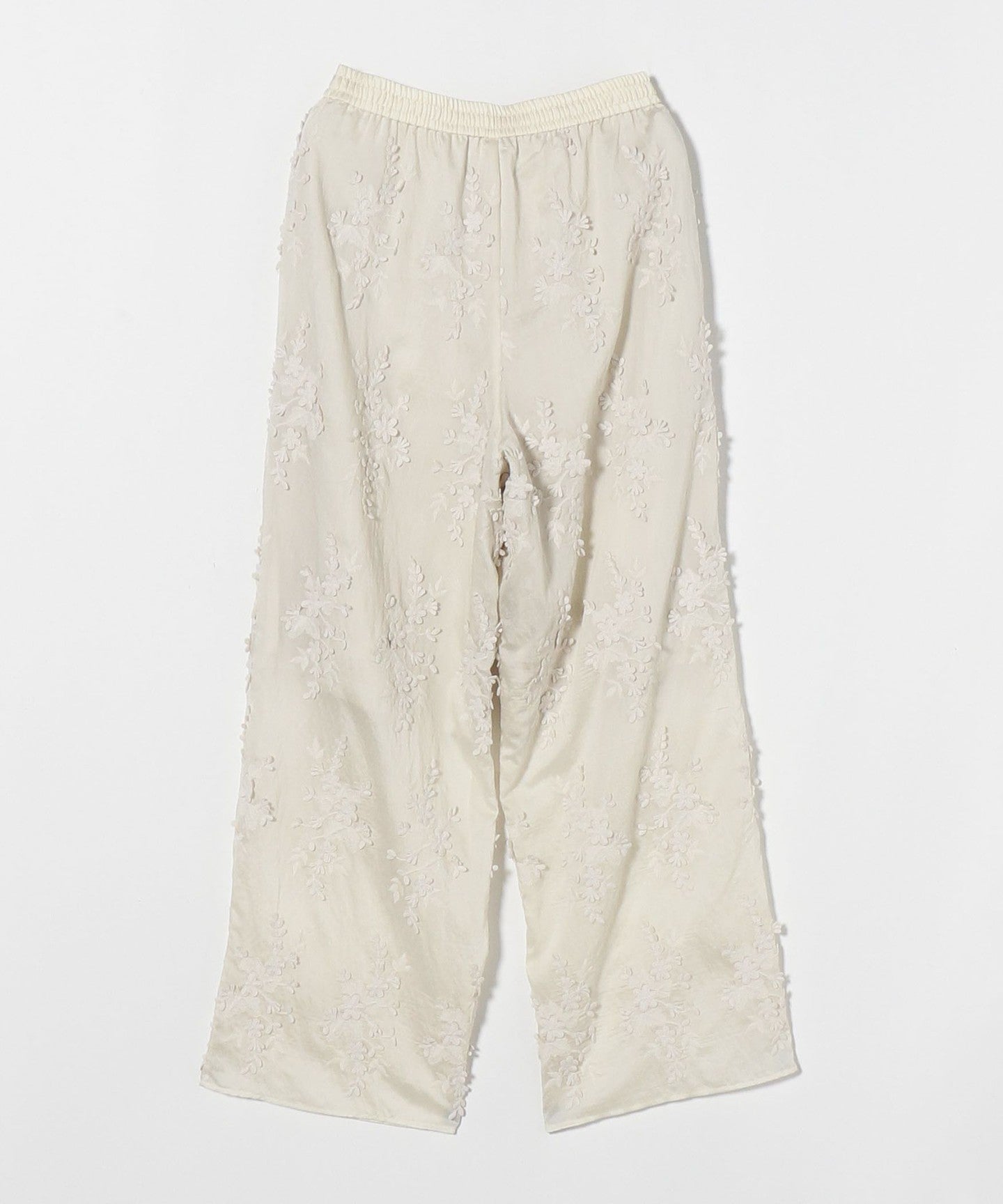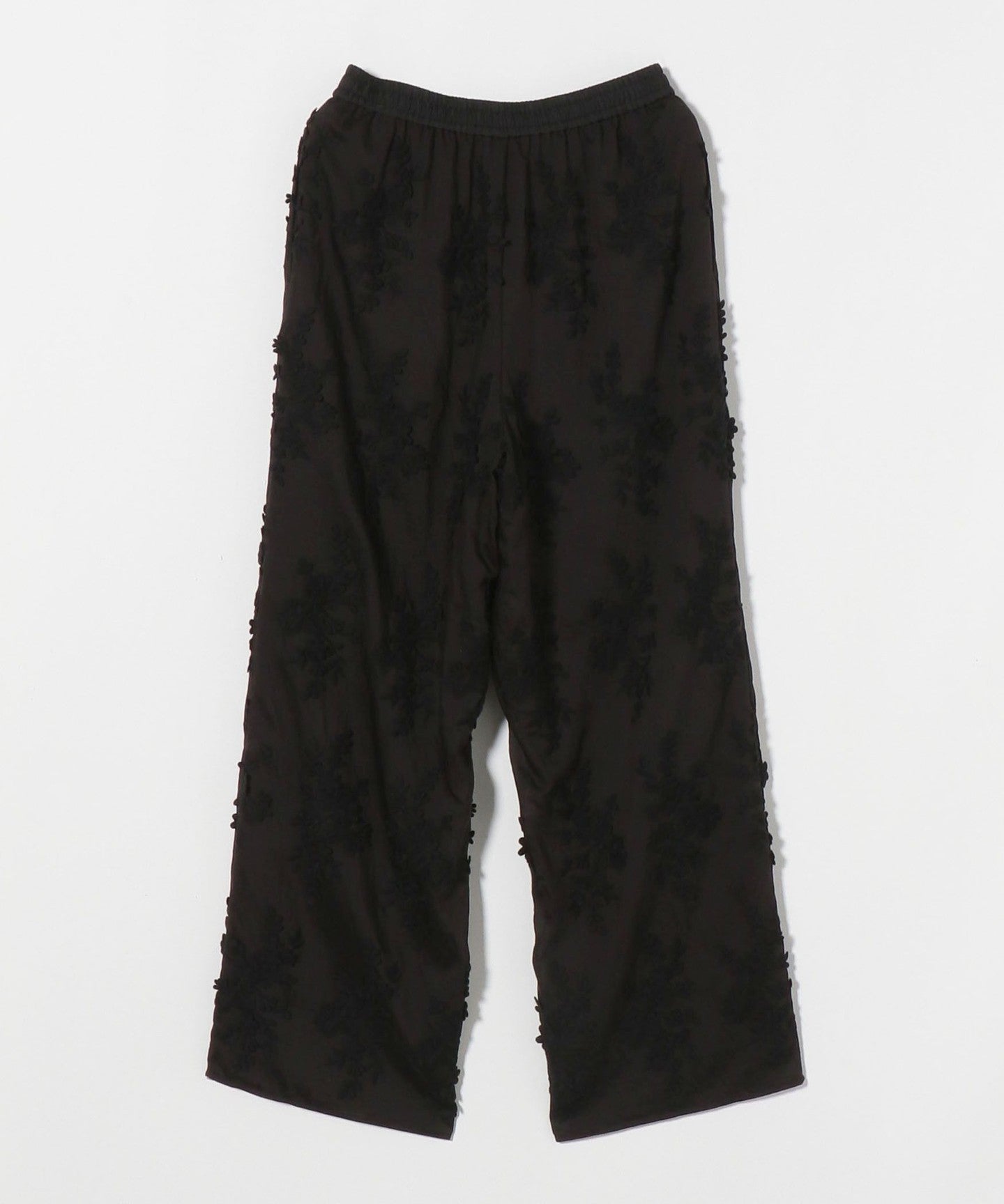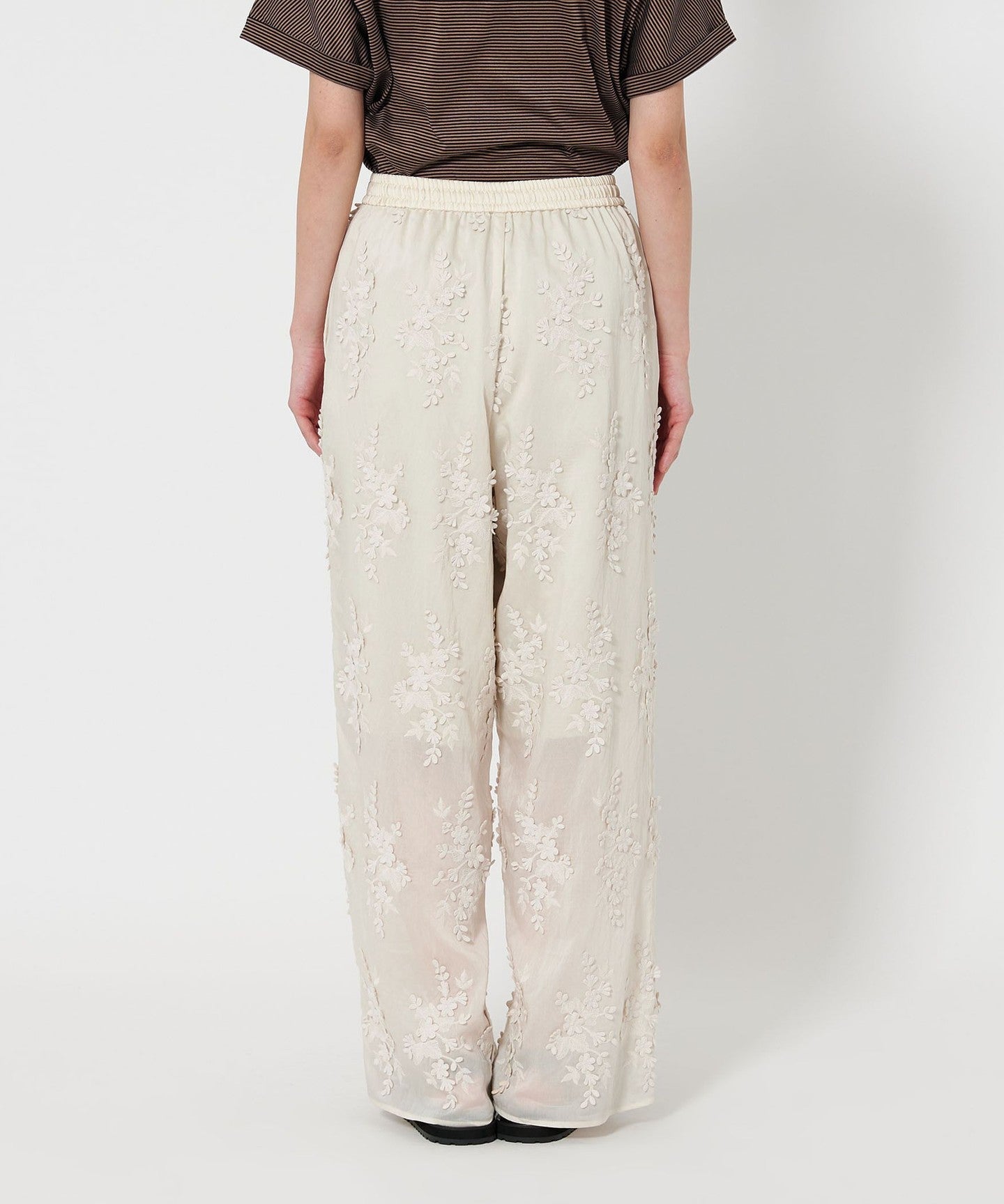 Sheer pants made from a distinctive material with three-dimensional embroidery all over.