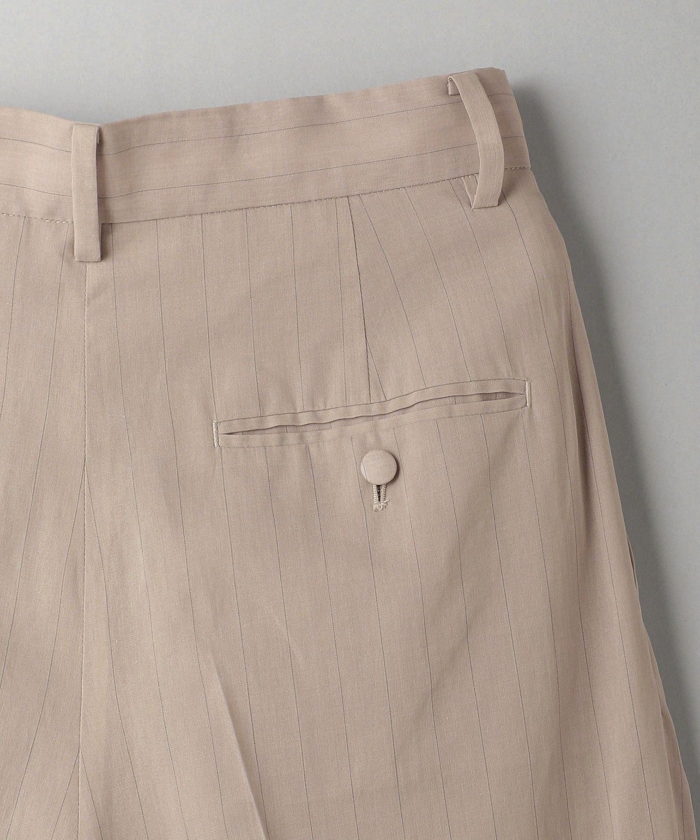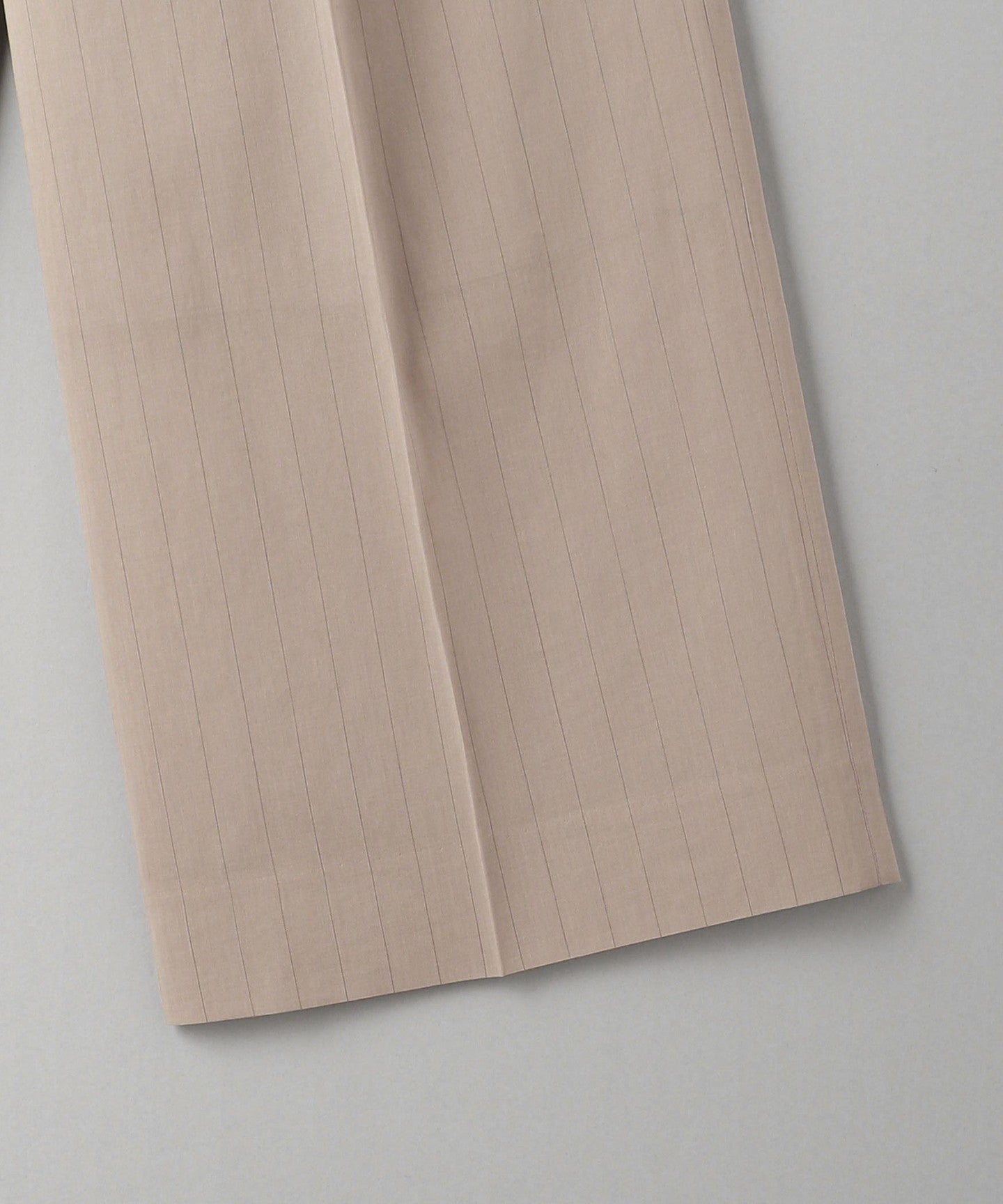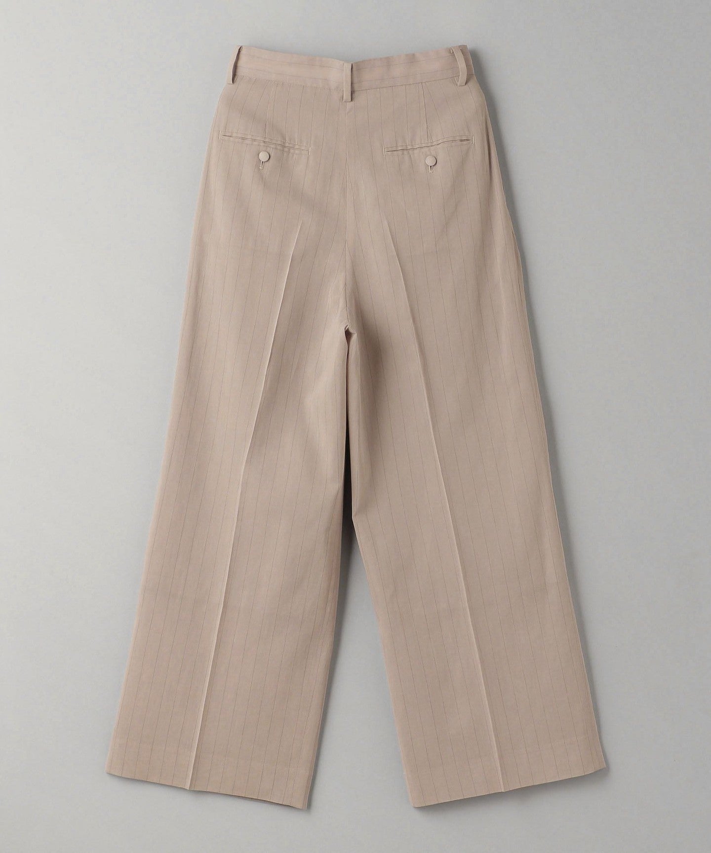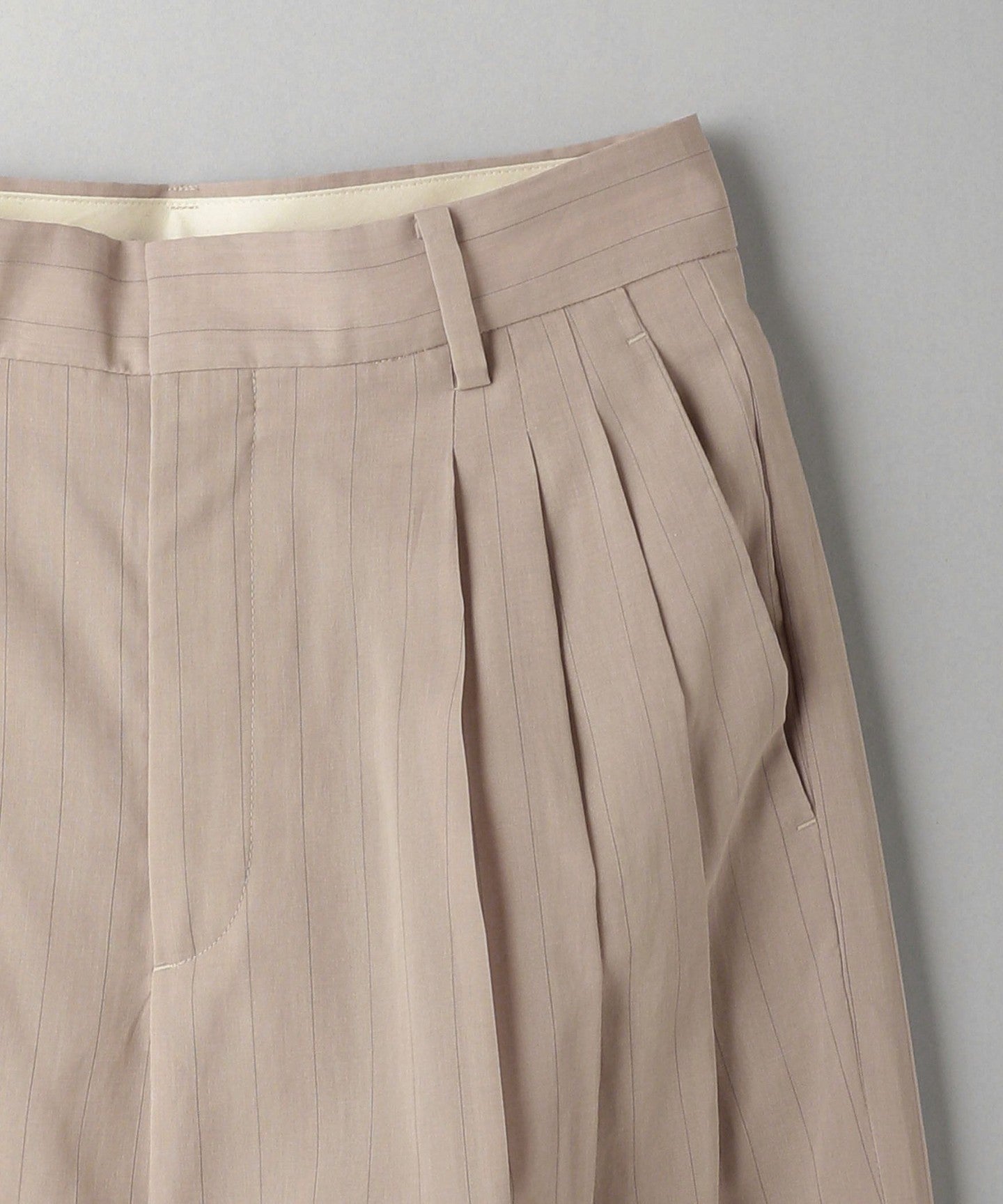 These are two-pleat pants with delicate stripes that give them an elegant look.
