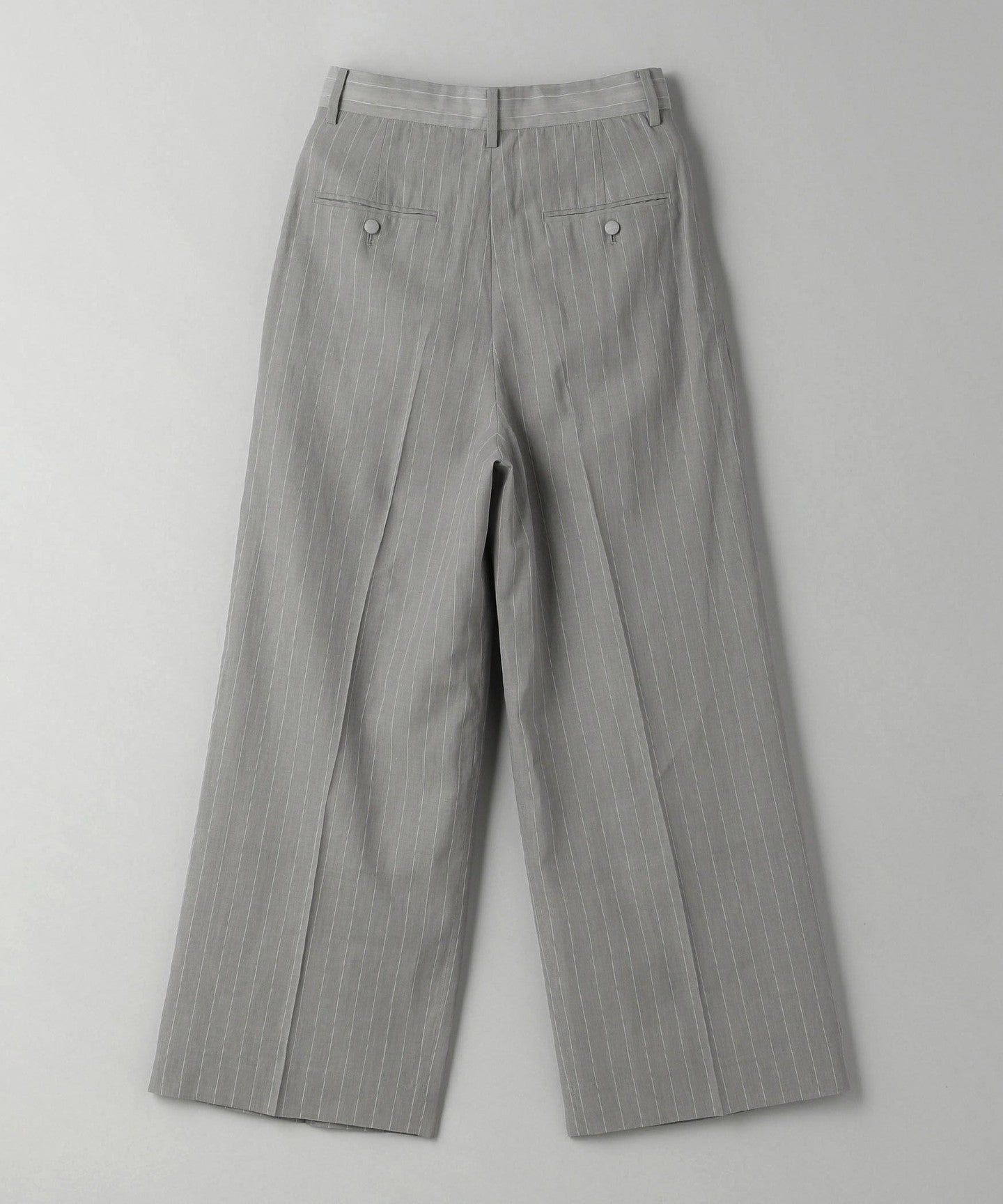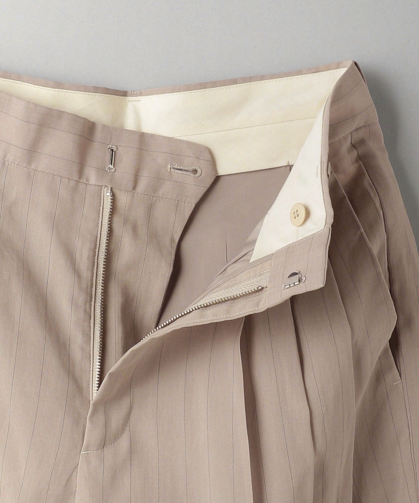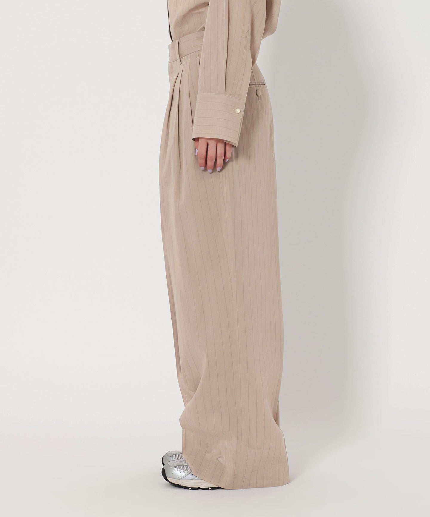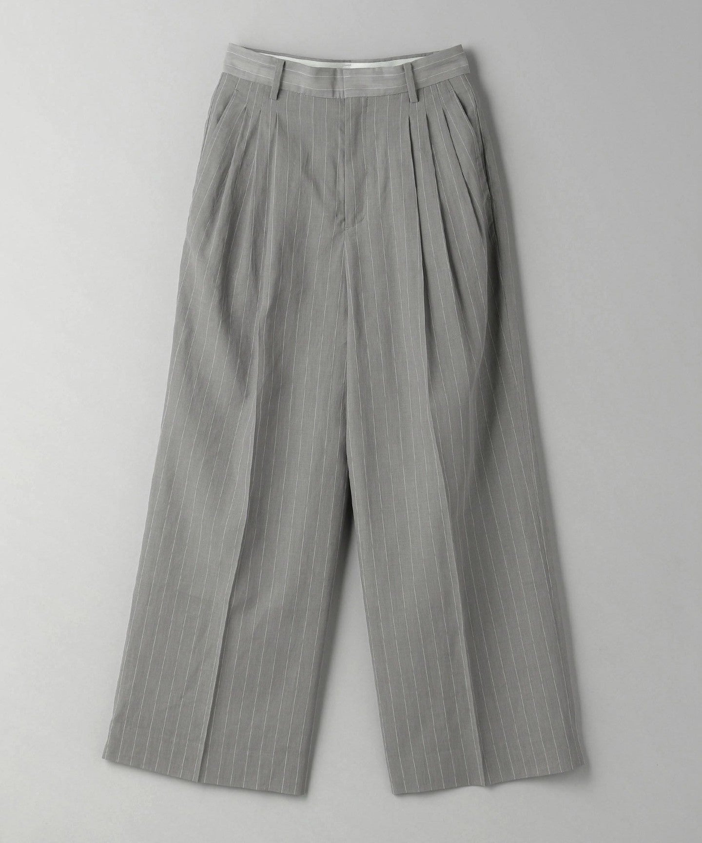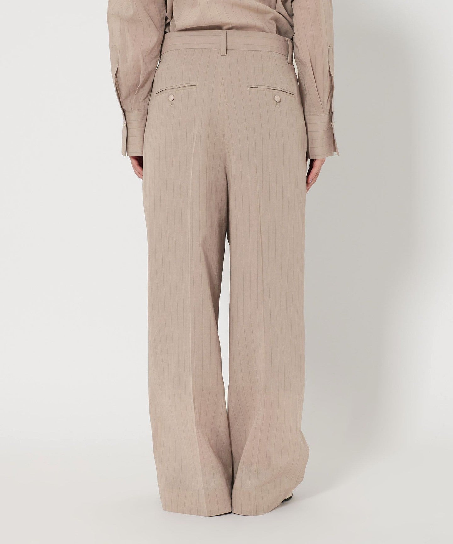 These are two-pleat pants with delicate stripes that give them an elegant look.