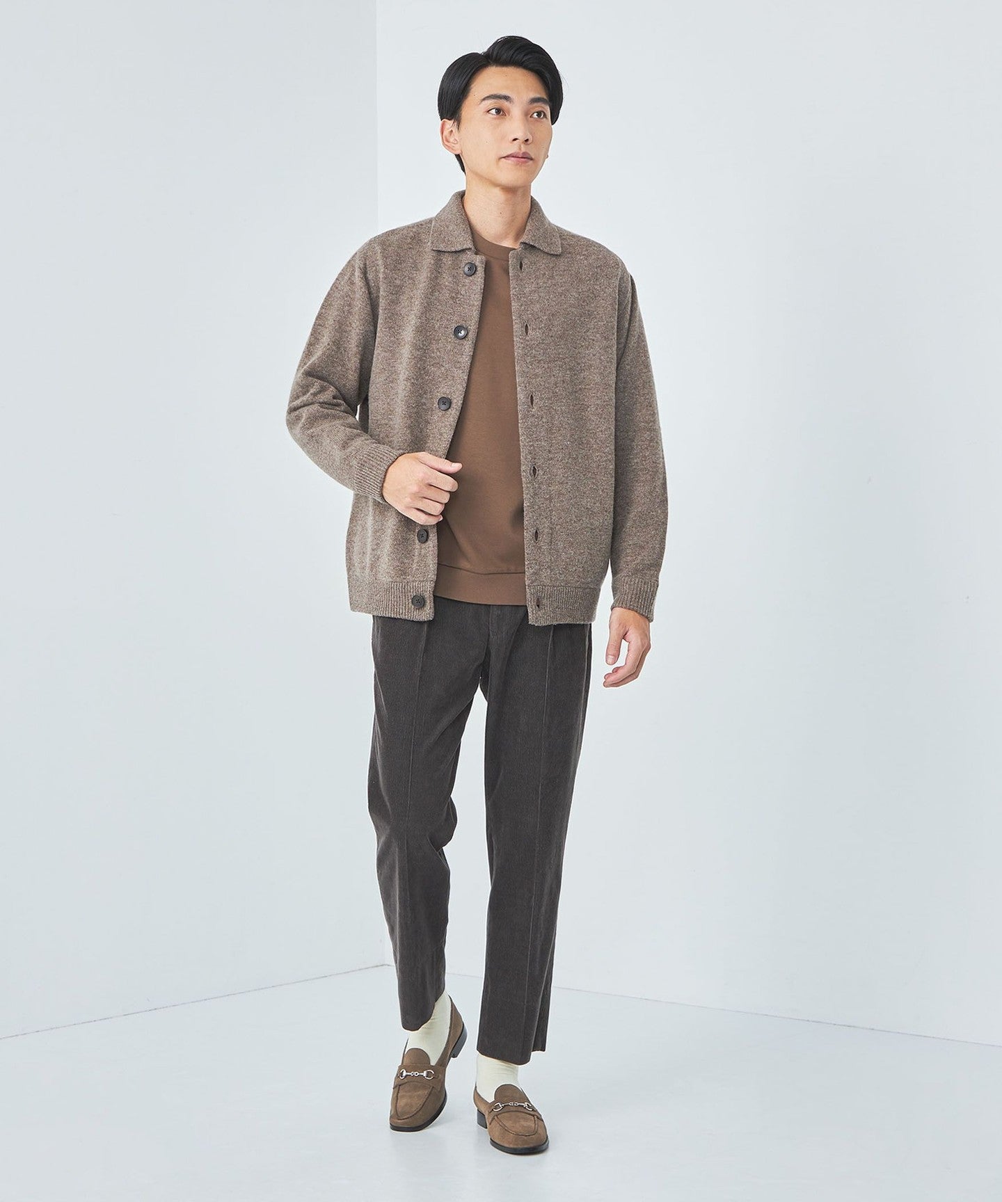 For bottoms, we recommend wearing wide corduroy pants to add a relaxed and seasonal feel.