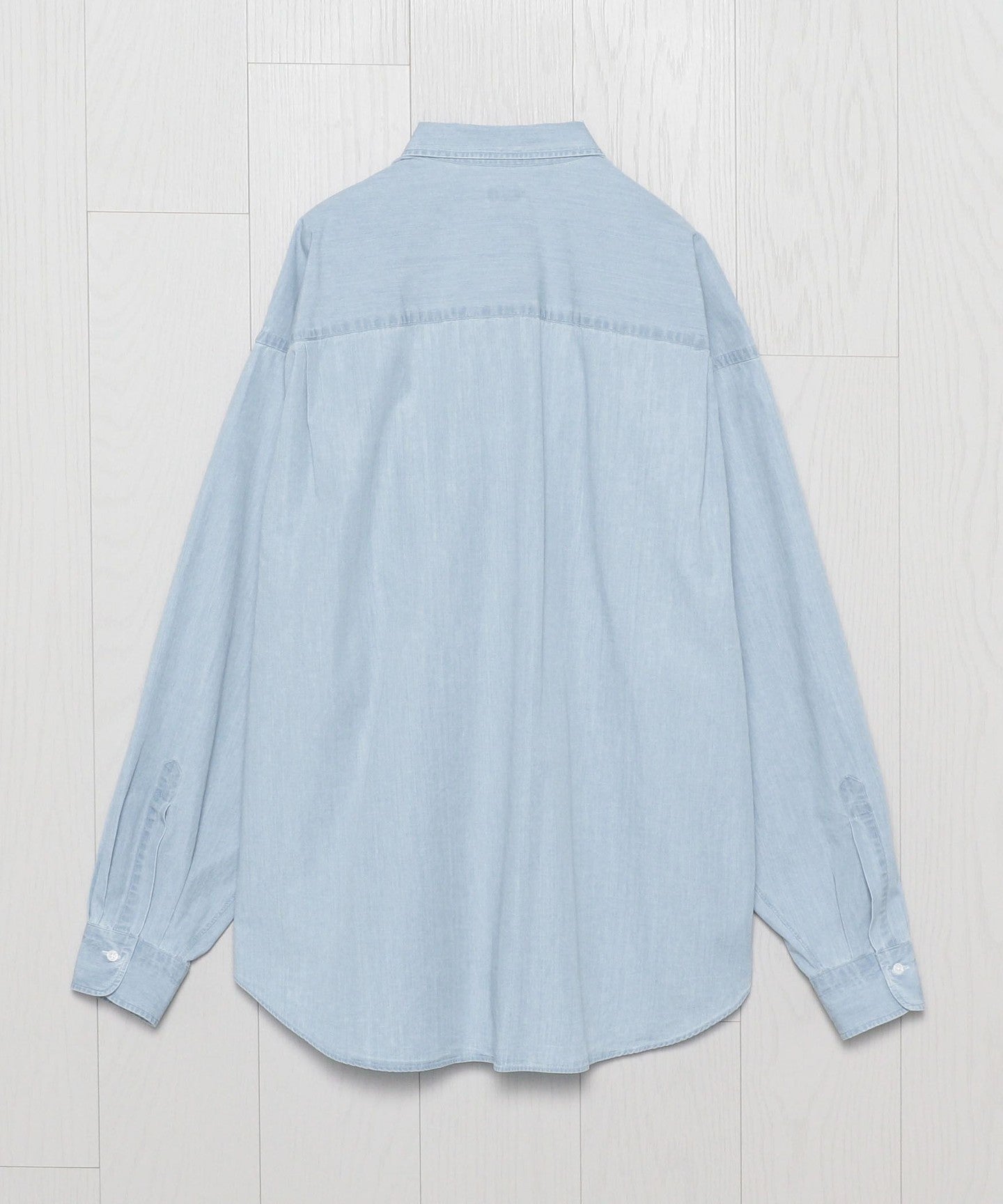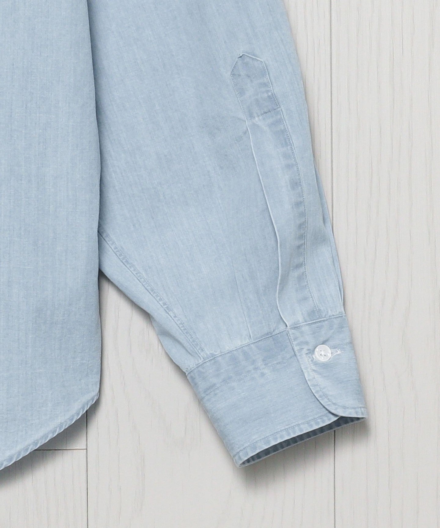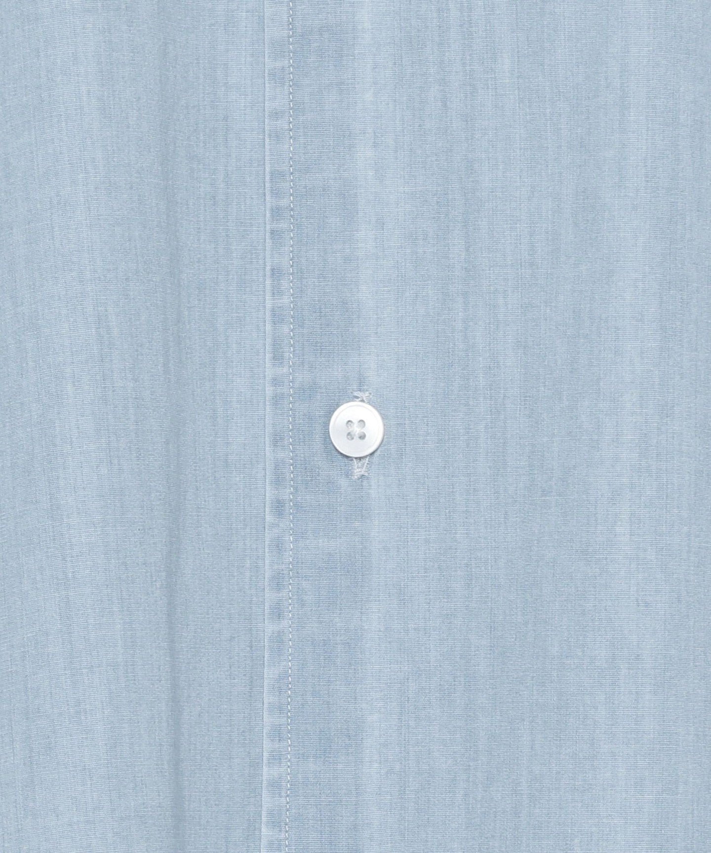 This light blue chambray shirt has been beautifully faded using a high-bleach process. It uses a finer count material than regular indigo chambray, creating a clear look with minimal unevenness. The white mother-of-pearl buttons also add a touch of elegance to the details. The refreshing color enhances a cool, refreshing feel, adding a touch of seasonal style. This high-quality, elegant casual shirt is a recommended choice for a sophisticated urban style.