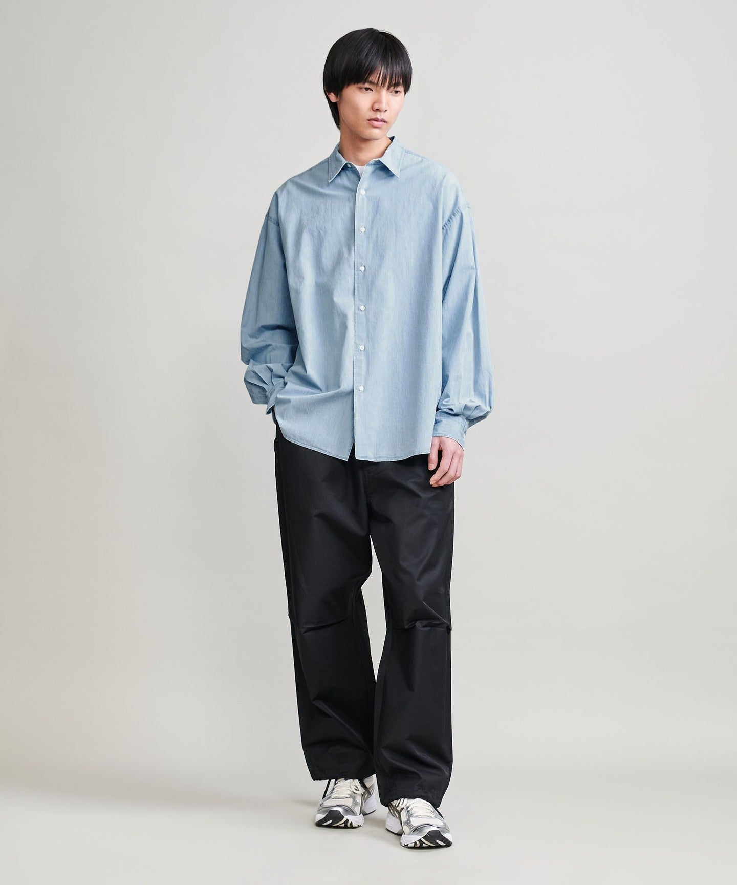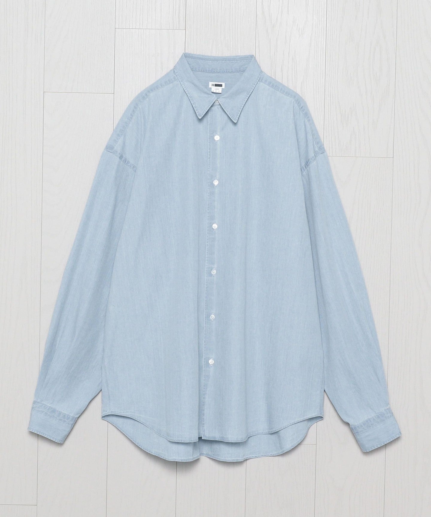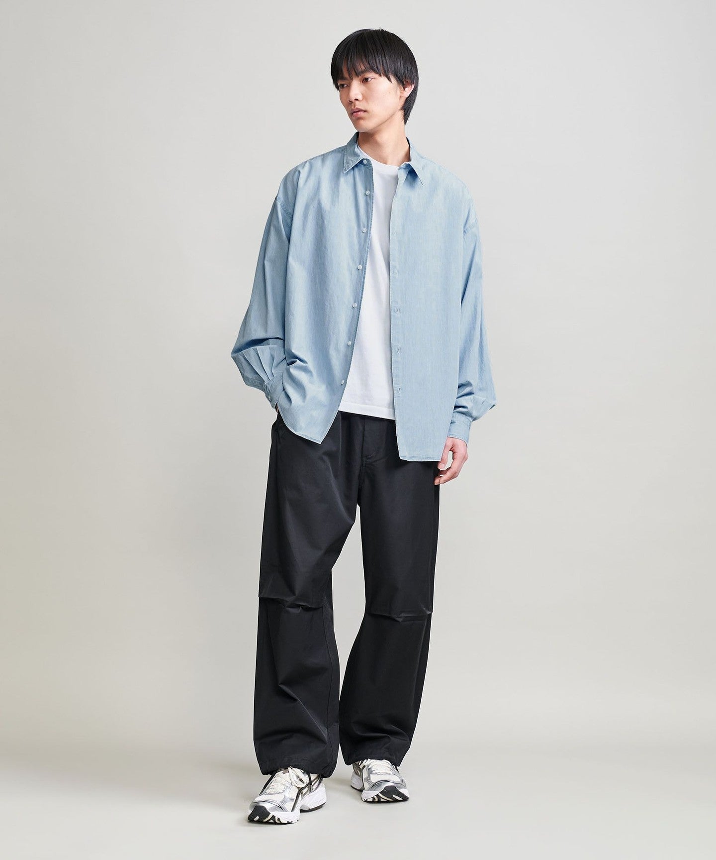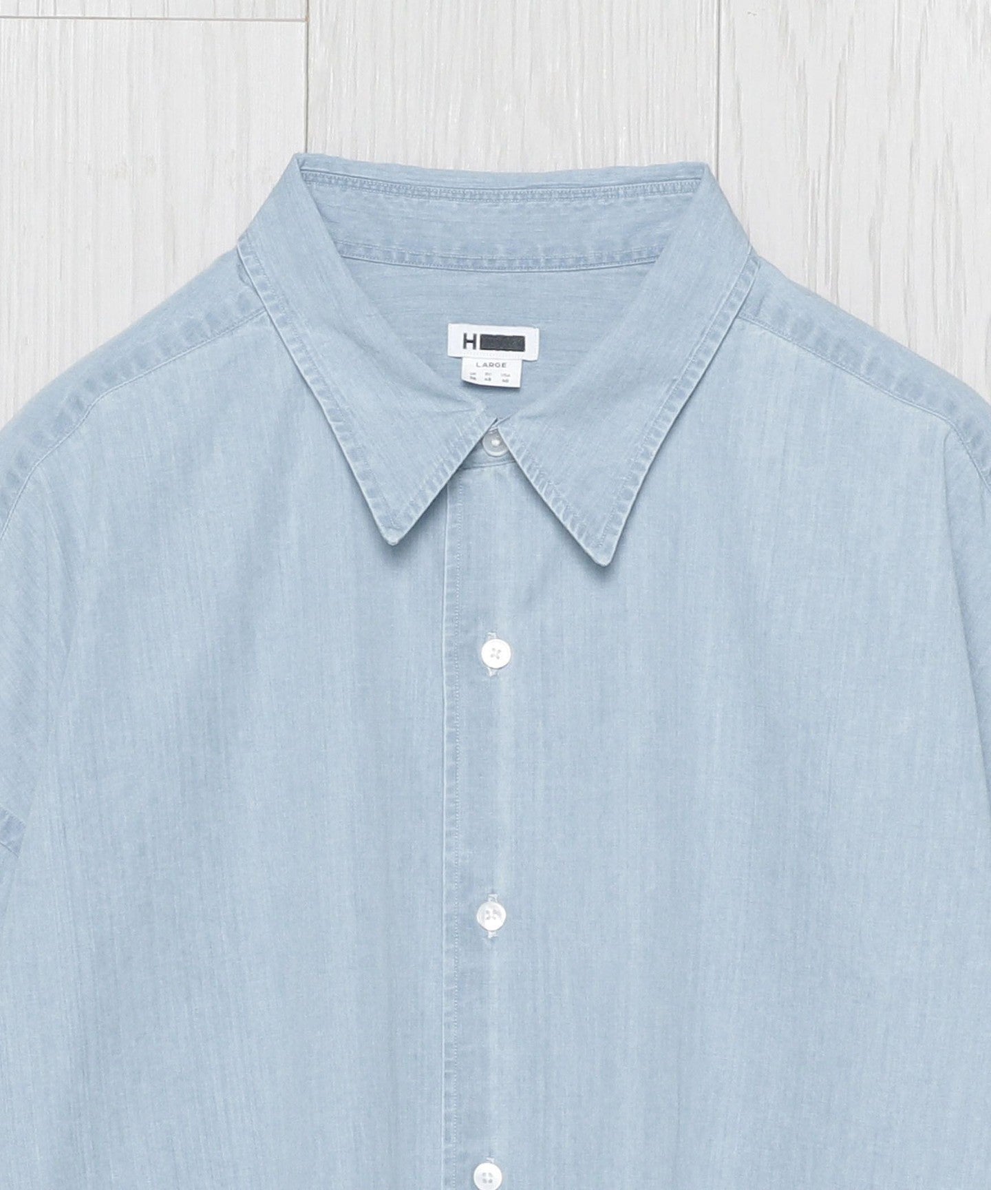 This light blue chambray shirt has been beautifully faded using a high-bleach process. It uses a finer count material than regular indigo chambray, creating a clear look with minimal unevenness. The white mother-of-pearl buttons also add a touch of elegance to the details. The refreshing color enhances a cool, refreshing feel, adding a touch of seasonal style. This high-quality, elegant casual shirt is a recommended choice for a sophisticated urban style.
