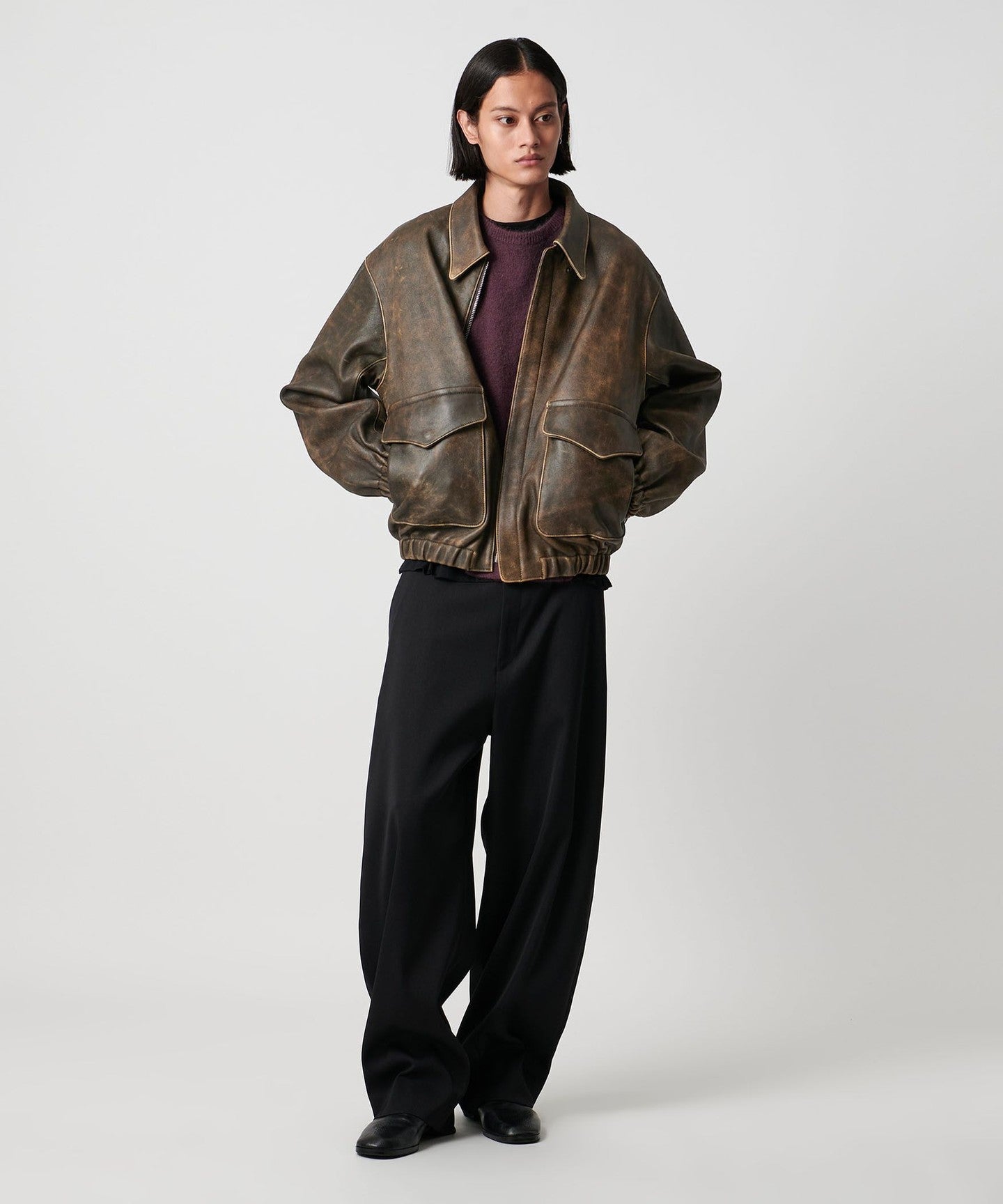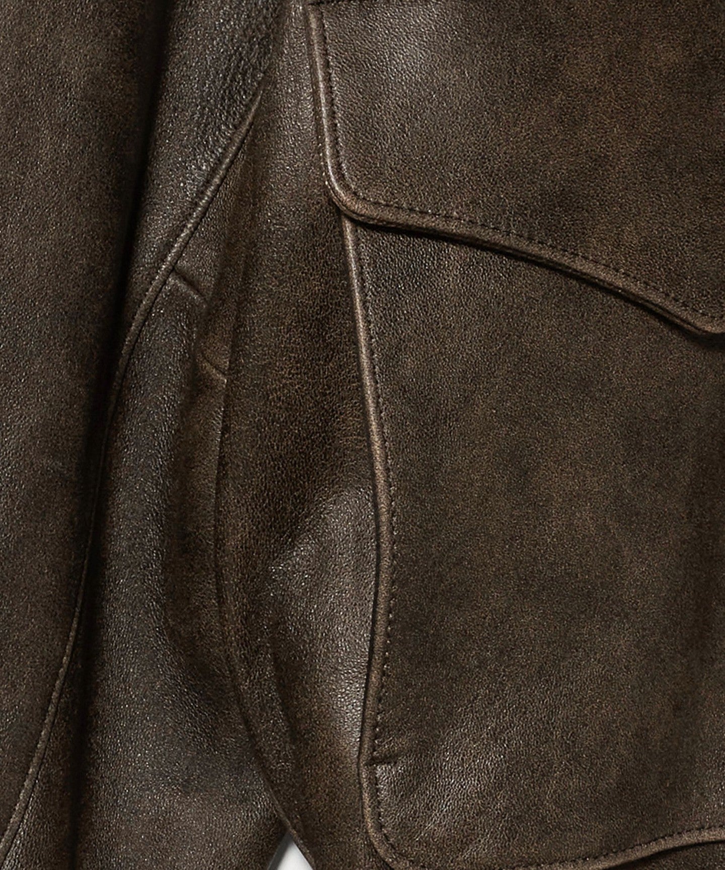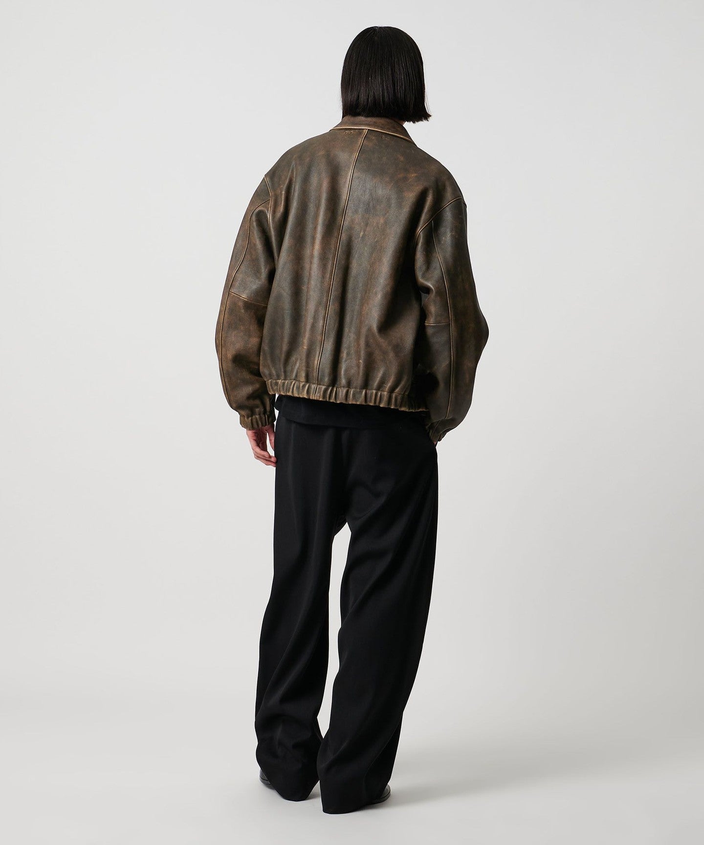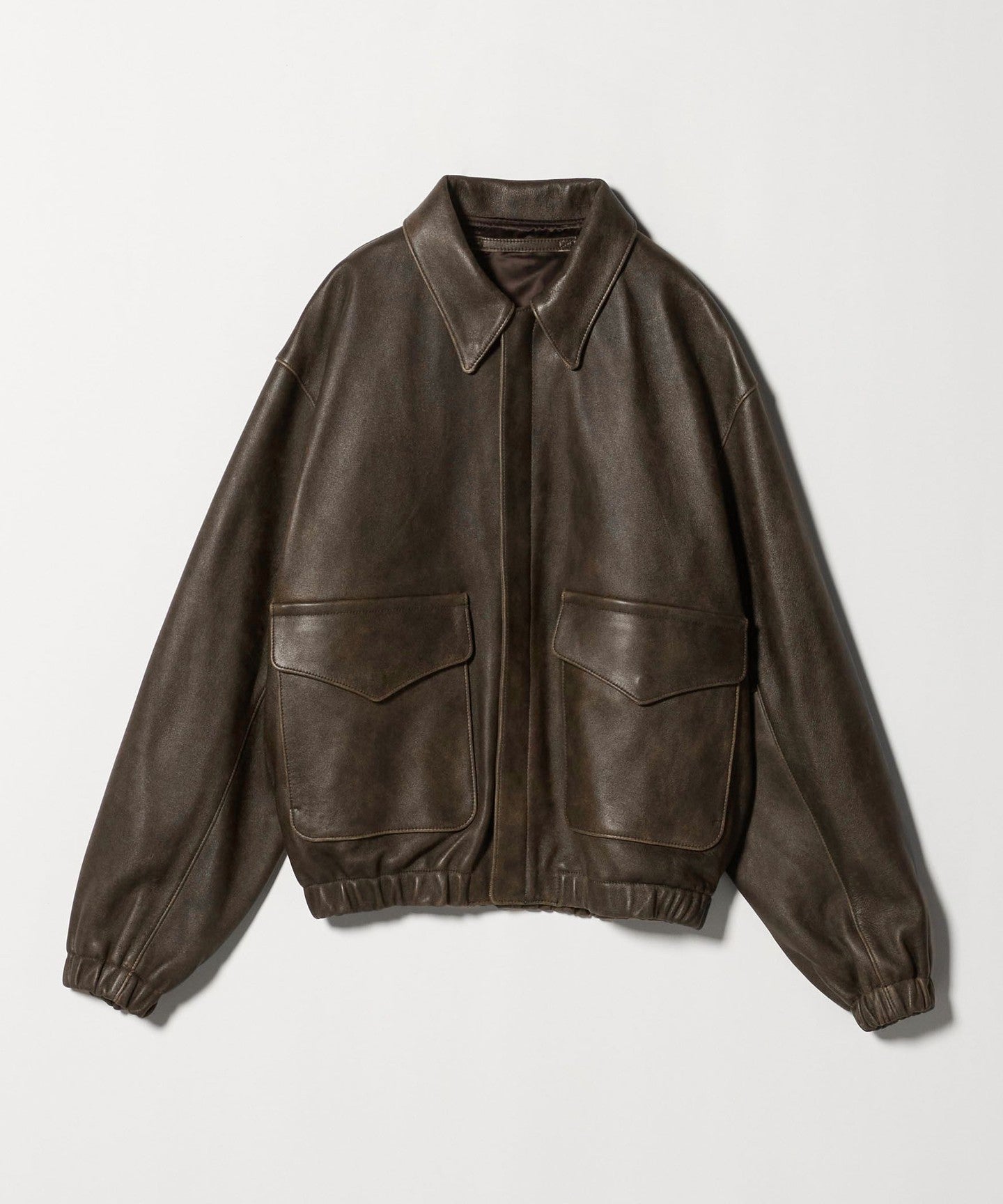 This leather jacket is a modern take on the US military's A-2 flight jacket. Crafted from premium Turkish leather, it's tanned and dyed by a Turkish tanner. The semi-vegetable tanning process creates a distinctive texture and luster. After a beige base dye, a black pigment is applied to the surface, which is then washed to create an uneven, vintage look. The hem and cuffs feature luxurious shirring ribbing made from the same leather, creating a more modern impression than knit ribbing. The refined look adds a touch of elegance, while the compact collar and RACCAGNI zipper add a refined accent. This versatile piece complements your everyday wardrobe while elevating your smart casual style.