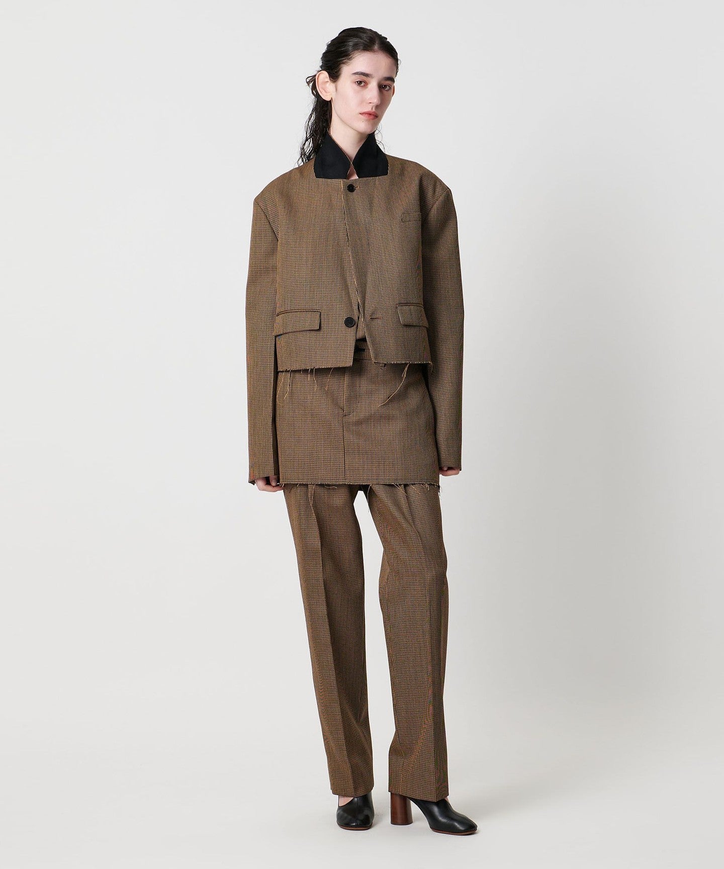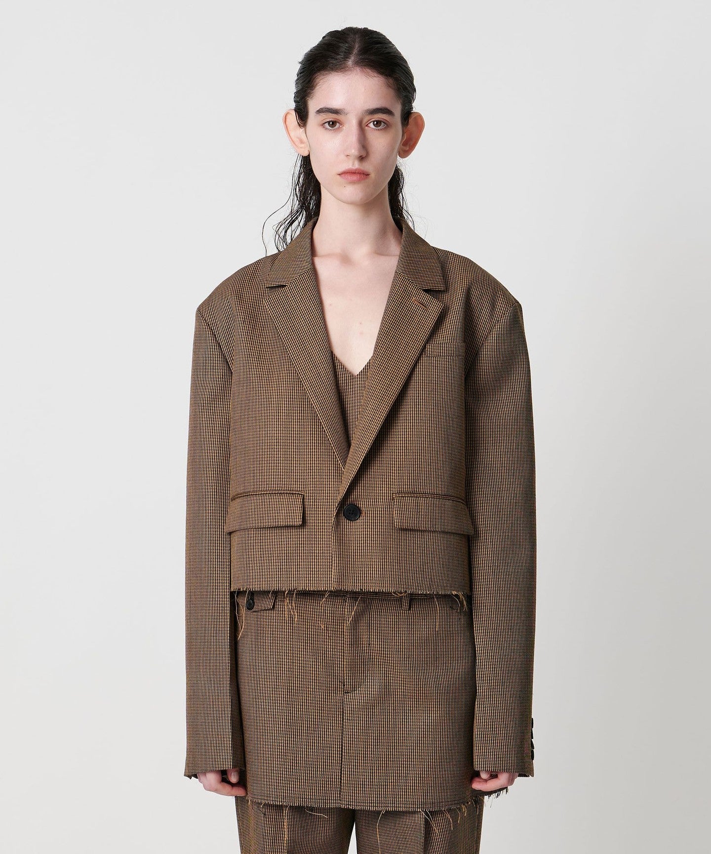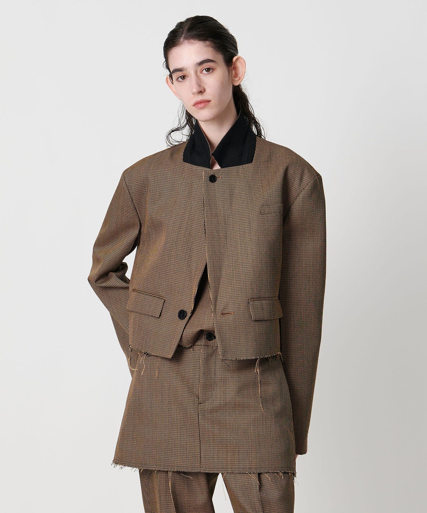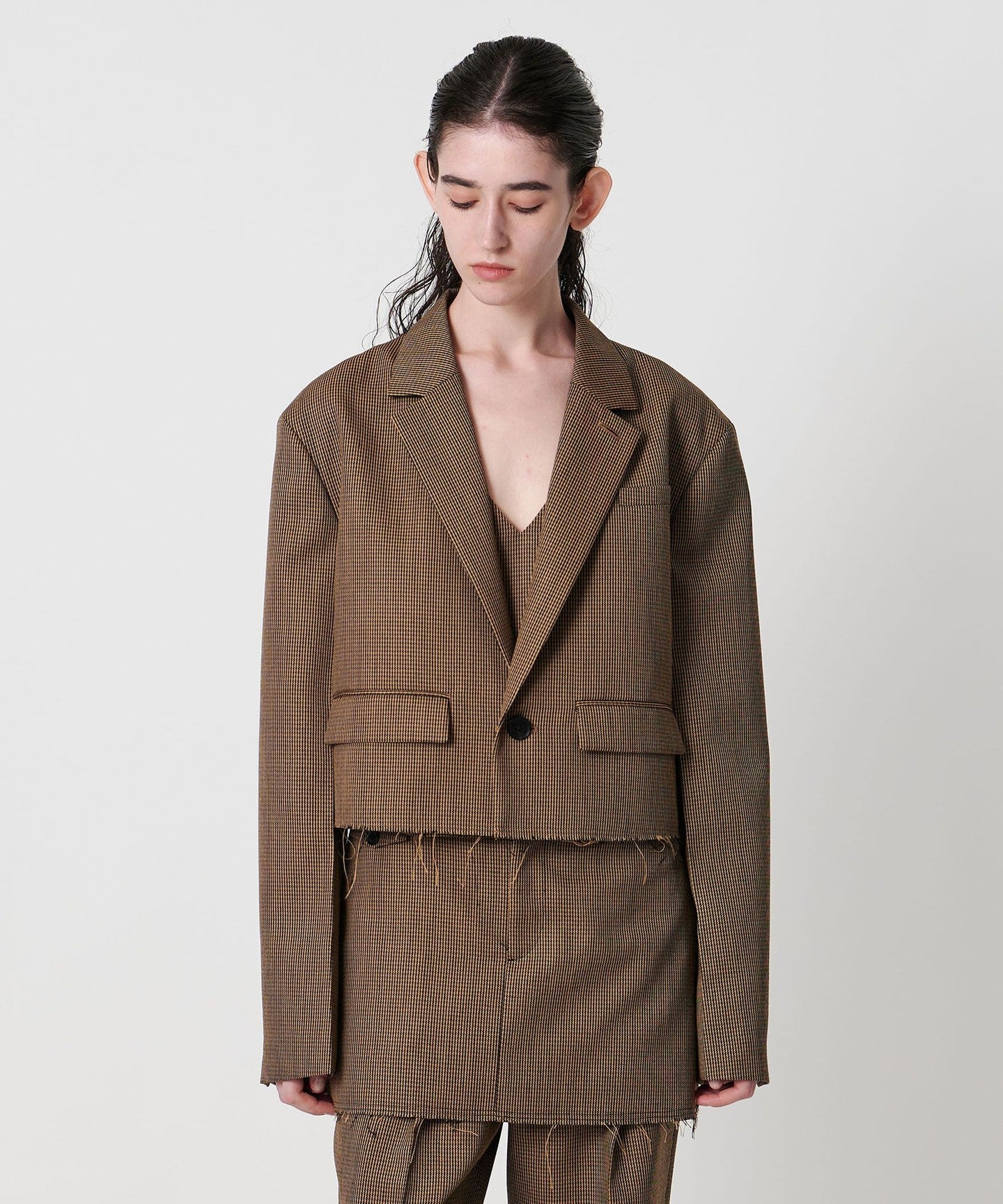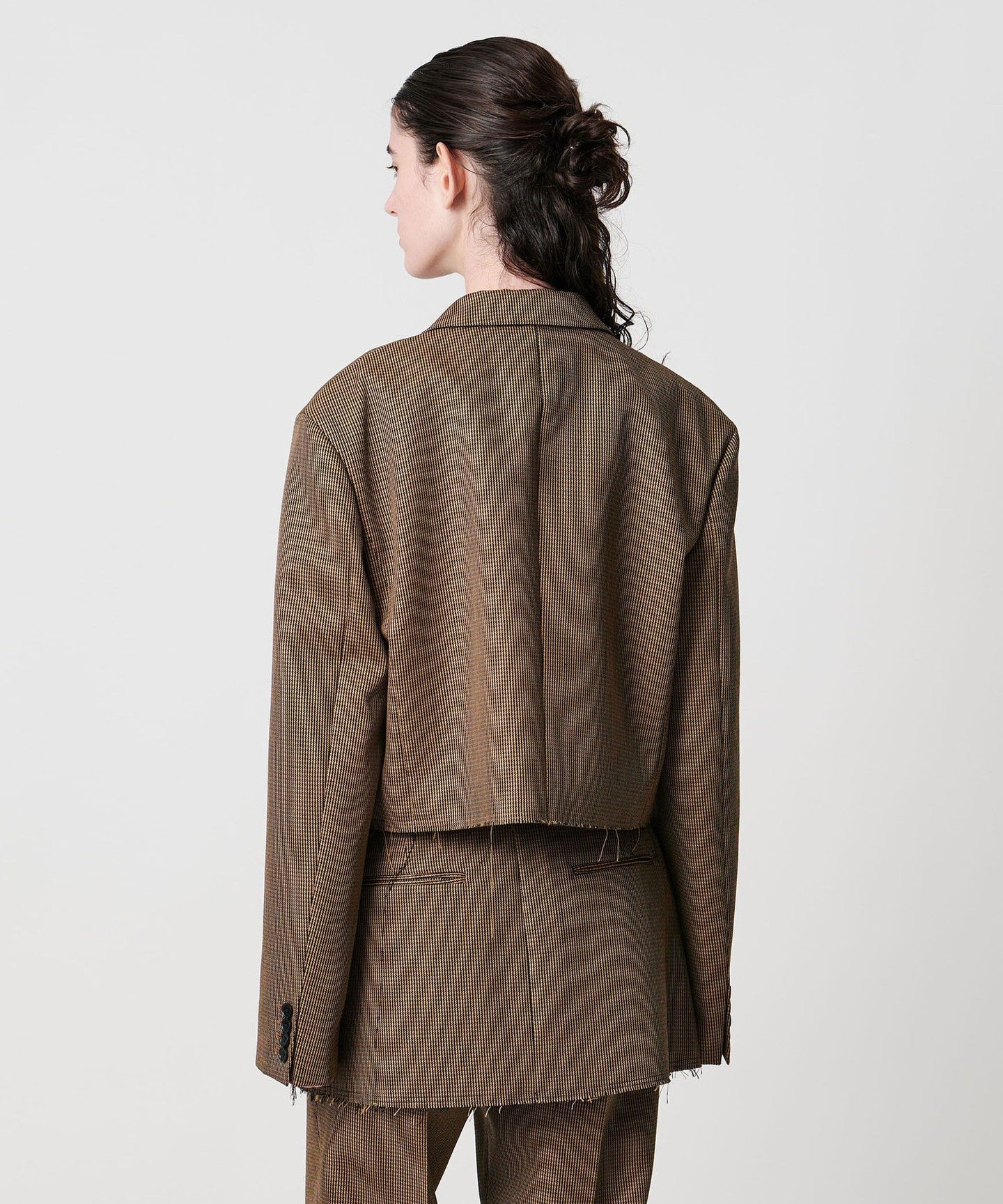 A tailored jacket with a masculine wide silhouette and short length.