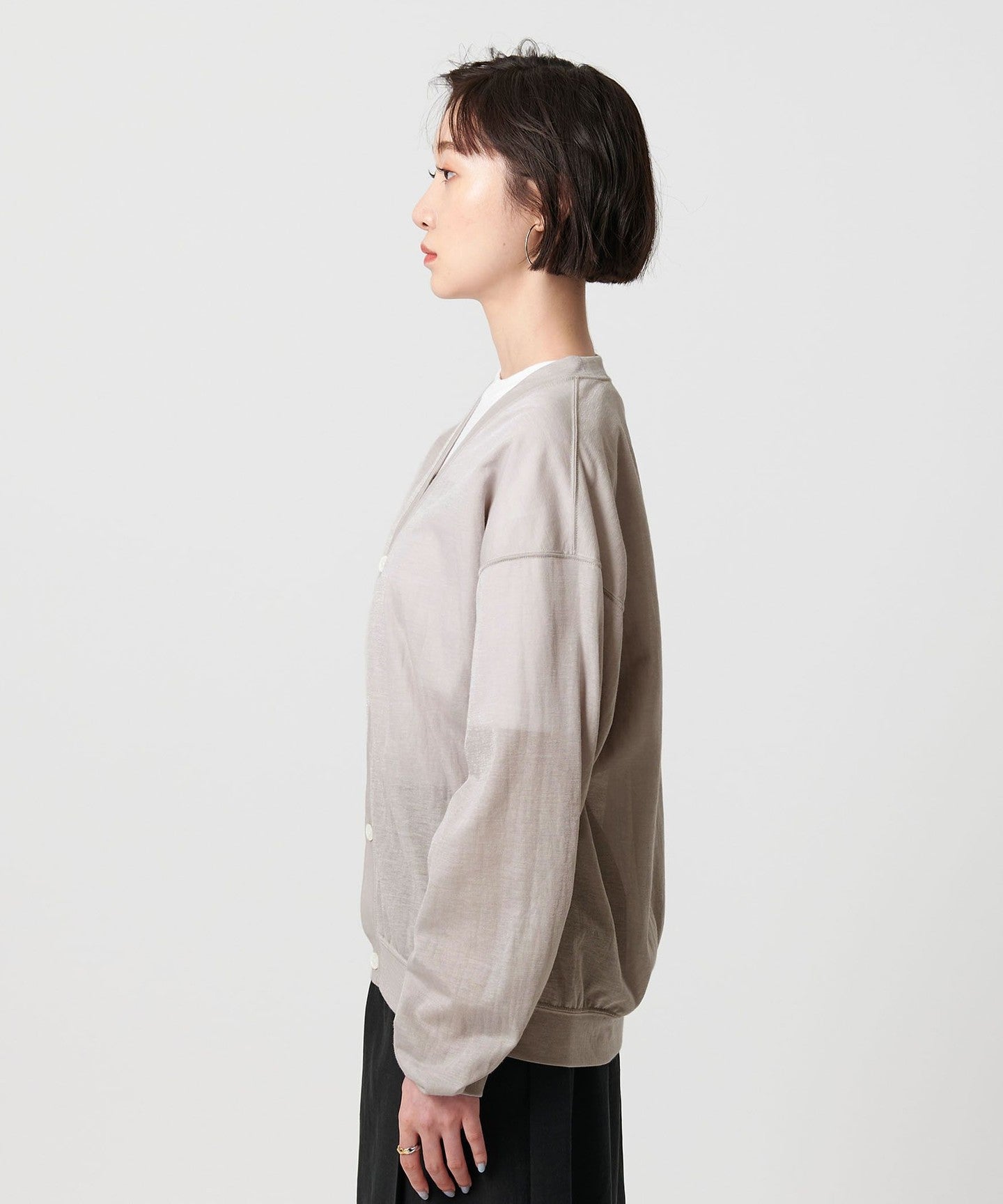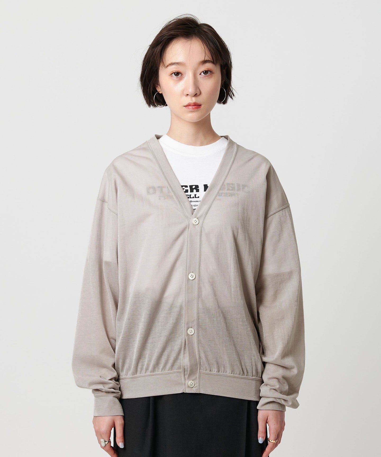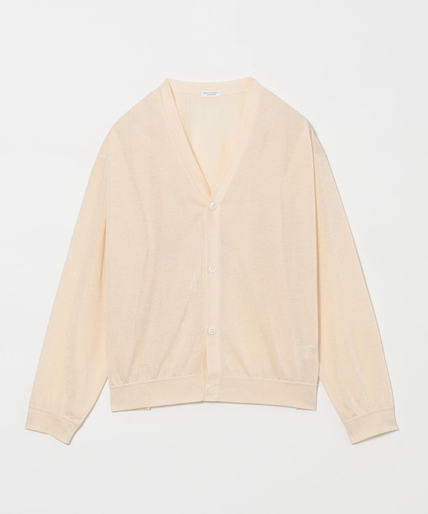 A cardigan with a rounded silhouette made from sparkling sheer material