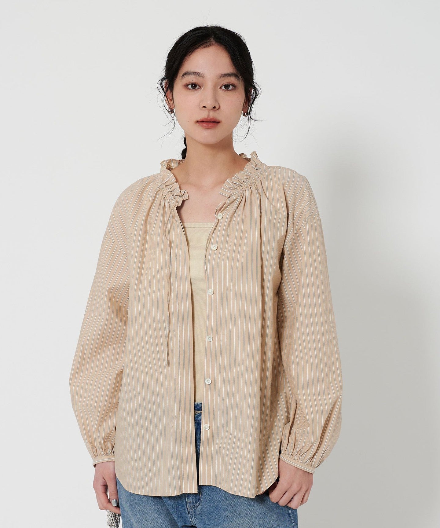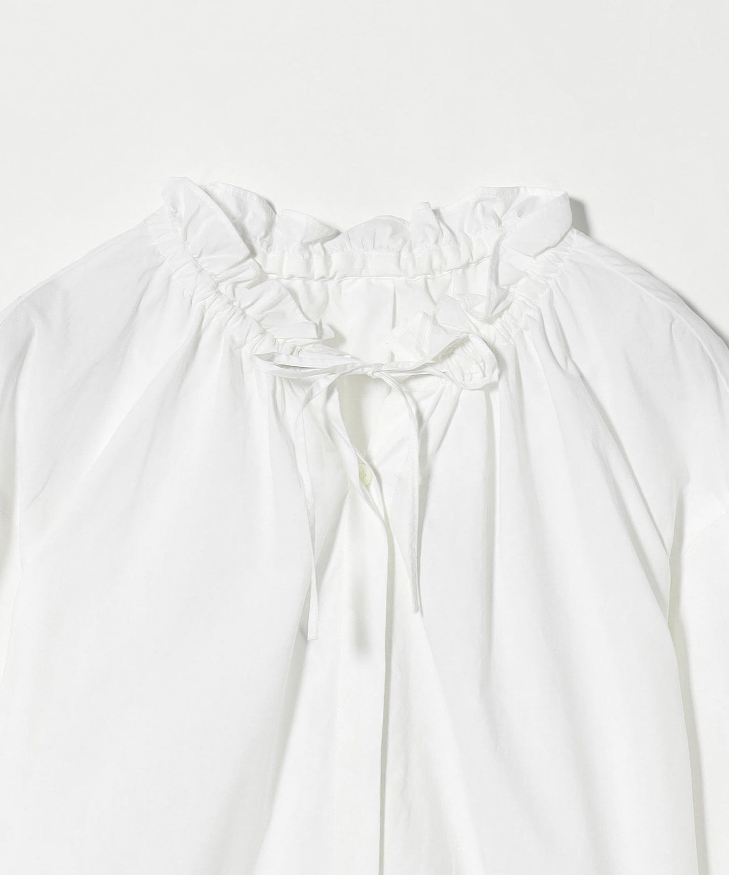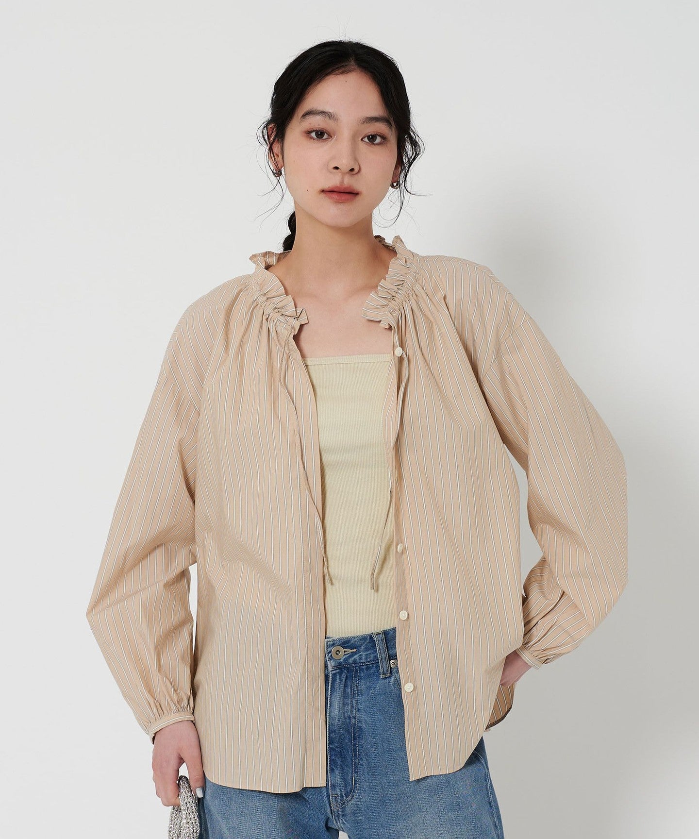 A gathered blouse made from a refreshing material with a subdued sweetness