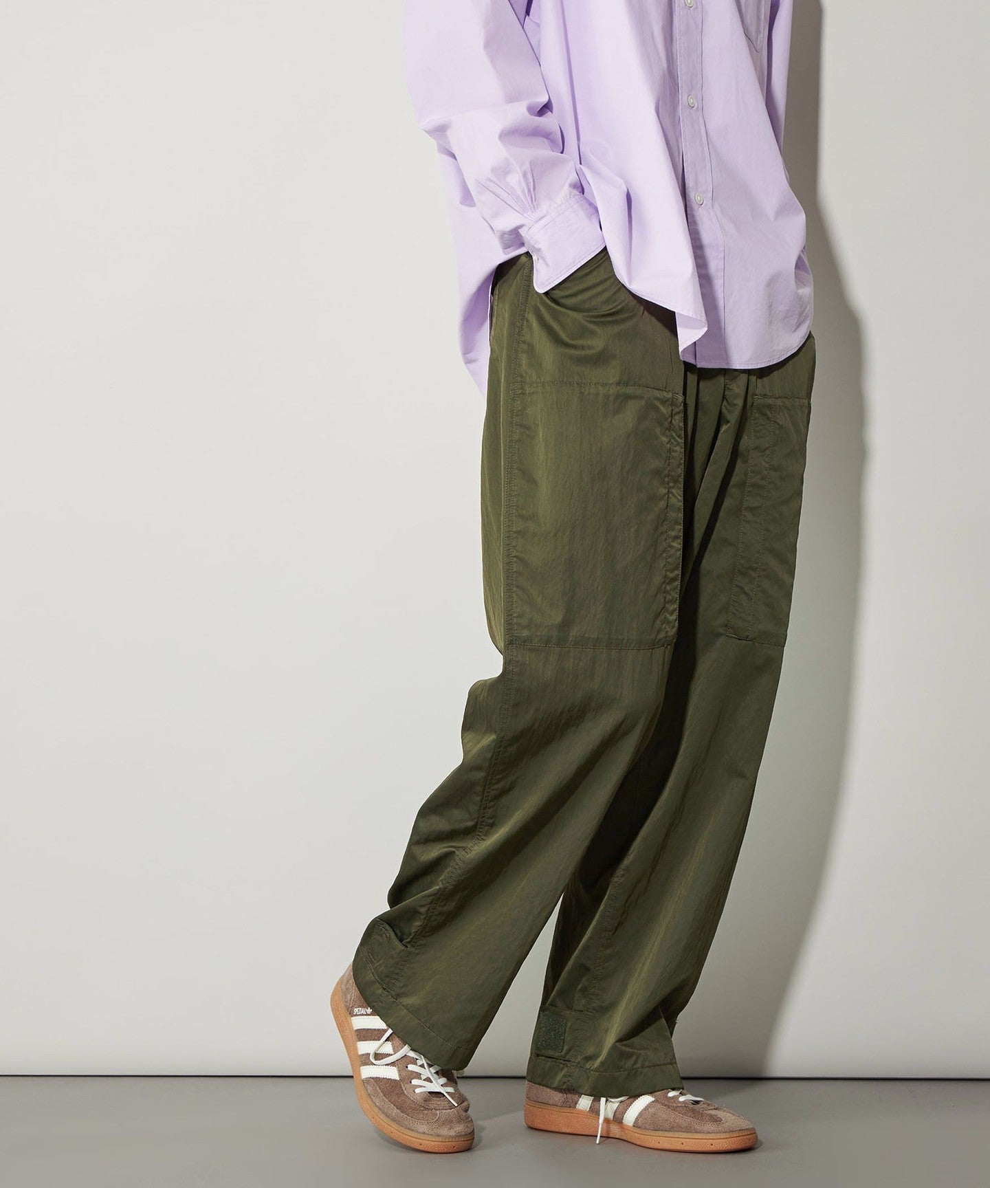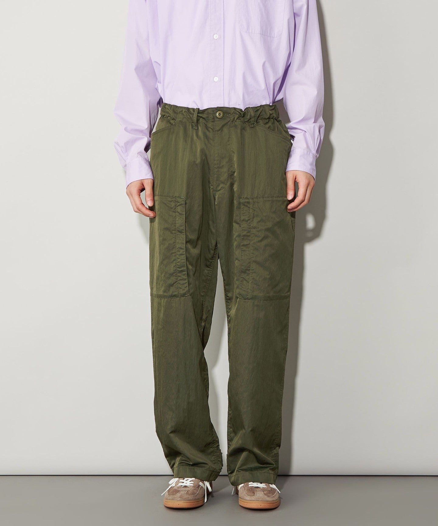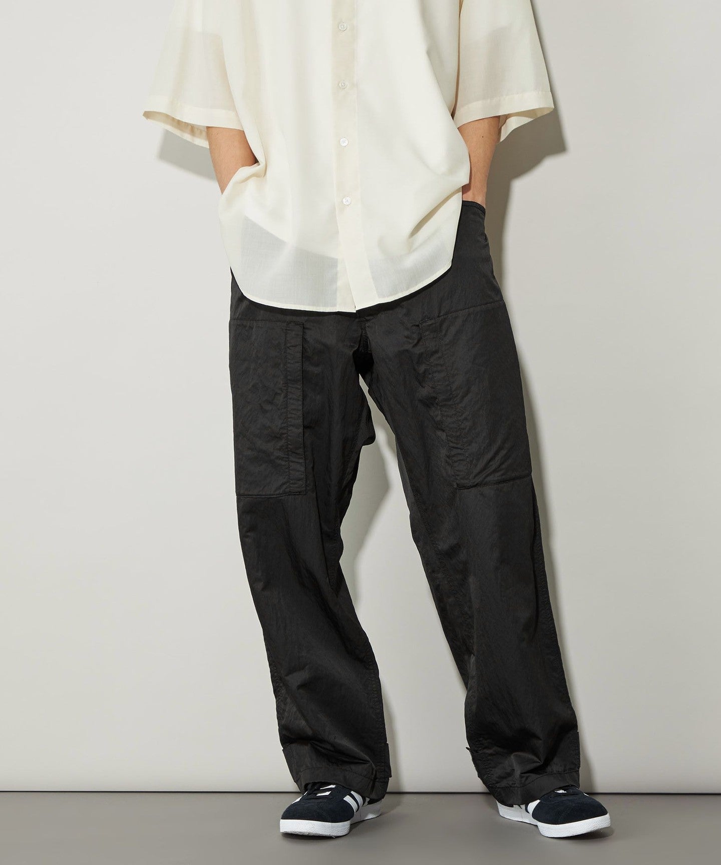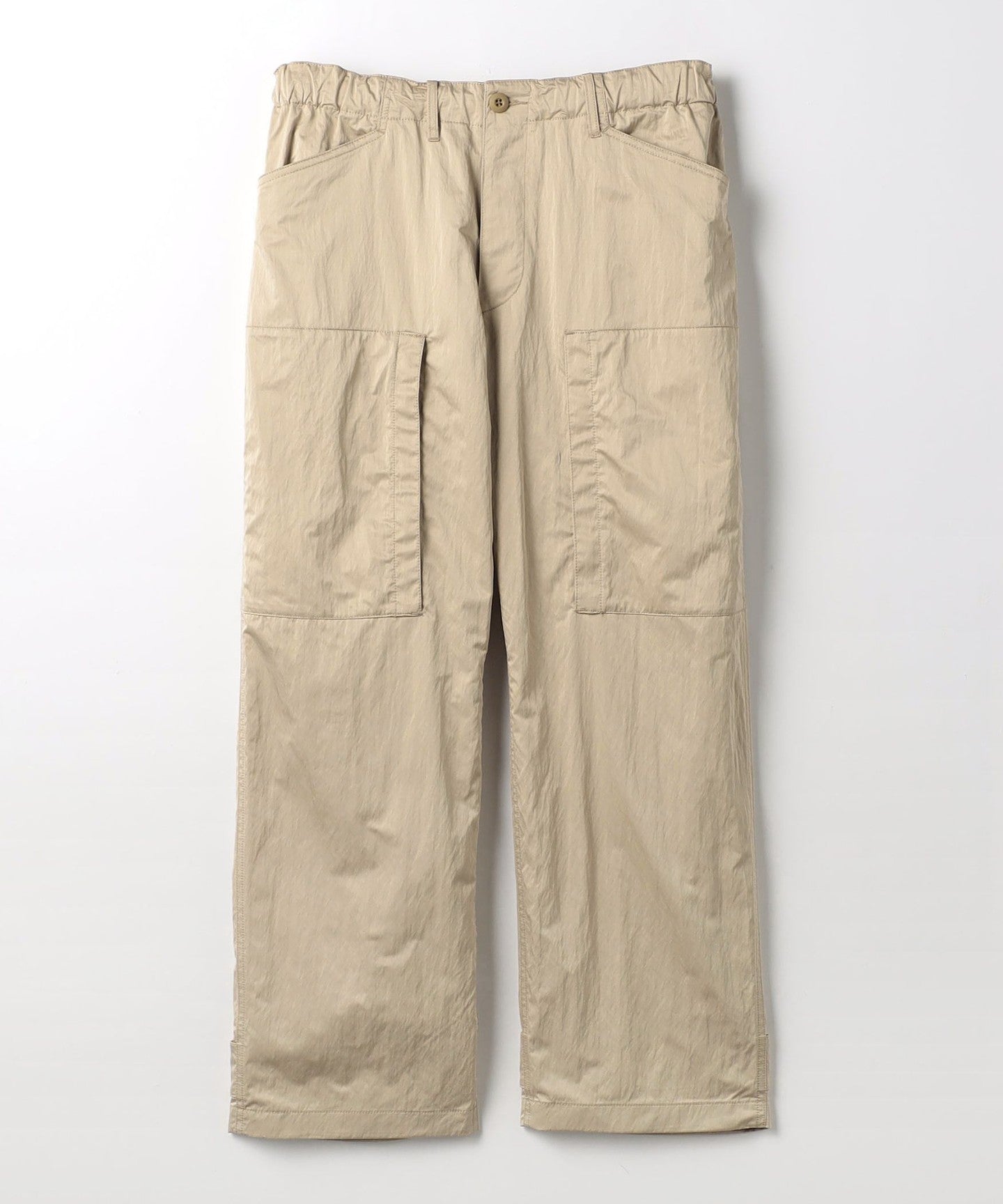These are casual cargo pants, but the beautiful texture of the material allows for a wide range of coordination options.