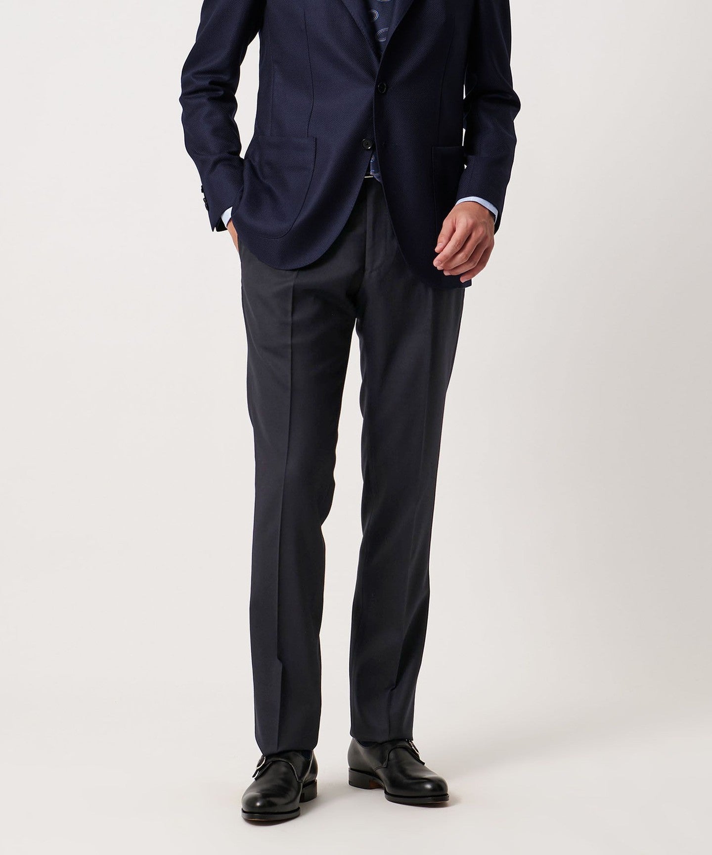 It has a slightly loose fit around the waist and a tapered silhouette that creates a sharp look.
