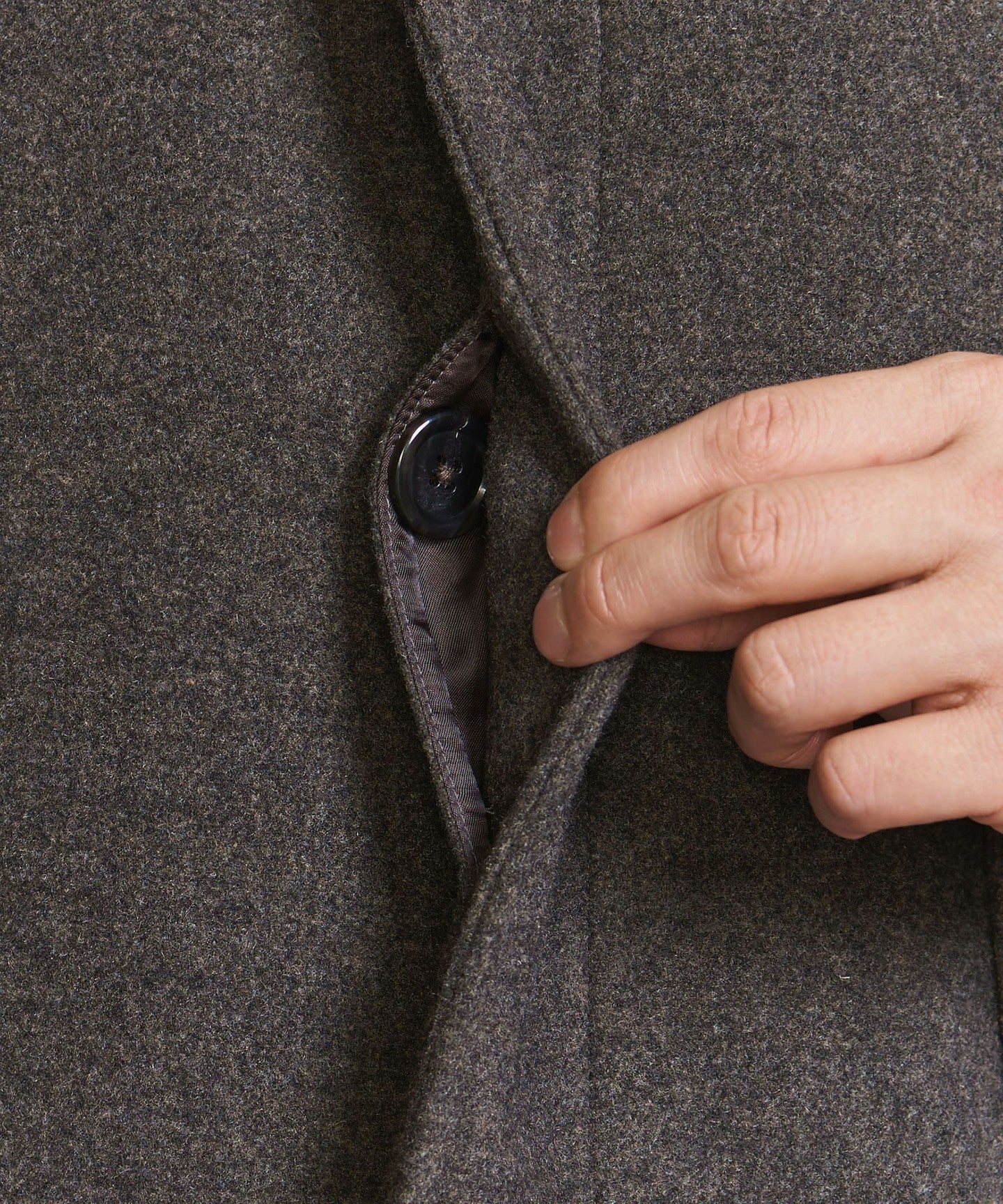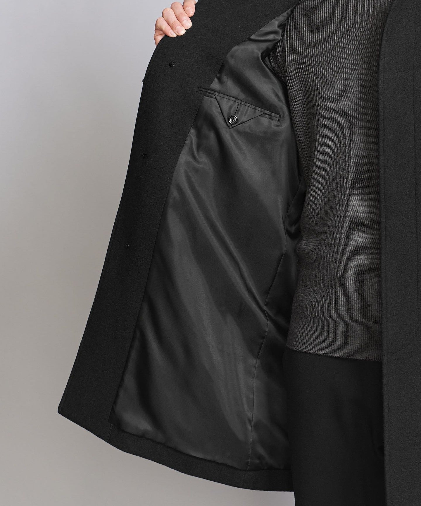 Modeled after a classic bal collar coat, the collar can be stood up and fastened with buttons, and the front has a simple, hidden placket.