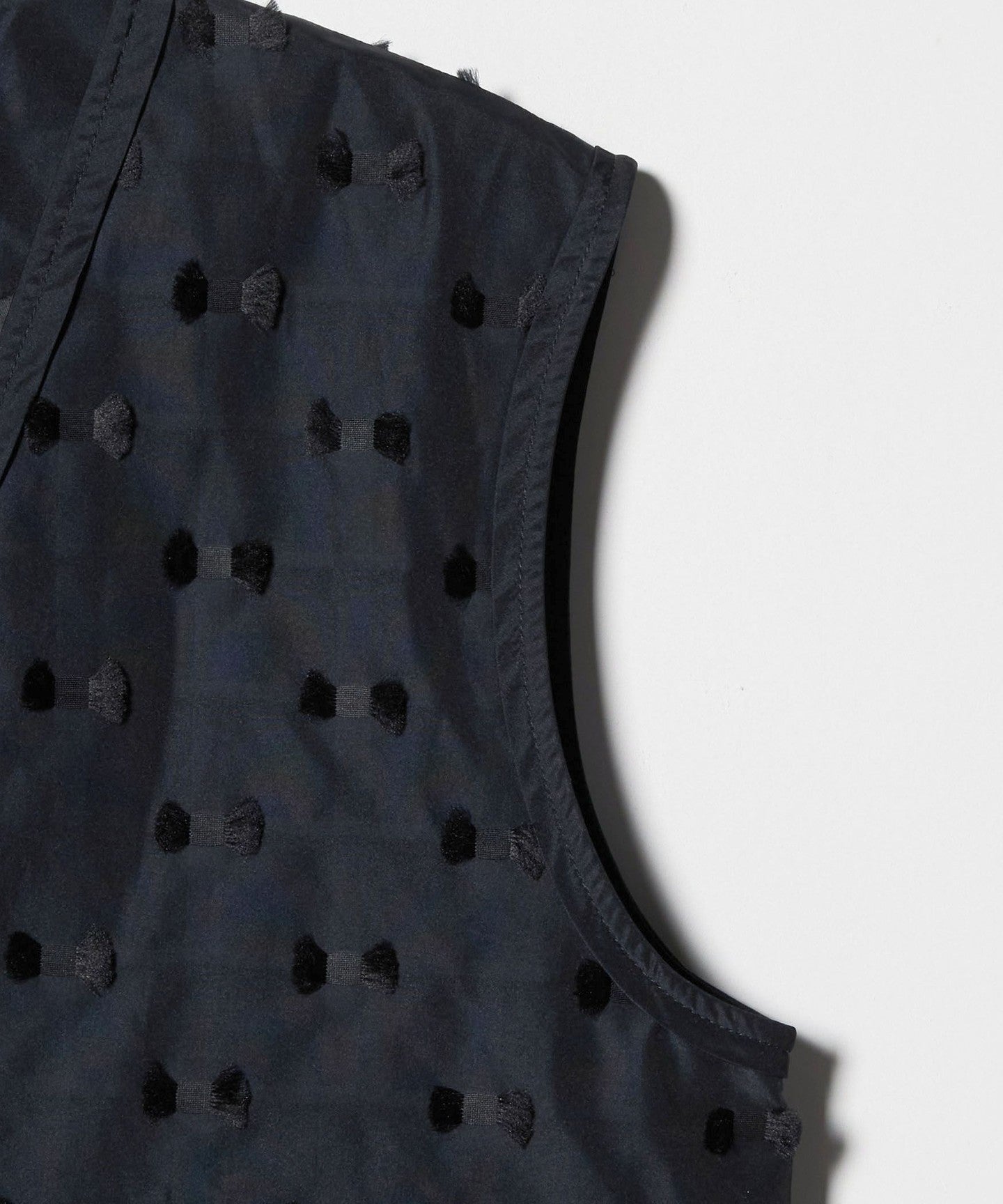 The neckline and armholes are piped with plain taffeta material made from the same yarn, giving it a lightweight finish.