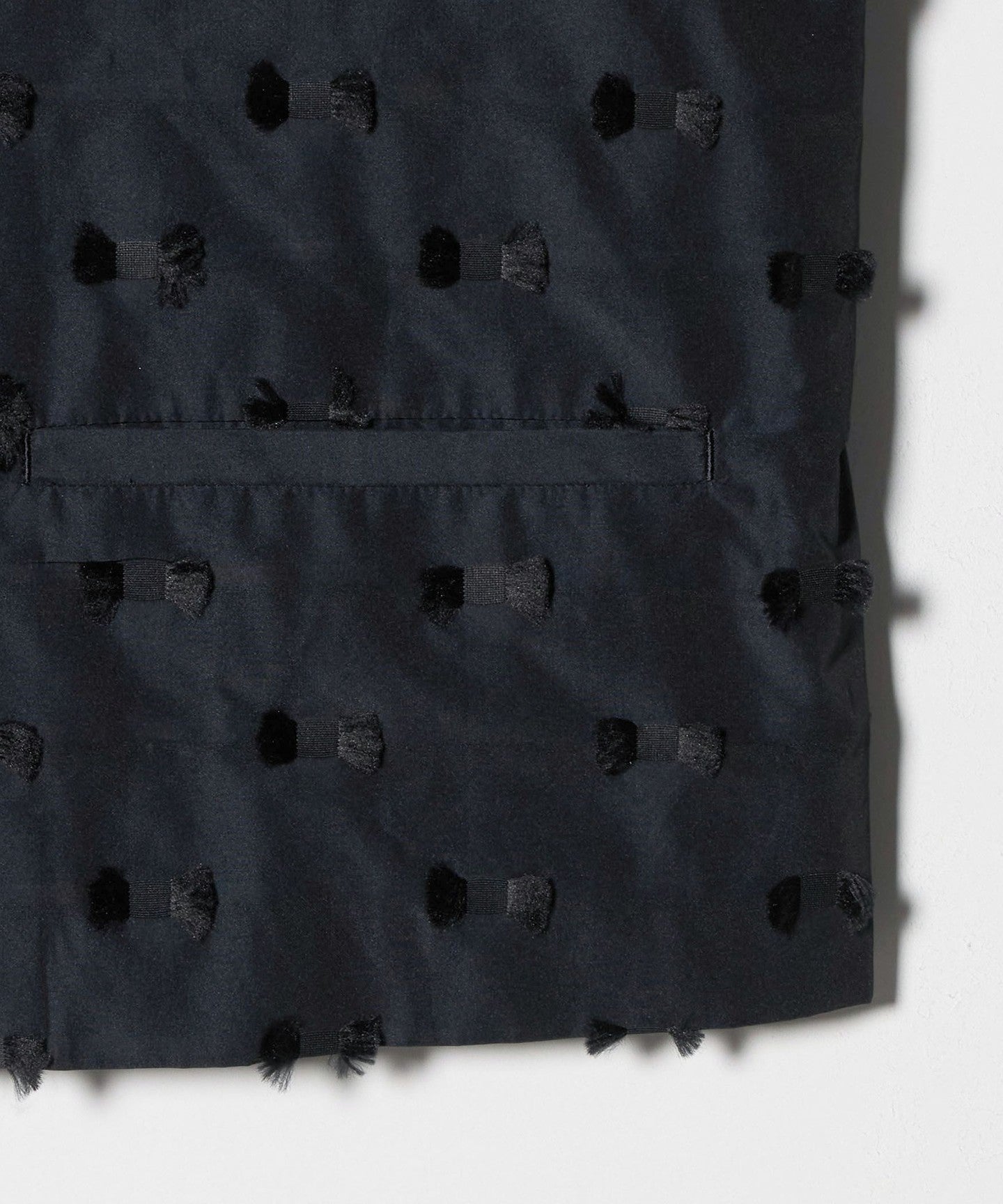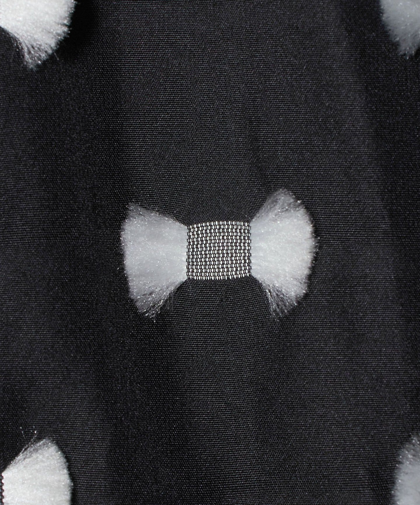 A cut jacquard material made by layering fluffy wooly yarn into microfiber polyester taffeta to create a three-dimensional ribbon shape.