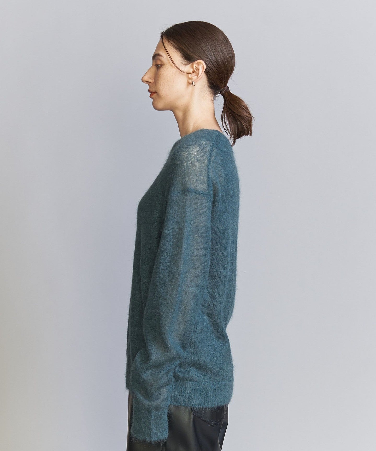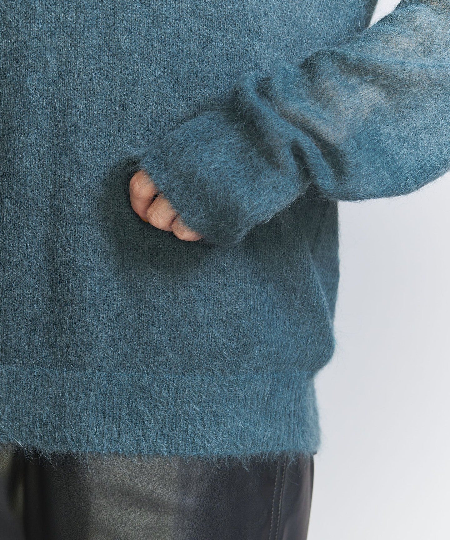A knit pullover with a delicate, sheer texture made from long, fluffy yarn.